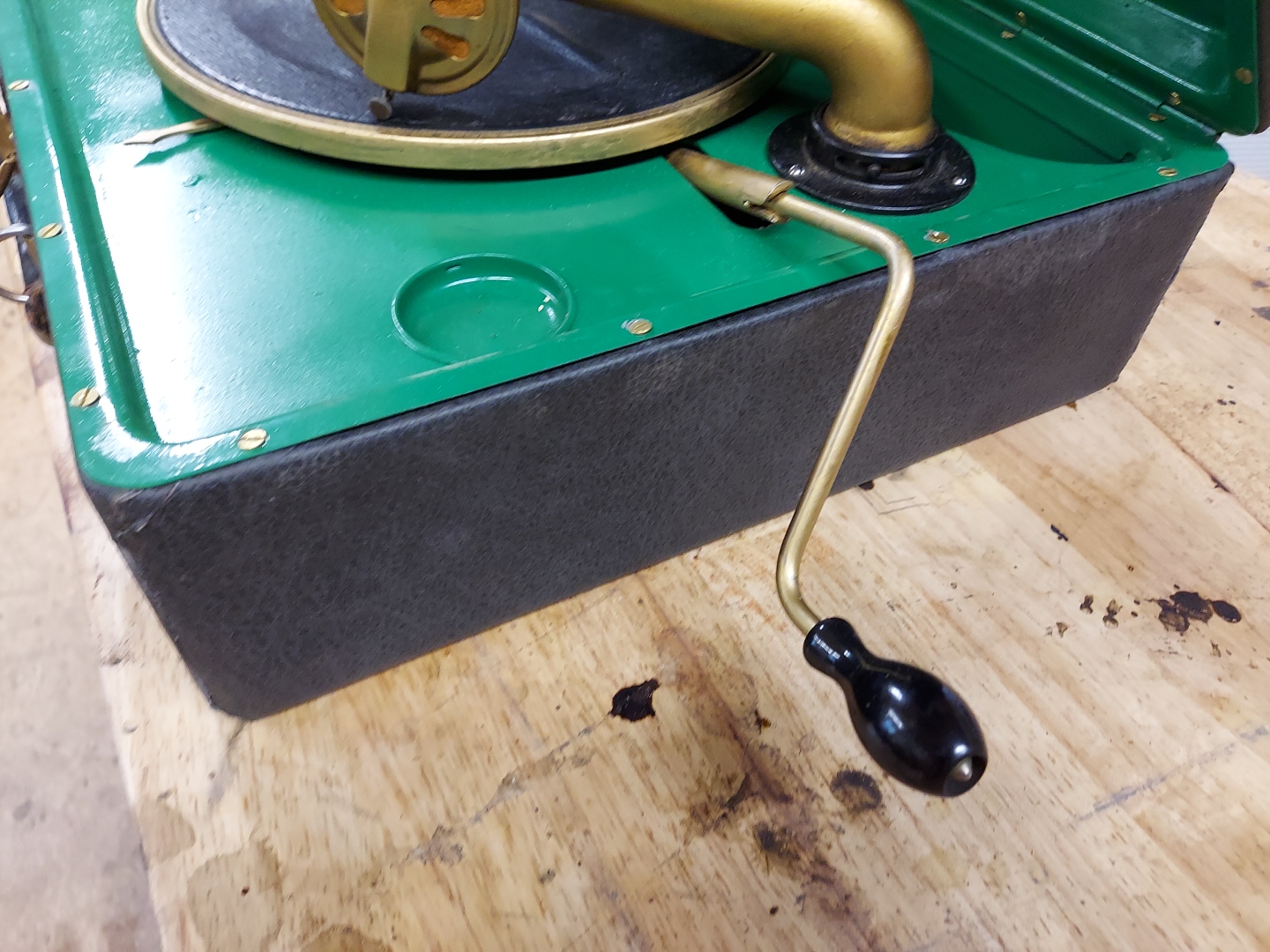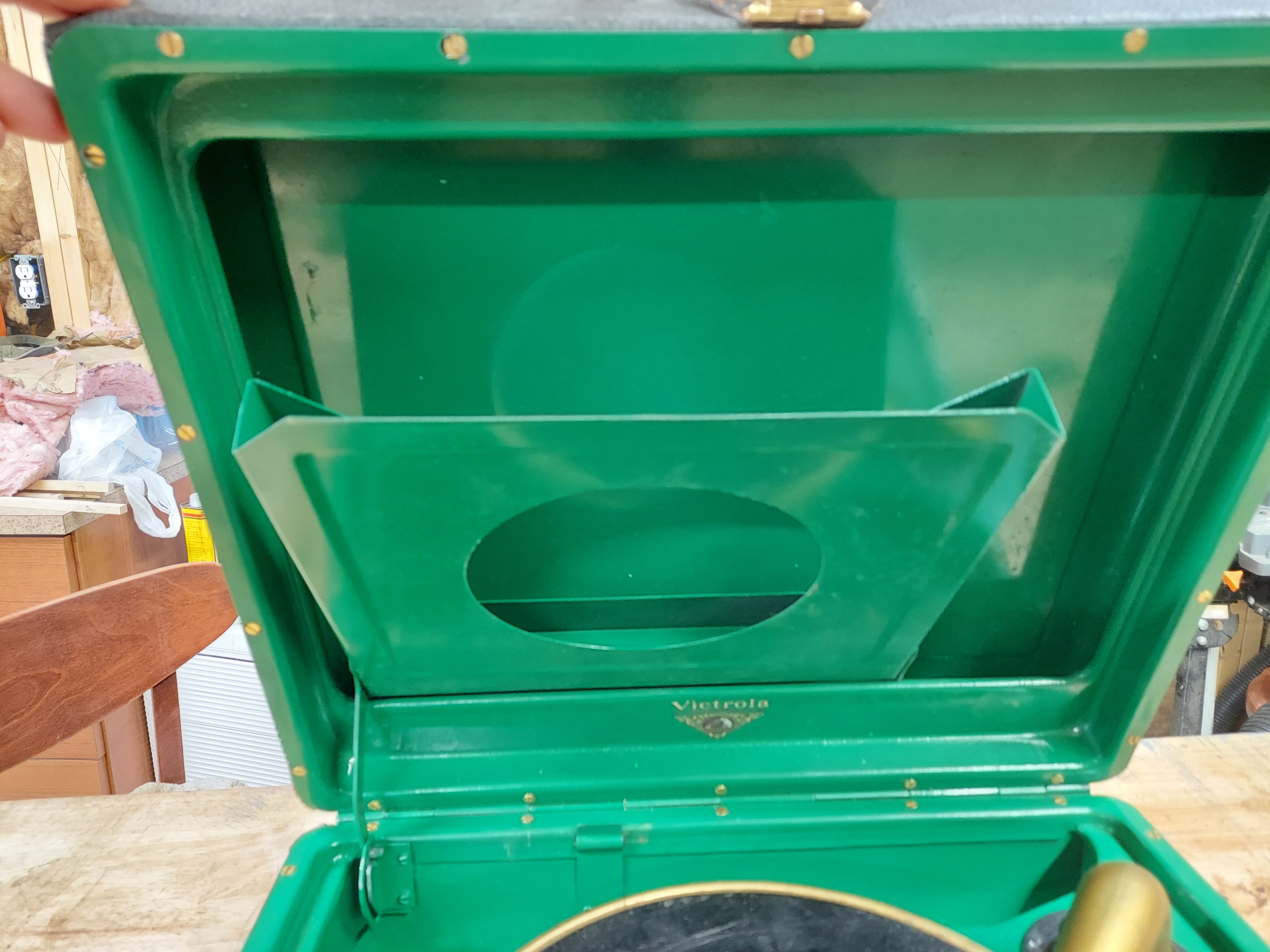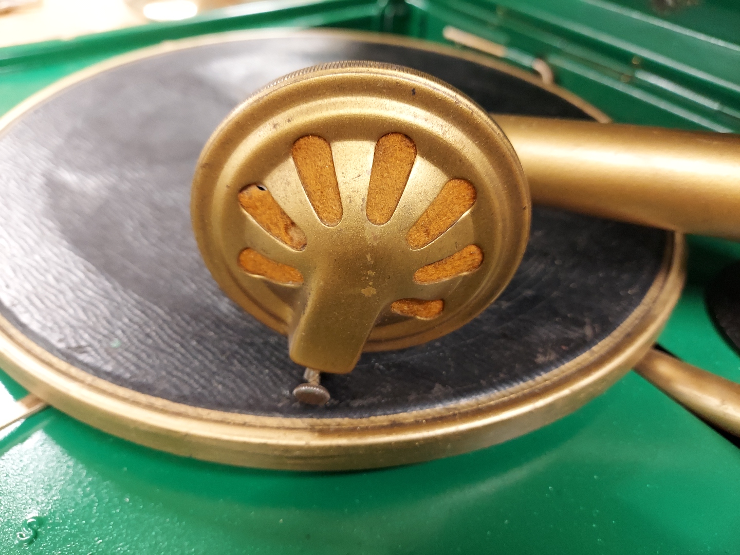 The second one was the HMV 16 which came with an early HMV 102 portable I acquired about 30 years ago. That one had a torn diaphragm. I successfully pried it apart, using a tiny sharpened screwdriver to peel back the edge of the overlapping sheet metal and impaling my hand in the process. I installed a replacement diaphragm, and reassembled it, using glue to hold everything together. It sounded and looked like ¢rap, so I replaced it with an HMV 5a.