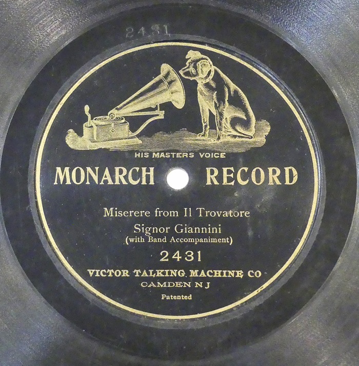 My copy of the Trovatore is beyond transferring; the first half inch or so of the record has so much groove damage it's unplayable, at least on a modern turntable. As best I could tell, it, too, seems to be recorded at around 76.5 RPM. It's an oddity in that it has Giannini singing the tenor's lines, which are not numerous and in the opera house would be sung offstage, while substituting a cornet or trumpet for the soprano, who, as the focus of the scene, has the bulk of the vocal text. Carlo Albani did the same peculiar thing in a Pathé recording.