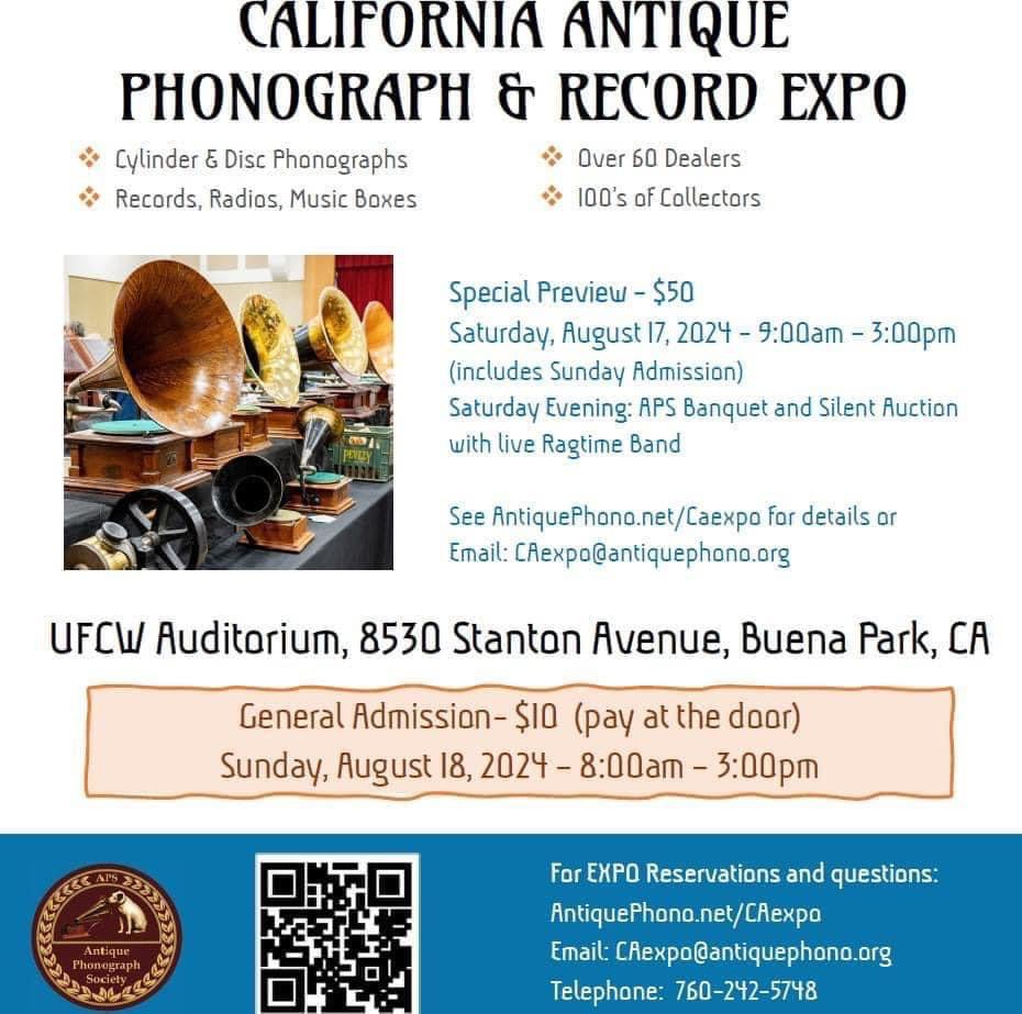 *This Coming Weekend!* Calling all collectors, audiophiles, history buffs, screenwriters, acoustic music lovers, sound engineers, musicians, and researchers. The Antique Phonograph and Record Expo in Buena Park, California is only a short time away. Come visit this annual event which attracts people from all corners of the globe, and immerse yourself for a day. You will certainly not regret attending this fun and interesting event, so stop on in!