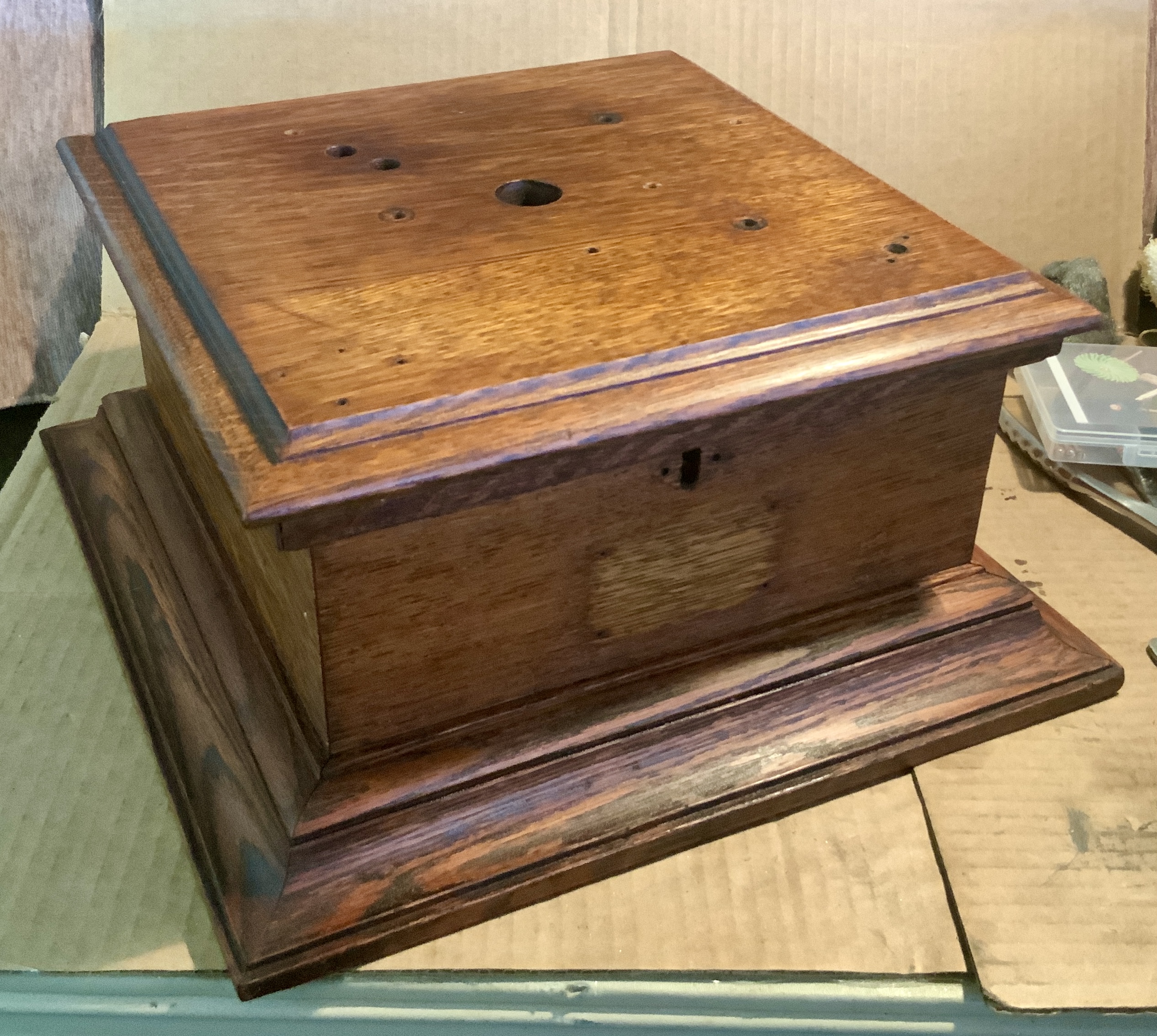 The cabinet is ready for a coat of paste wax and then I can reinstall the motor and all the hardware. I did get a beautiful rebuilt reproducer. And, I intend to rebuild the original one, the parts are here. The table it will sit on is rebuilt now. It had to be completely disassembled and is being refinished. It was in quite sad shape. The table is glued up and waiting for finish.
