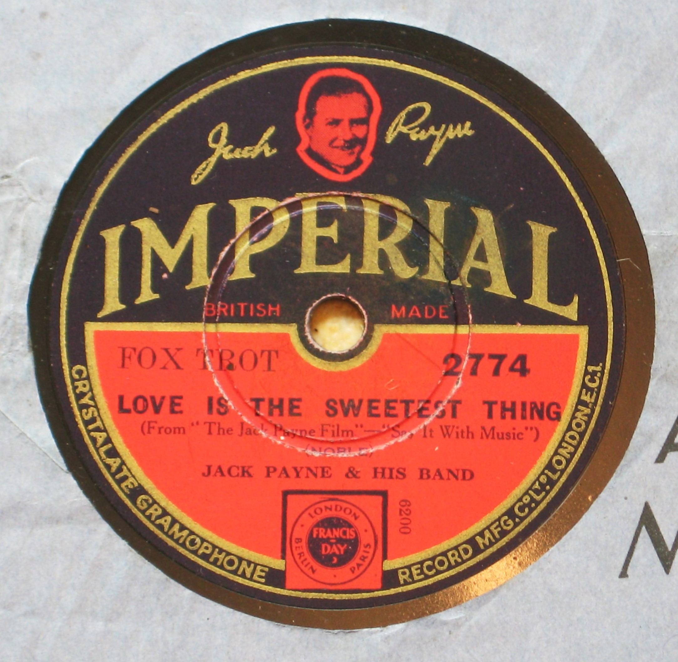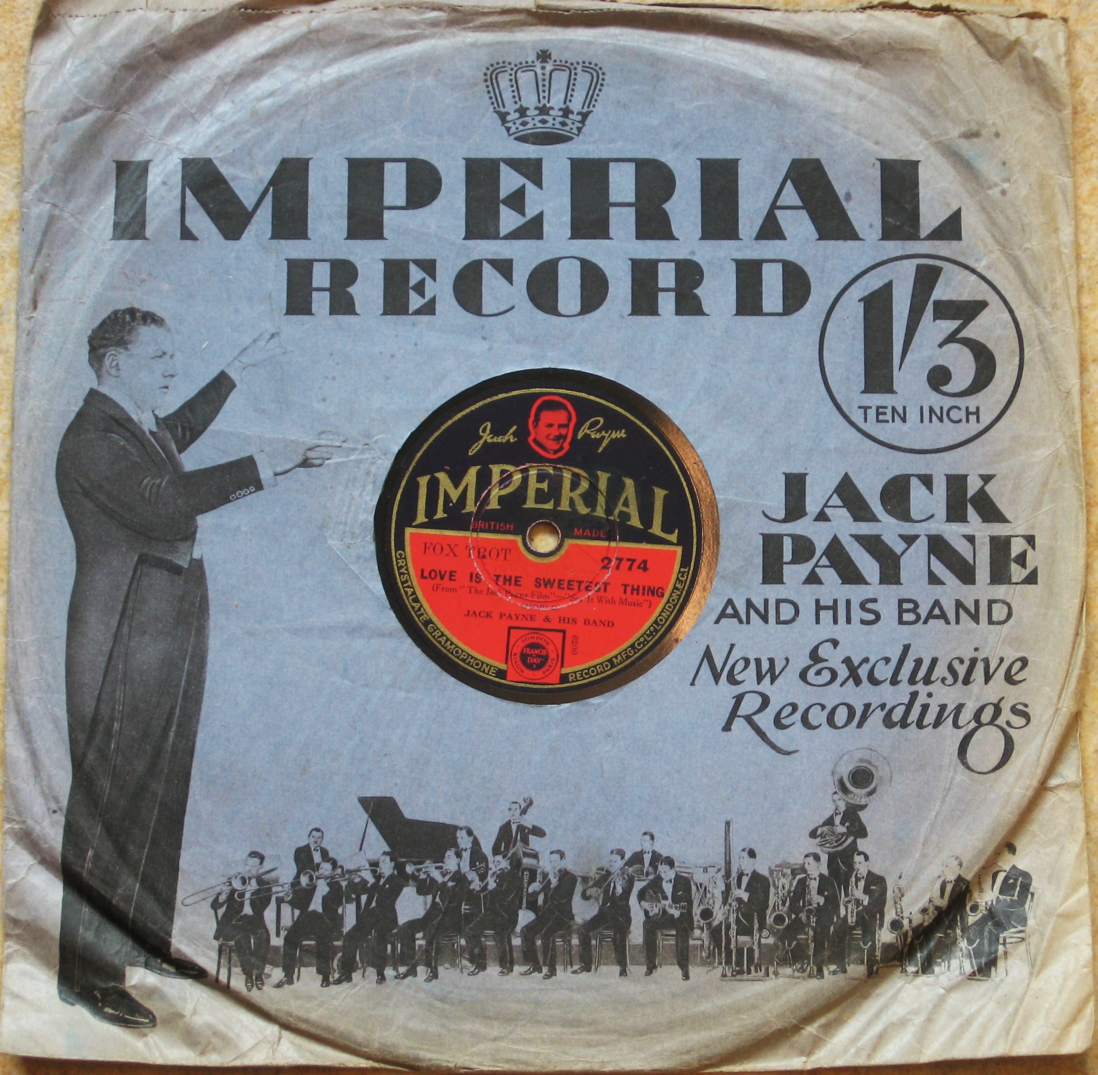 Jack Payne is also on the little advertisement records that Imperial issued, with an abbreviated version of his theme song on one side and him talking on the other. I have a couple of these, they come in little card boxes and are cute with their little sleeves: a nice contrast to the 50 cm Pathés. The one made by Gramophone to the queen's doll house is even smaller, but when they show up for sale the price is so high that I never had the appetite to buy one.