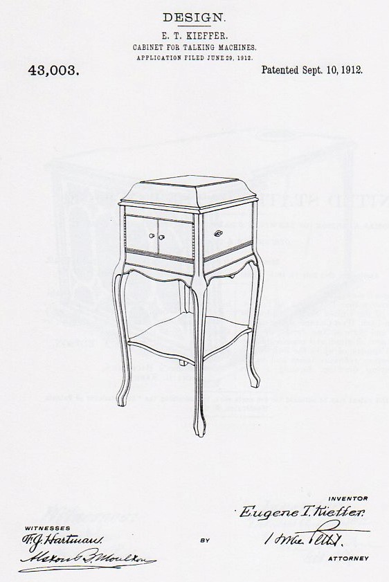 September 10, 1912: Eugene Kieffer was granted U.S. Design Patent No. 43,006) for “Cabinet for Talking Machines.” This was the updated cabinet for the Victrola XVI.
