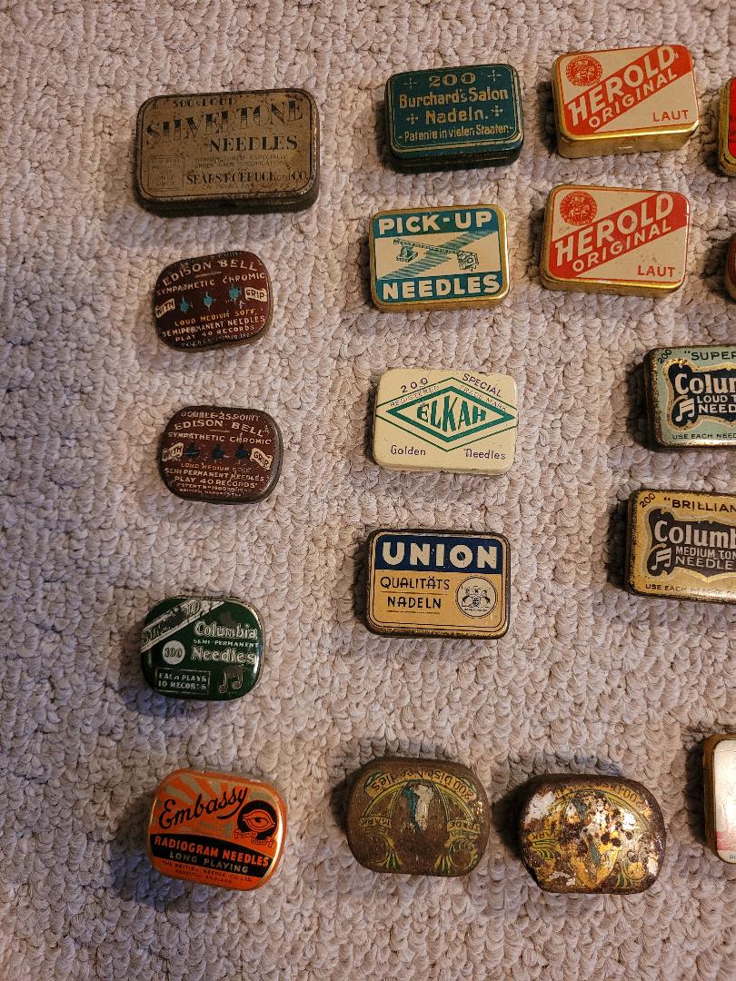 I'm going to be selling a lot of things but 1st up is this set of needle tins. 28 metal tins and 3 paper/cardboard ones thrown in for good measure. There are some Columbia's, Edison Bell's and other off brands. Pictures show their condition.