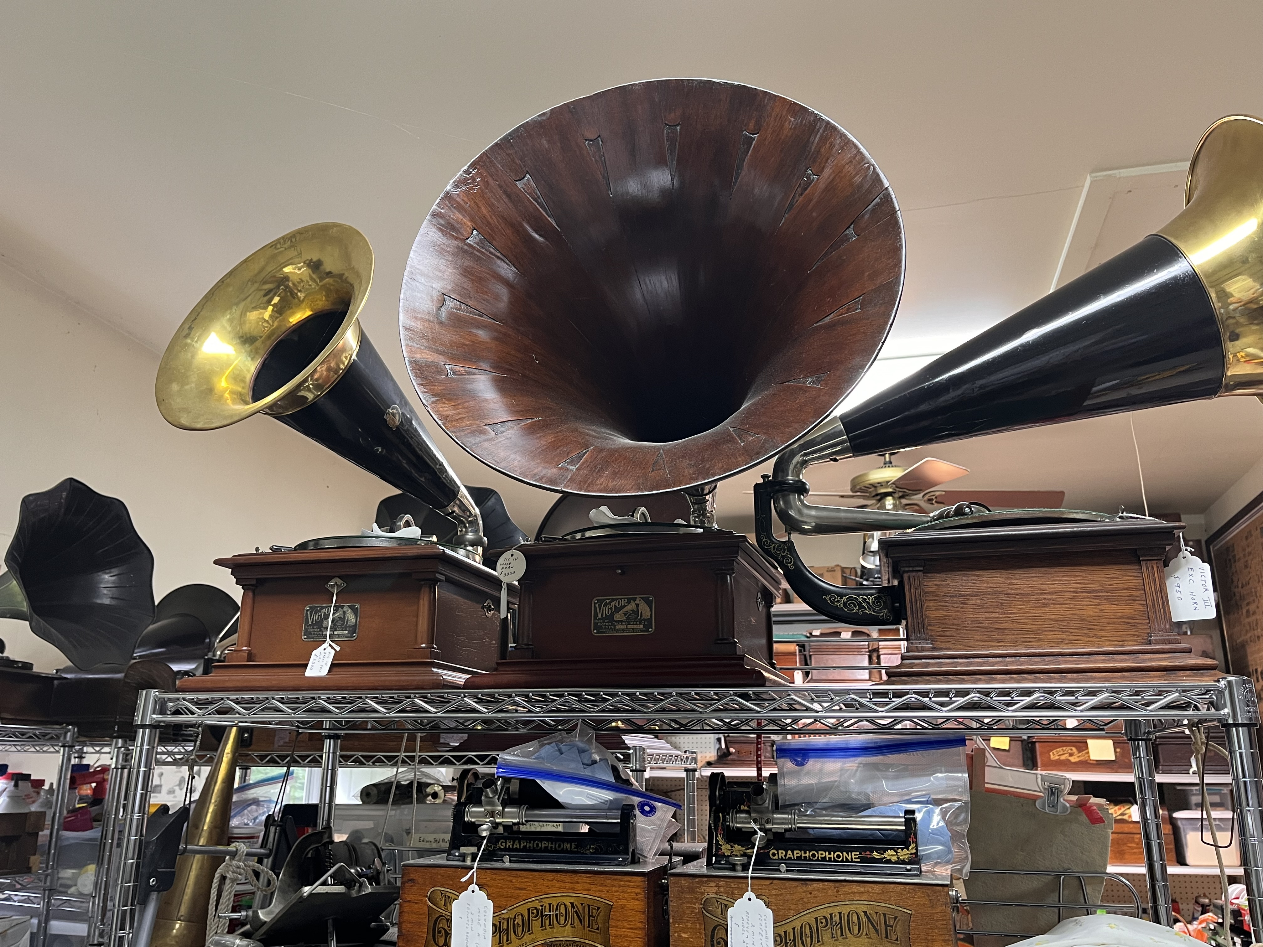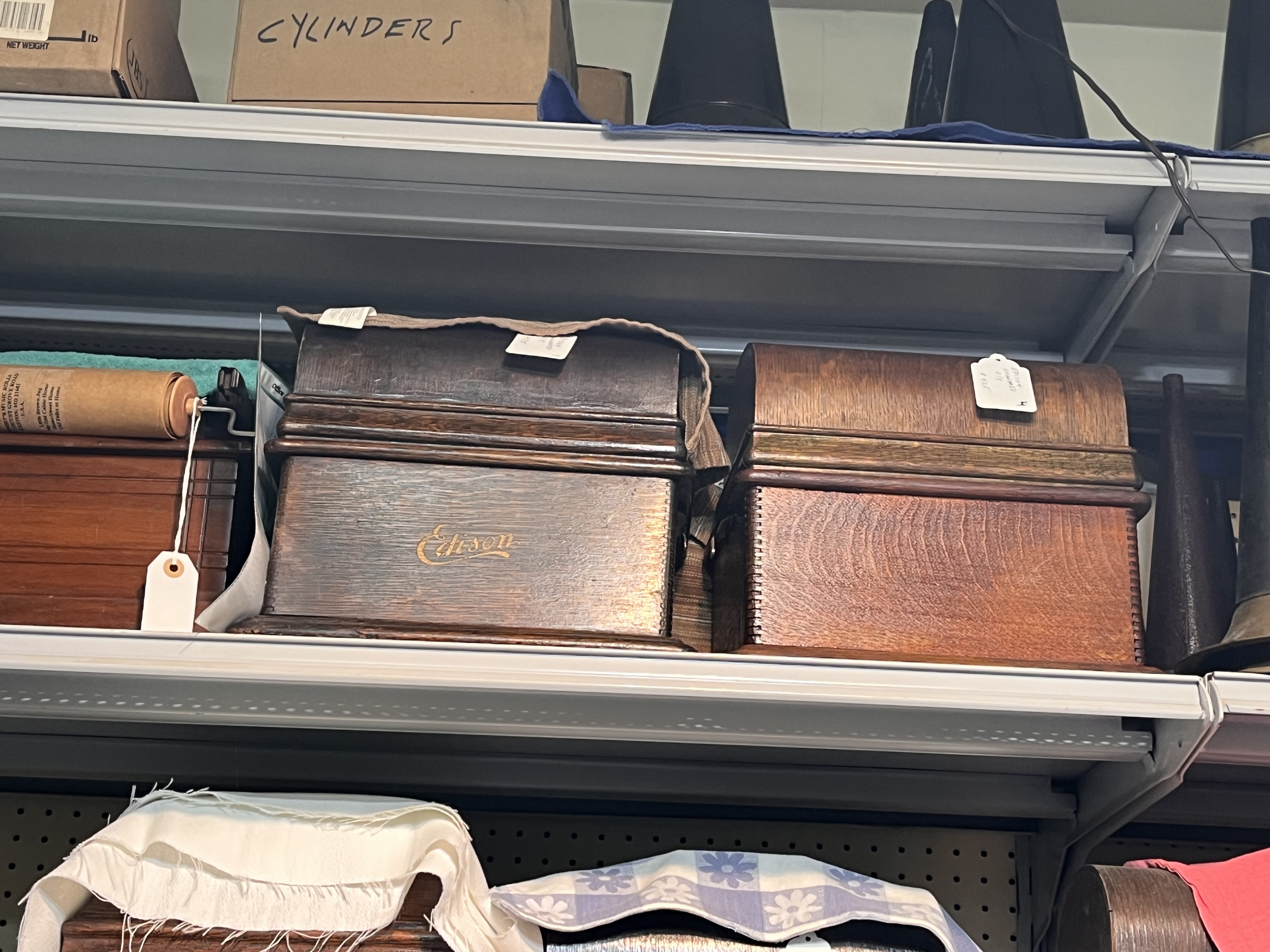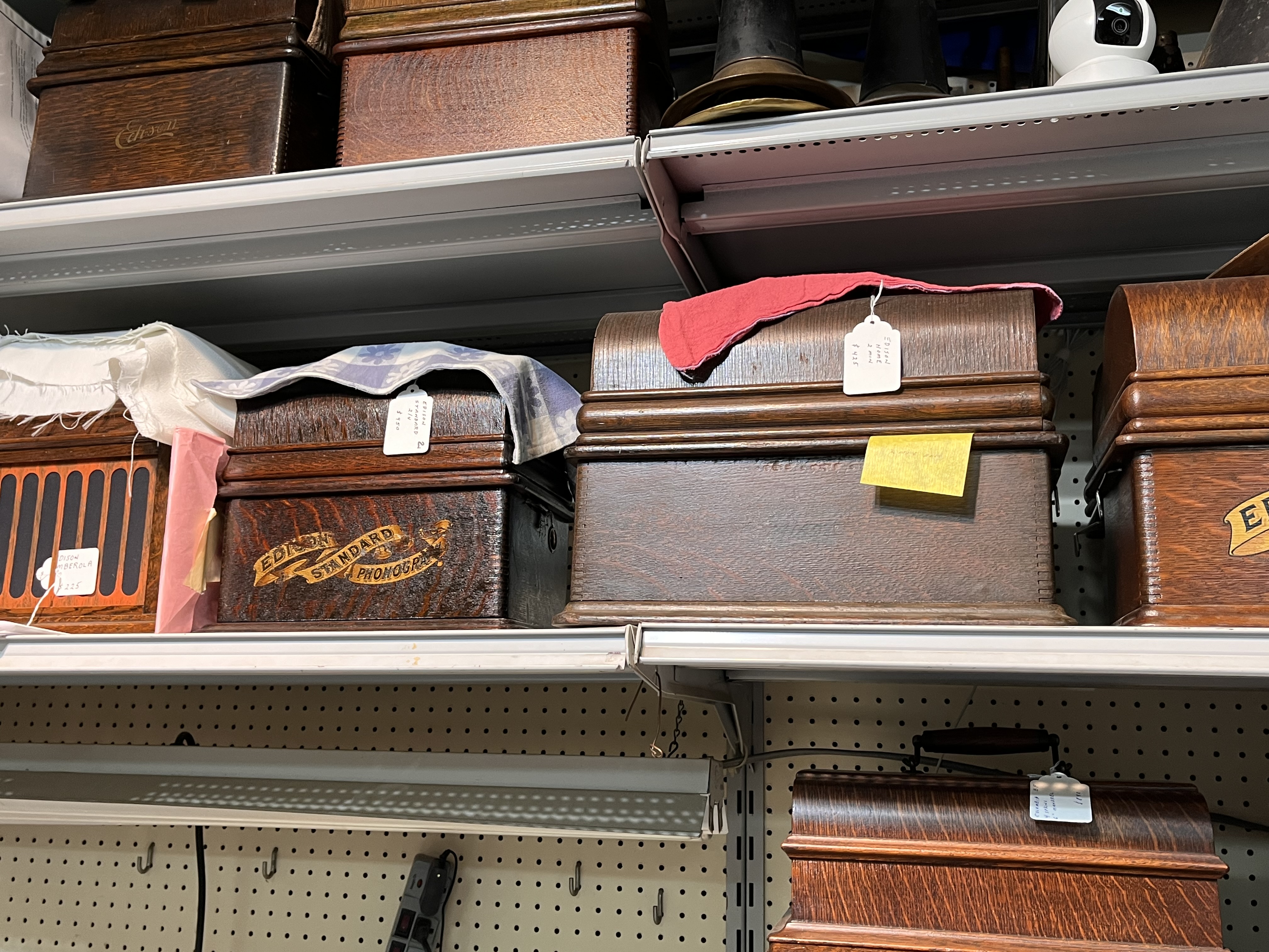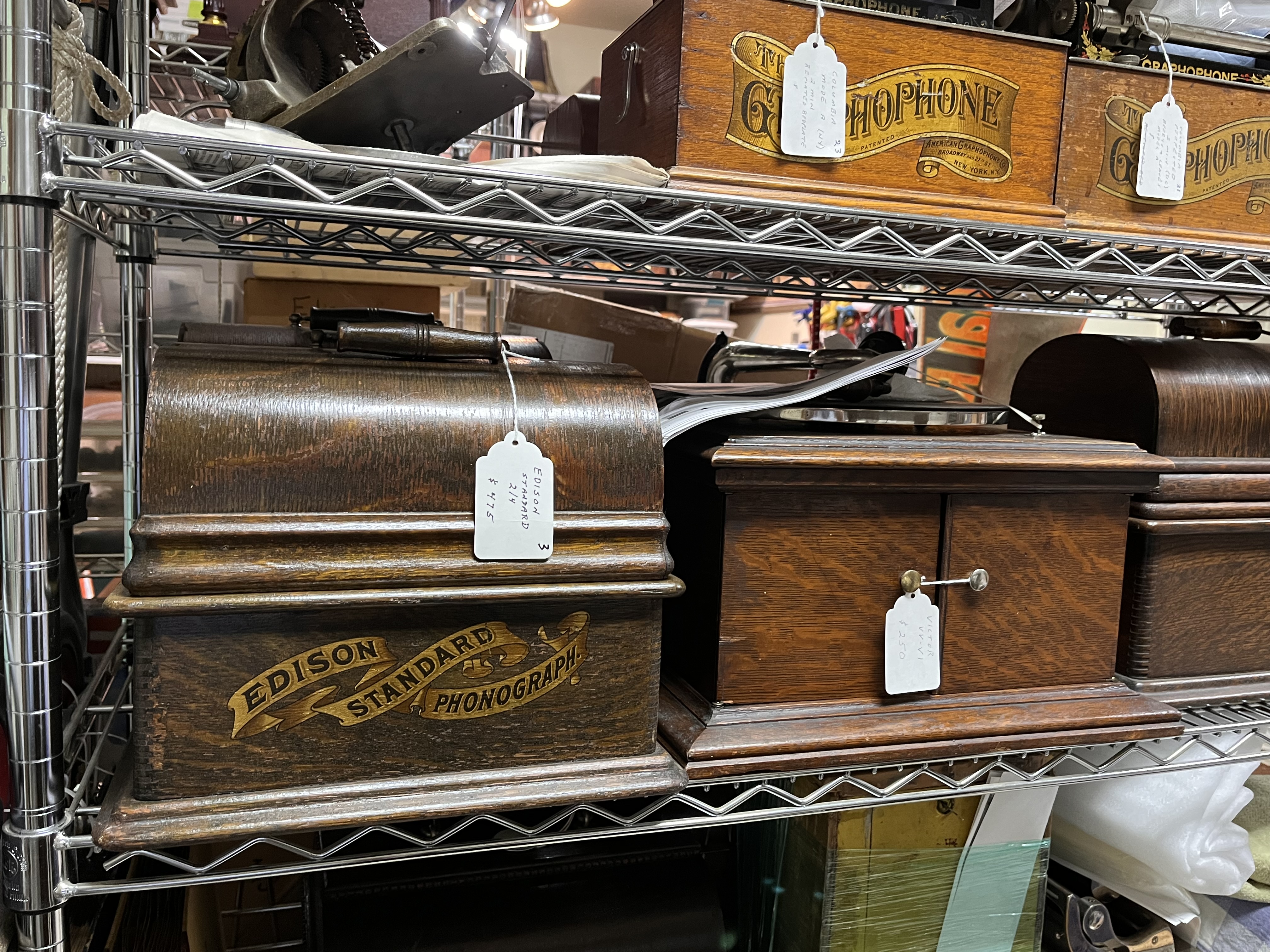 Some of these are quite rare. There is a very early Home sn. 884 with carriage rest and weighted feedscrew, an Edison Ajax, a treadle Columbia shaver, a Columbia AB McDonald, an Edison Concert with both concert and standard mandrels, carriages and reproducers, an excellent Victor VI, a bow front cylinder cabinet, and others.