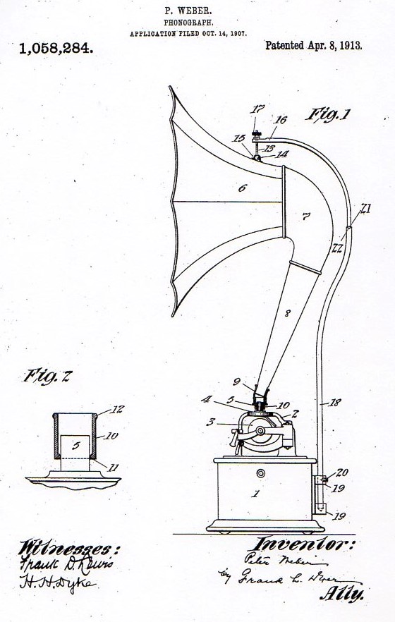 October 14, 1907: Peter Weber filed for a U.S. Design Patent (eventually granted as No.1,058,284) on “Phonograph.” This would become (in slightly refined form) the Edison Cygnet horn.