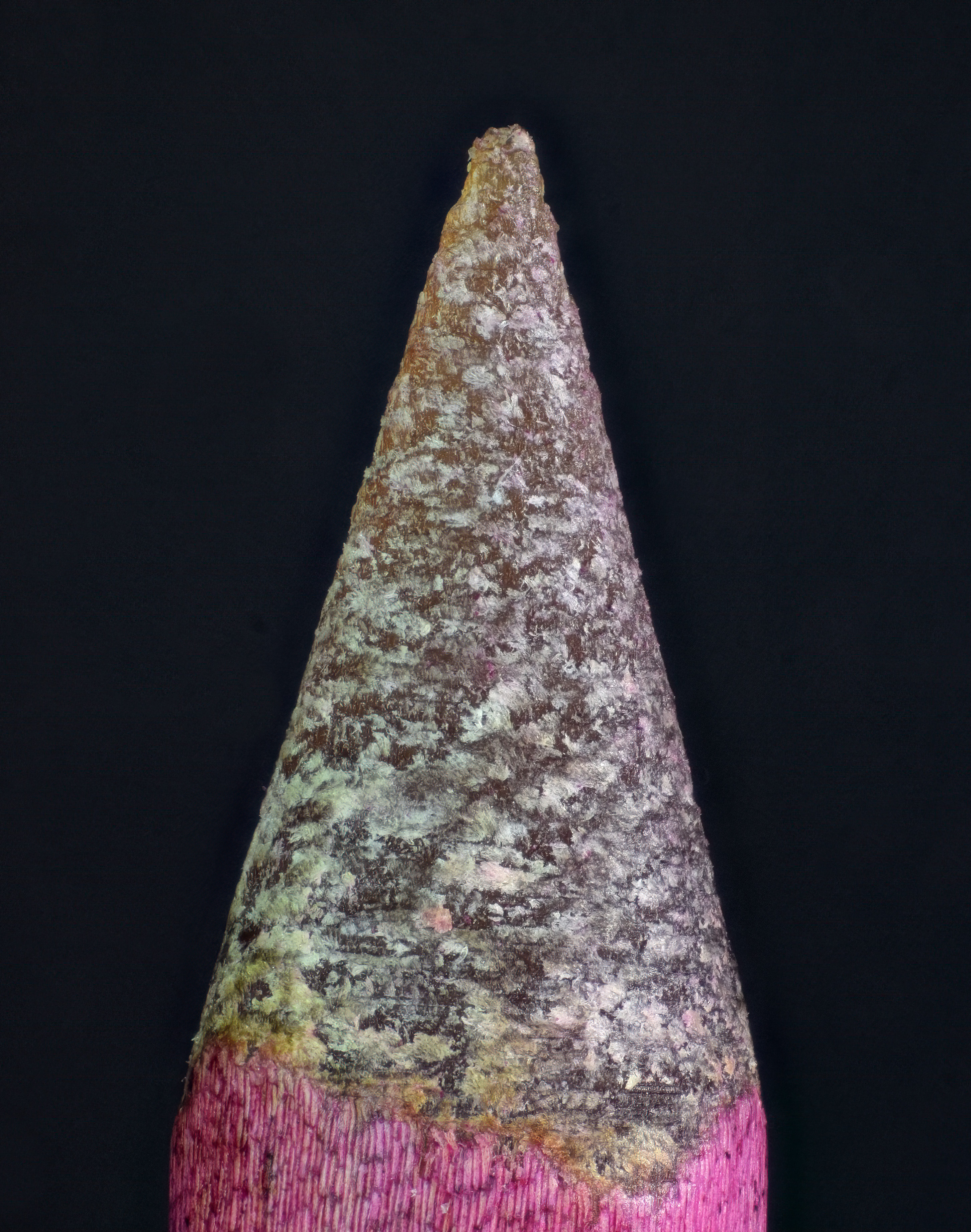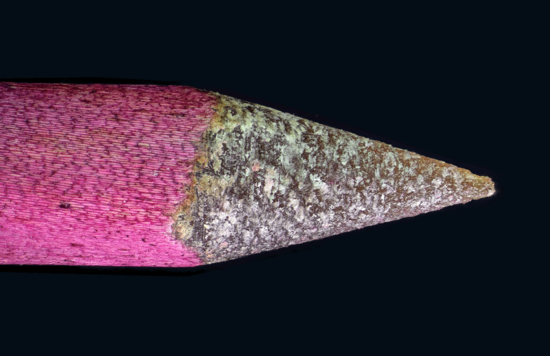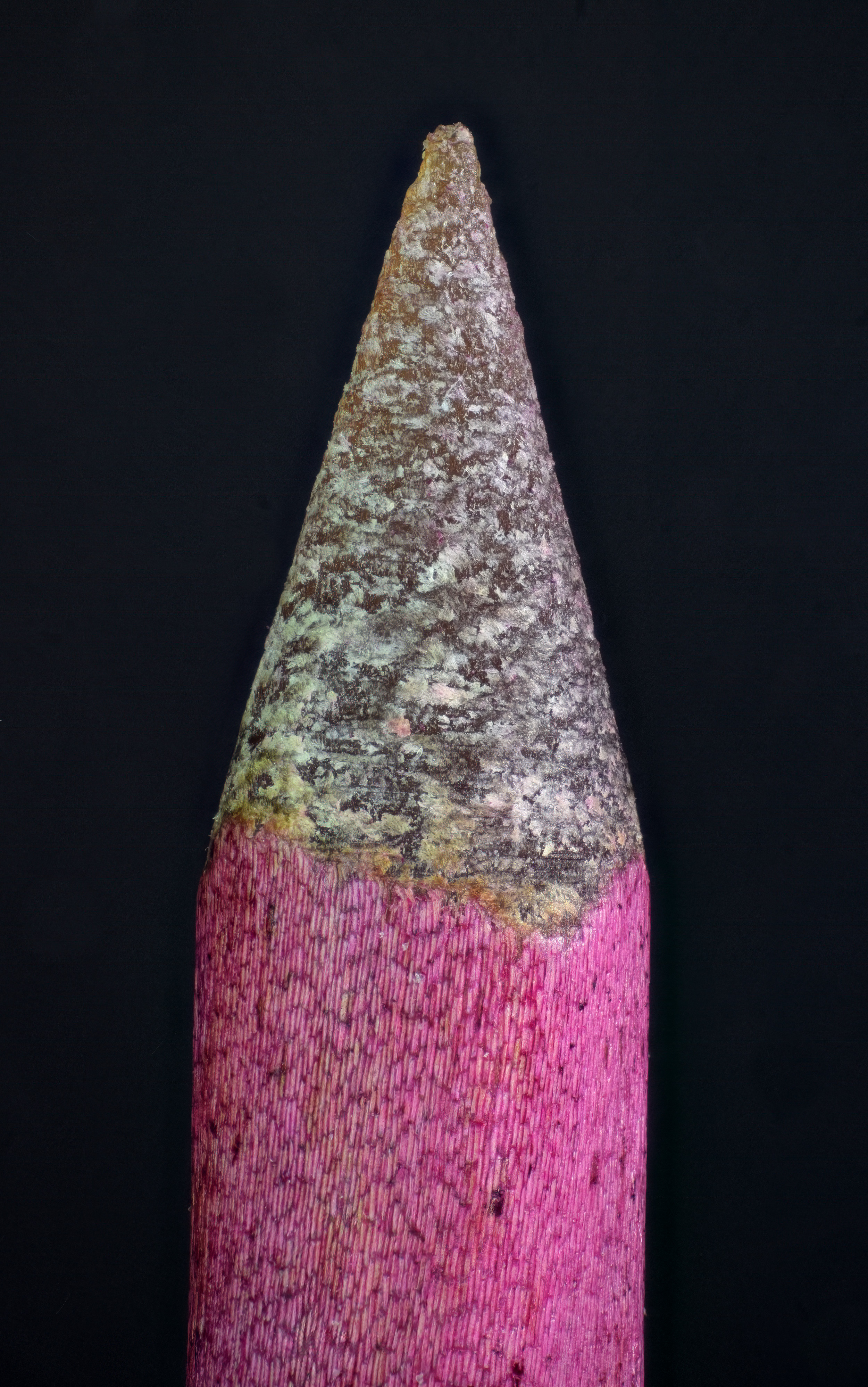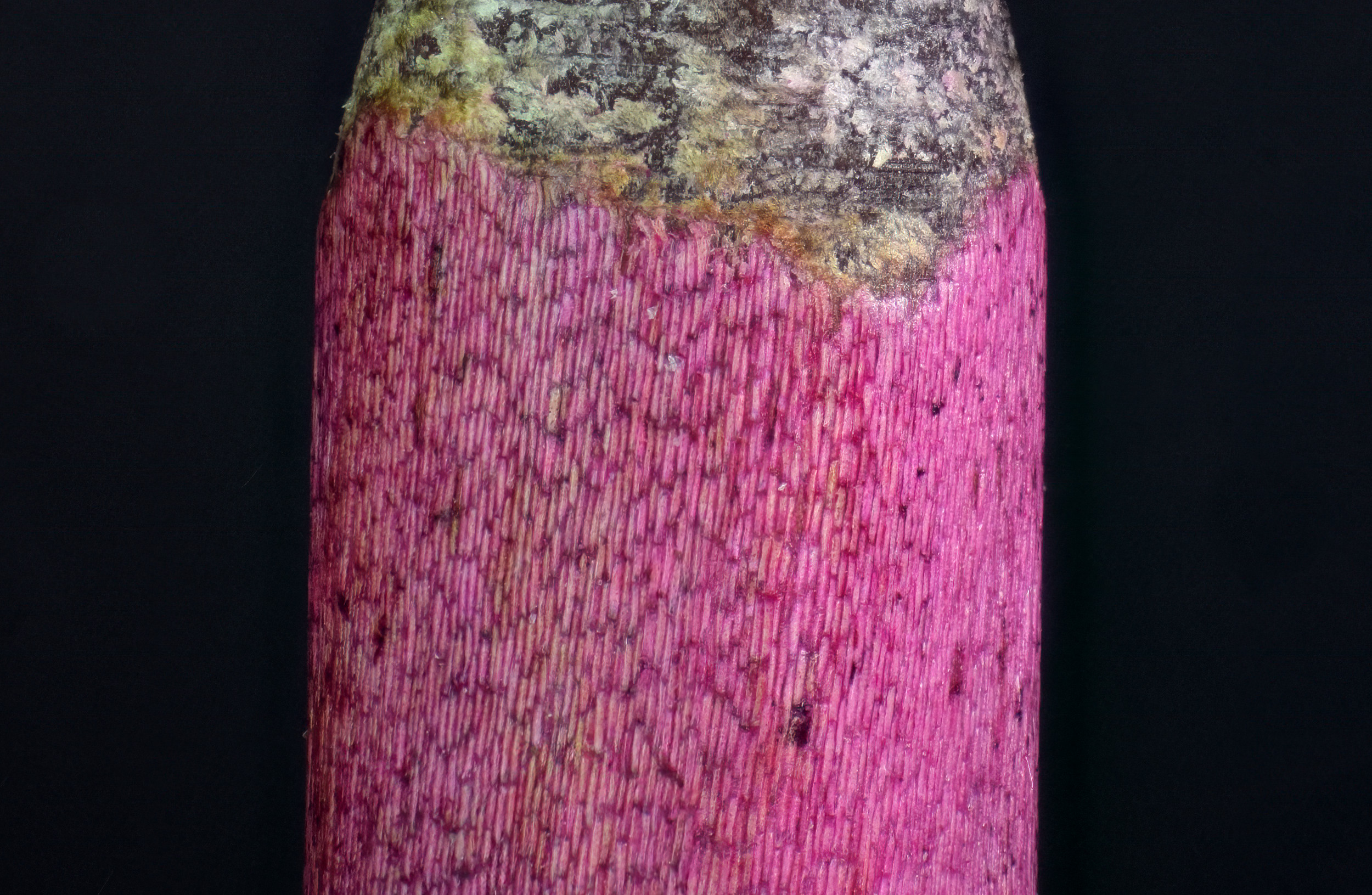 The close up, and crop, of the needle surface was captured with a higher magnification objective, and is a stack of 87 images. The higher magnification objective isn't really optimal for this kind of photo-microscopy, but it's still fascinating to see detail in the individual cells.