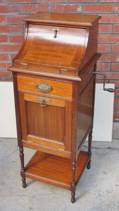 I wonder if anyone knows anything more about the maker of this ‘Windsor Orchestral’? It’s a rather extraordinary cabinet machine that has appeared on eBay. It would have had an external horn and back bracket, presumably similar to a regular horn machine, but the tonearm would feed through the aperture at the back of the cabinet. The horn elbow probably had an extension piece to raise the height of the horn above the cabinet.