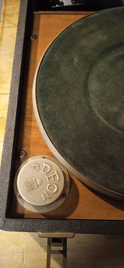 I tried to dig the internet a bit to return some information, but couldn't find anything similar to your machine. Actually, I don't even know if the soundbox really matches the gramophone, and frankly I don't even understand if the whole machine was indeed built by Odeon, or if the needle case alone carries the make.