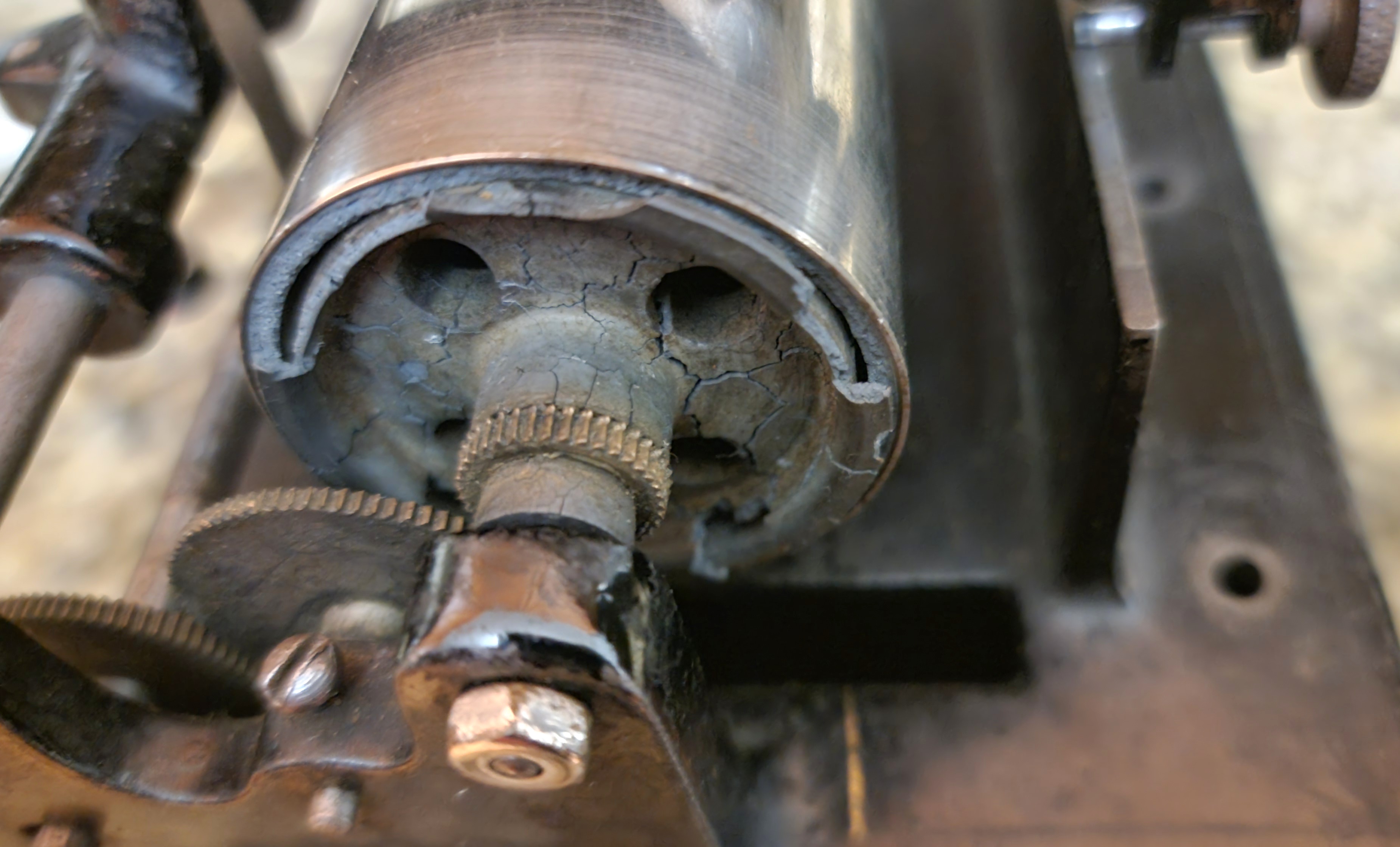 Jerry, the inside pieces were just laying around on the wood base and I am sure there are several pieces missing. See attached photo. Also, see the photo of the end of cylinder. I would like to know of someone who could restore it to working condition.
