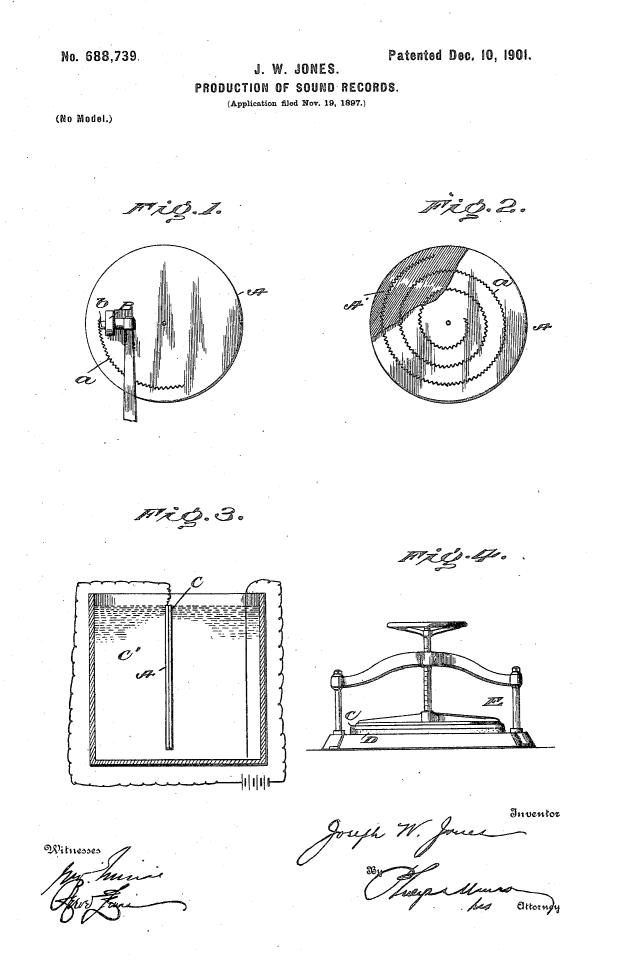 November 19, 1897: Joseph W. Jones filed for a U.S. patent for “Production of Sound Records.” Young Jones, working in Berliner’s recording laboratory, observed (or surmised) the advantages of recording in wax rather than acid etching, and proceeded to claim the process as his own. When the patent was finally granted 4 years later, it opened the door for Columbia to enter the disc market, while putting the new Victor Talking Machine Company in serious jeopardy.