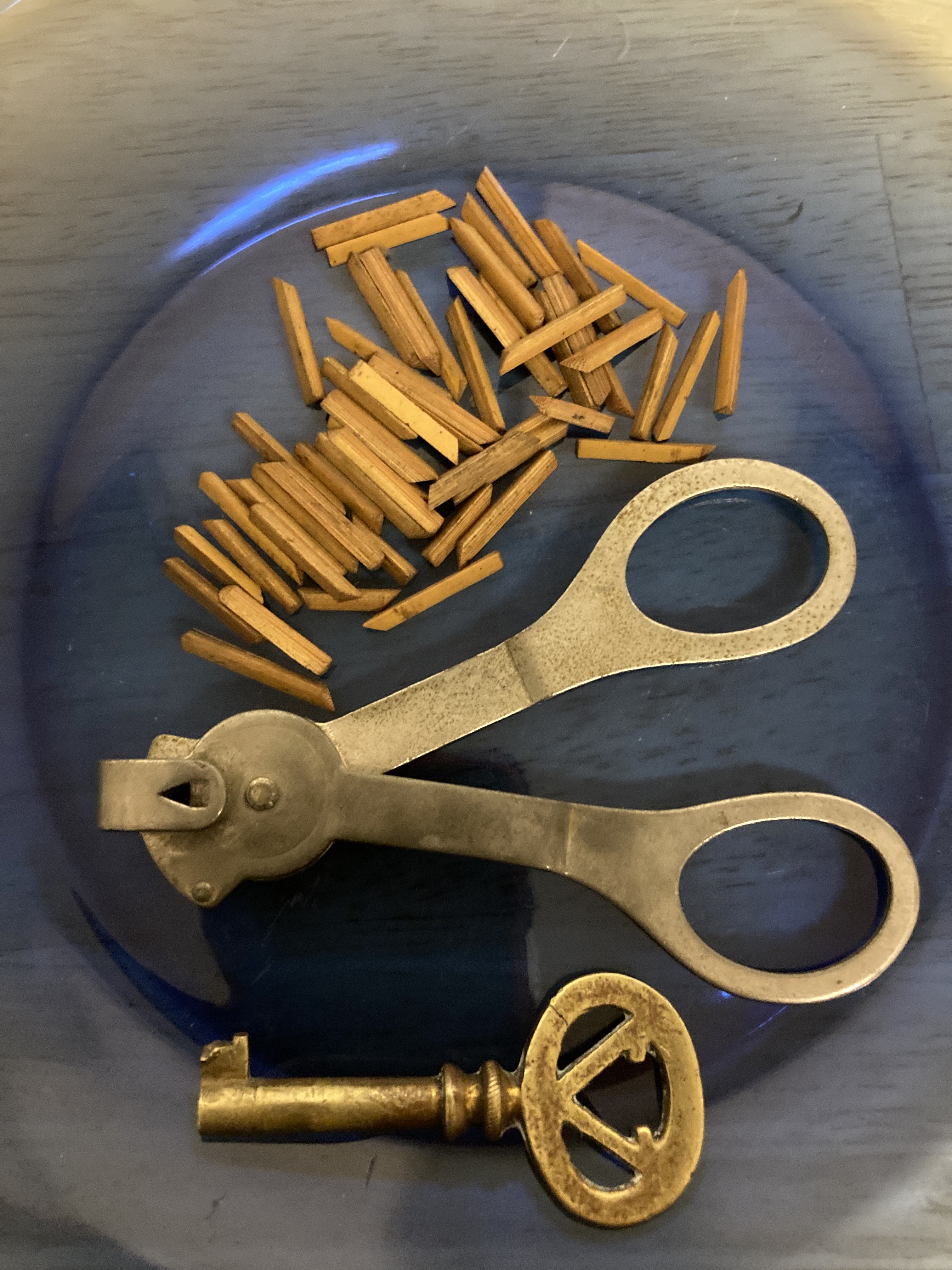 Note the key has a tiny piece missing from its tooth that effects functionality so it is more a cosmetic piece than has functional utility. Fibre Needle cutter works fine. Blade cuts fibre needles.
