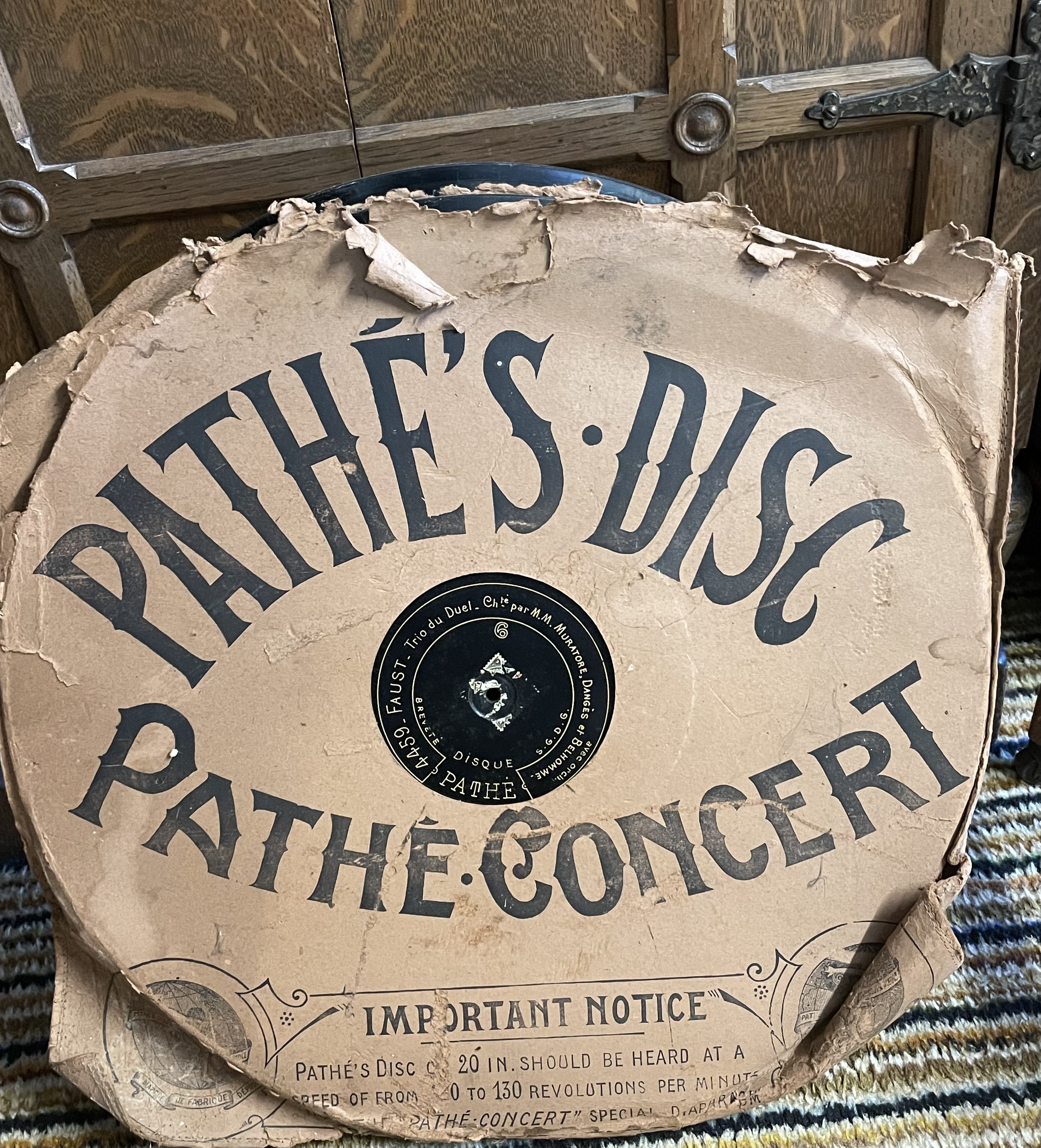These rare 20" Pathé records are collectable, rare and expensive, but you don't likely find a machine that can hold them to be played... Some Pathé gramophones can play them, but not all. Intended to provide a large sound volume for public restaurants etc.