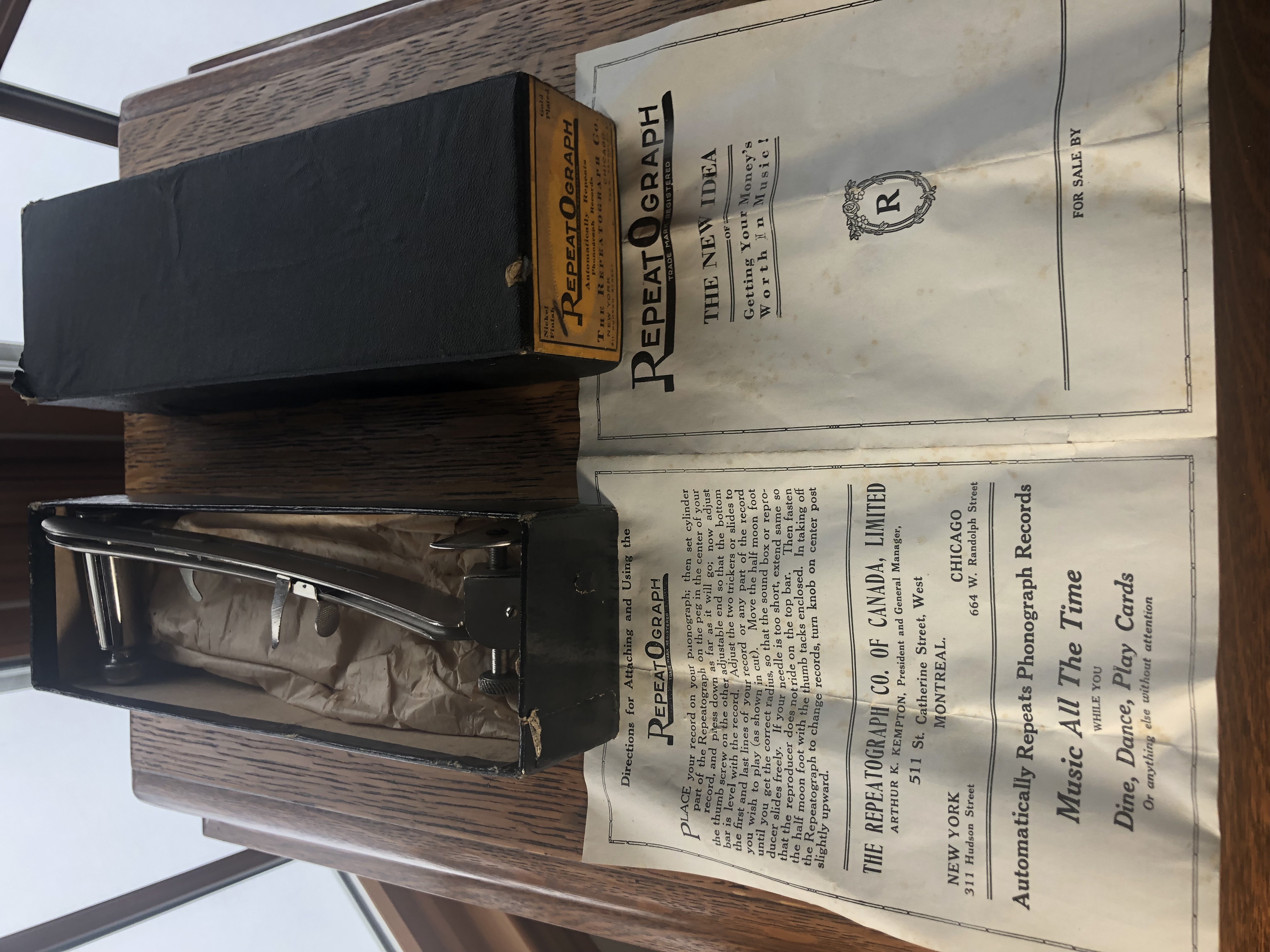 This NOS repeater with box and instructions was acquired decades ago with many dealer stock 1920's 78's. It has never been on any phonograph so it is waiting to go on yours. Nickle plating is as it left the factory over 100 years ago. Original box is wrinkled and worn in places yet totally presentable. Original instruction sheet included. Spindle bearing rotates freely. $225.00.