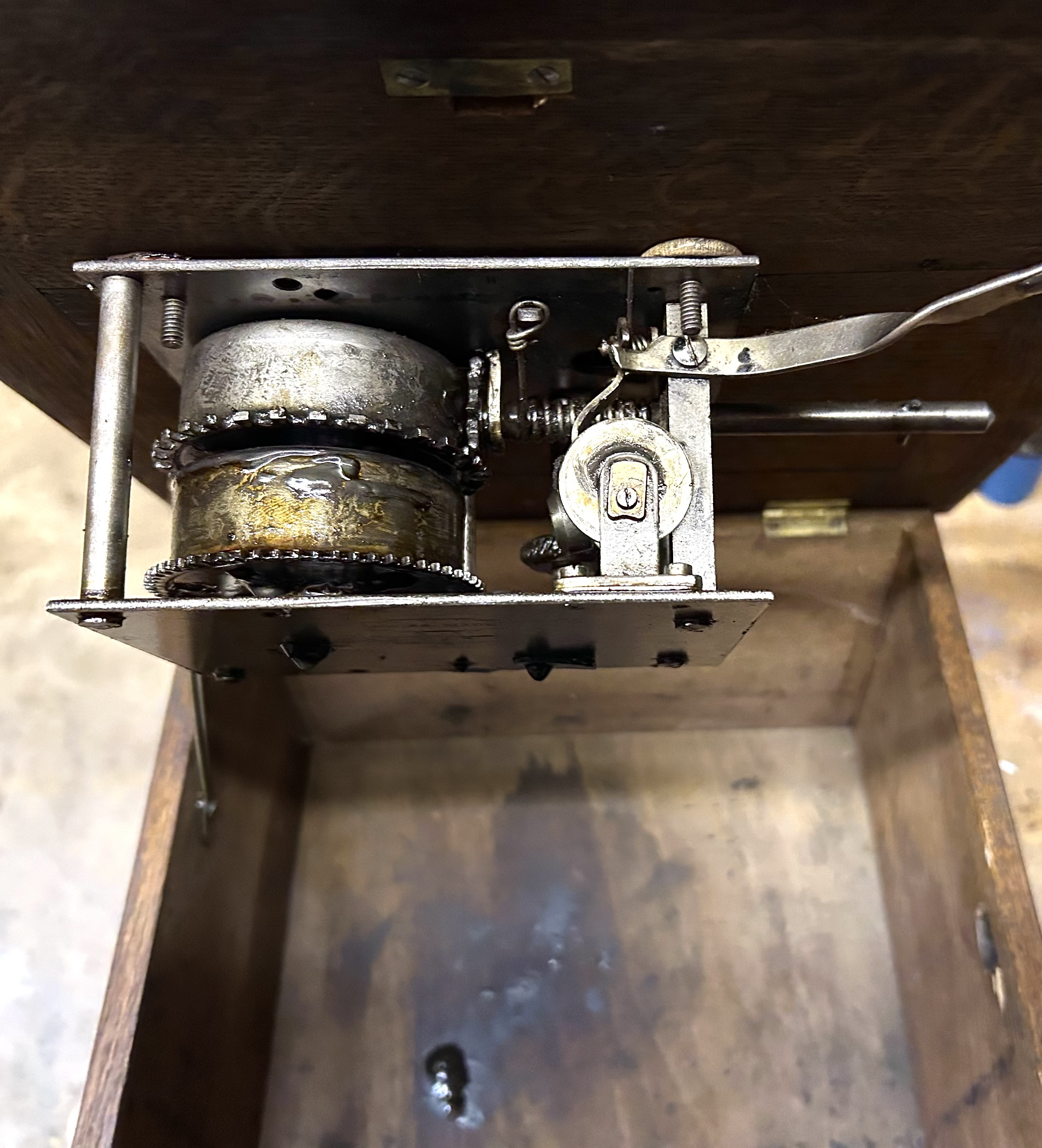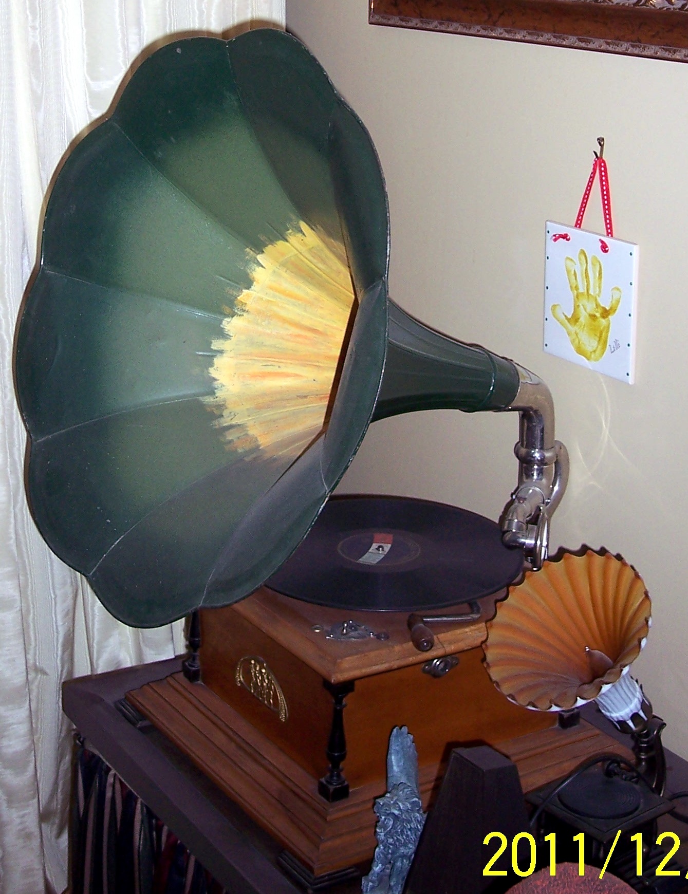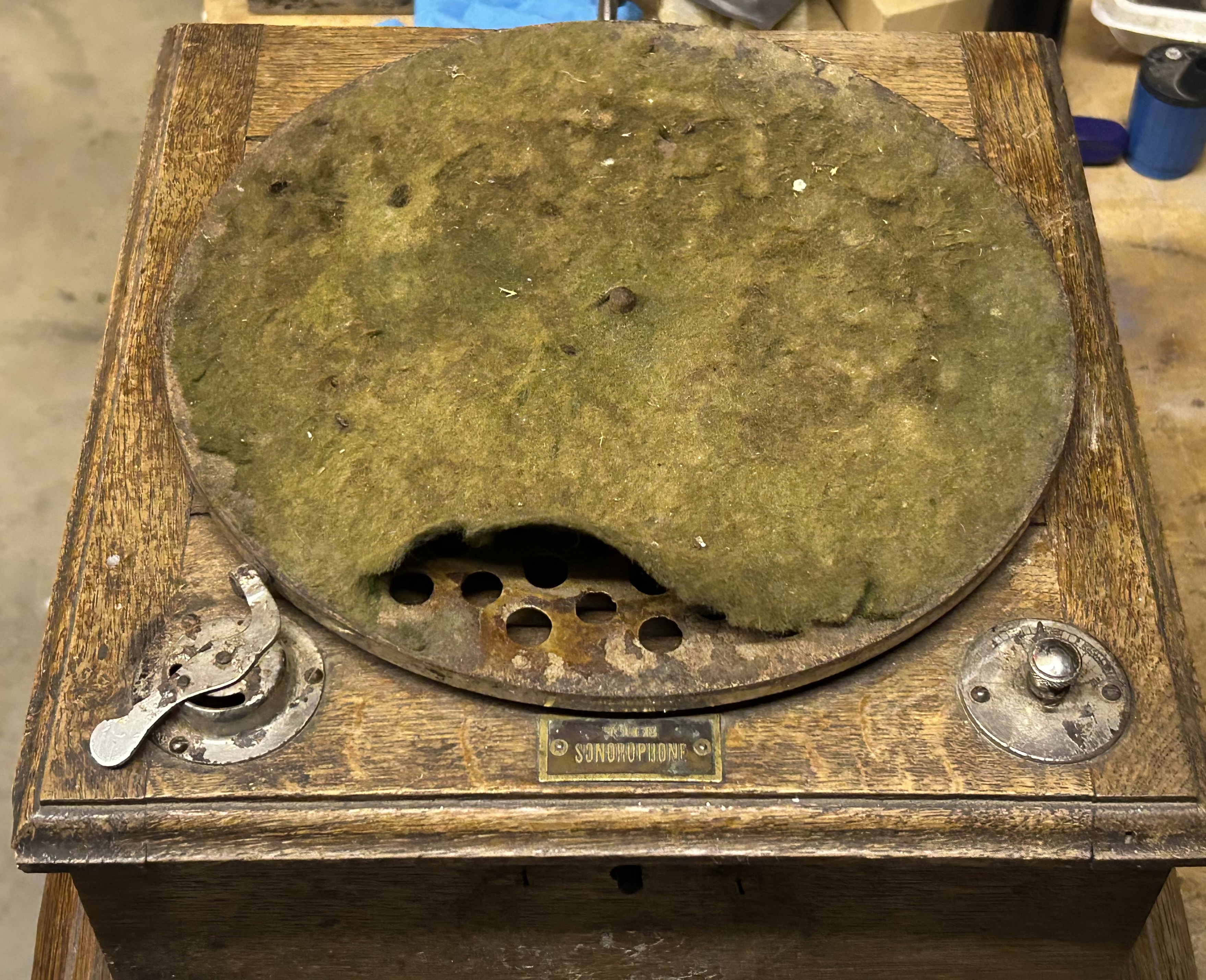 The crank is missing, but would have been a slotted type. The turntable is 9 ¾” diameter.