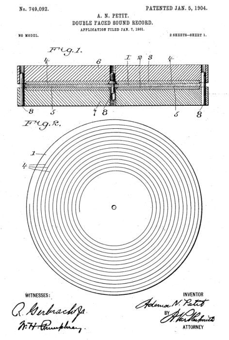 January 5, 1904: Ademor Petit was granted a U.S. patent (No.749,092) for a “Double Faced Sound Record.” Although it seems obvious to us now, manufacturers were reluctant to pursue 2-sided records, although 2-sided test pressings of Berliner (1900), Zonophone (1900/01), and Victor (1903) exist. It wasn’t until 1908 that the major companies fully embraced 2-sided records. https://forum.antiquephono.org/topic/33 ... c-records/