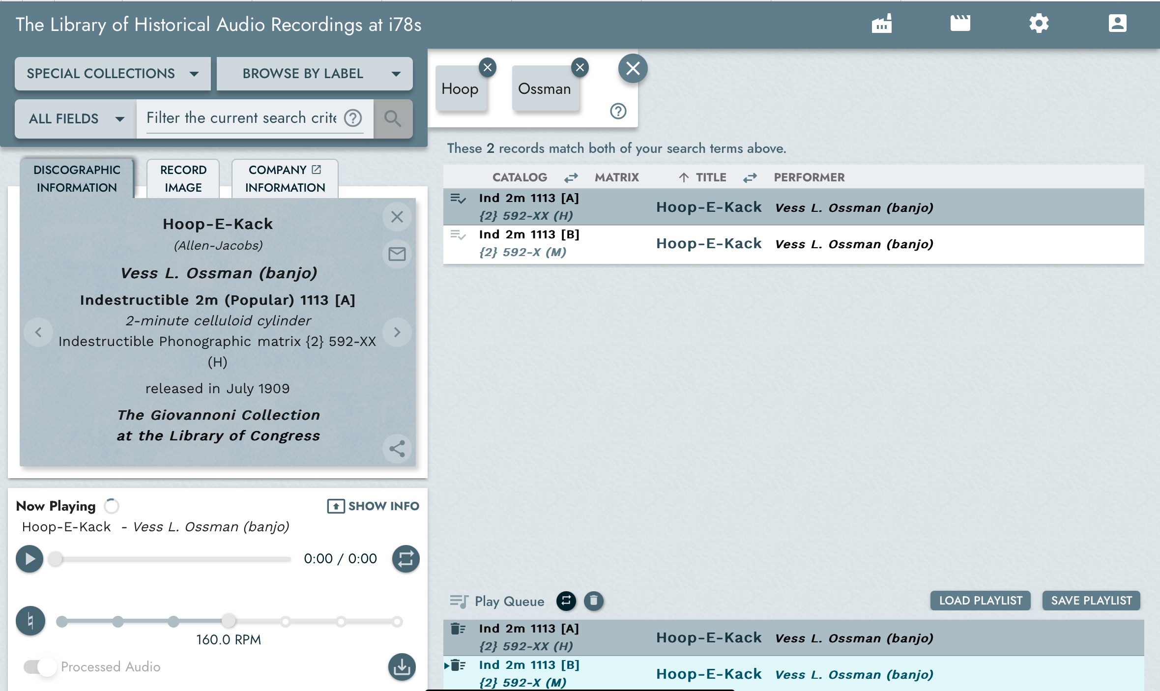 In addition to many Ossman recordings i78s.org contains over 51,000 sides of early recordings of all genres all carefully transcribed and available for free auditioning. Take a look!