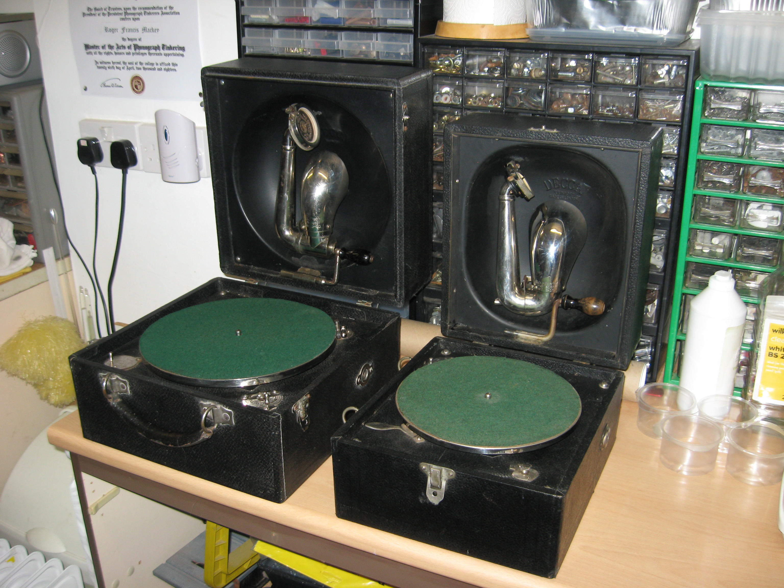 Introduced in 1927, the Decca XL was a development of the Junior portable. The Junior models are easily distinguished from the standard models by their oval sound deflectors, as this picture of two of my machines illustrates :