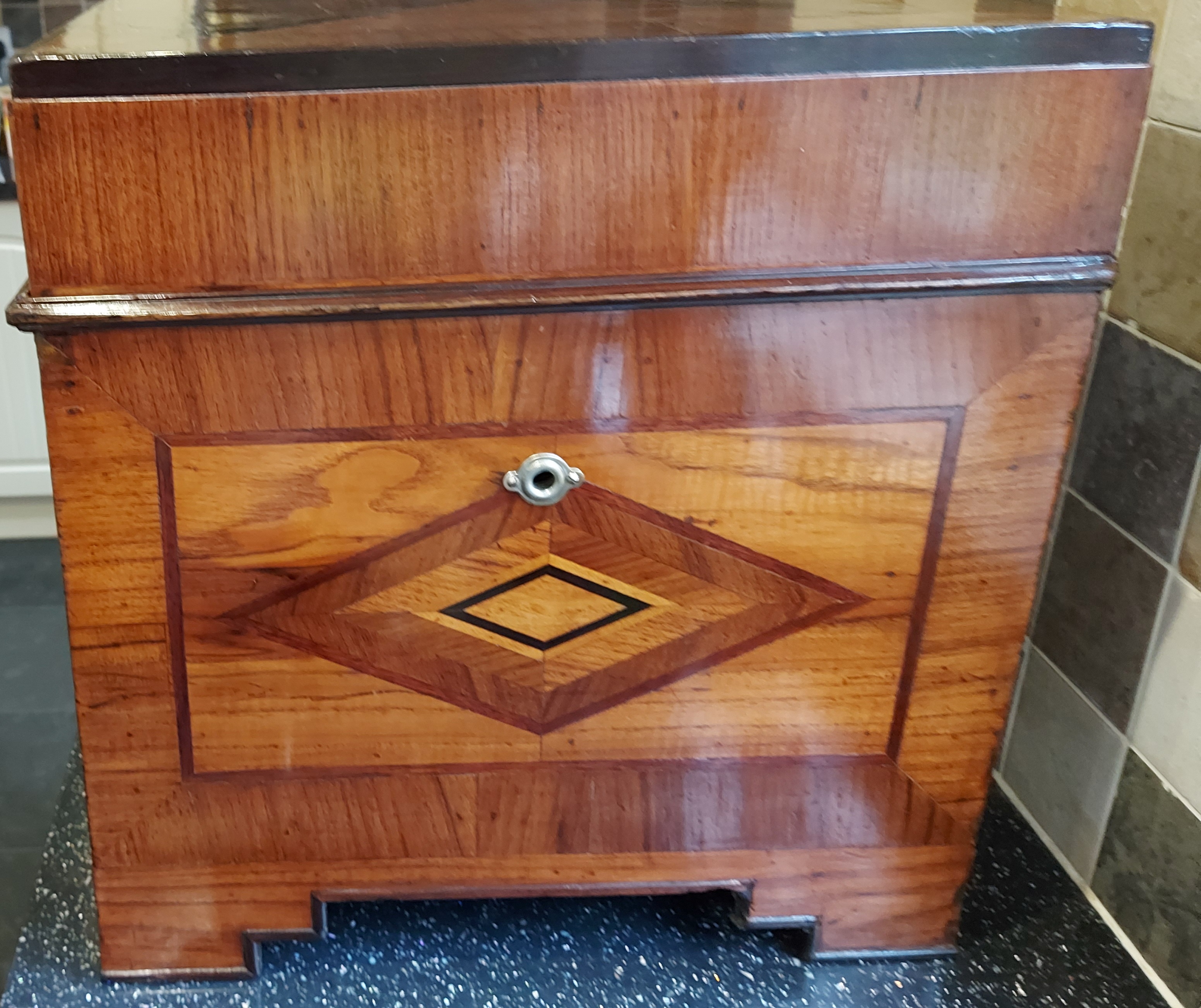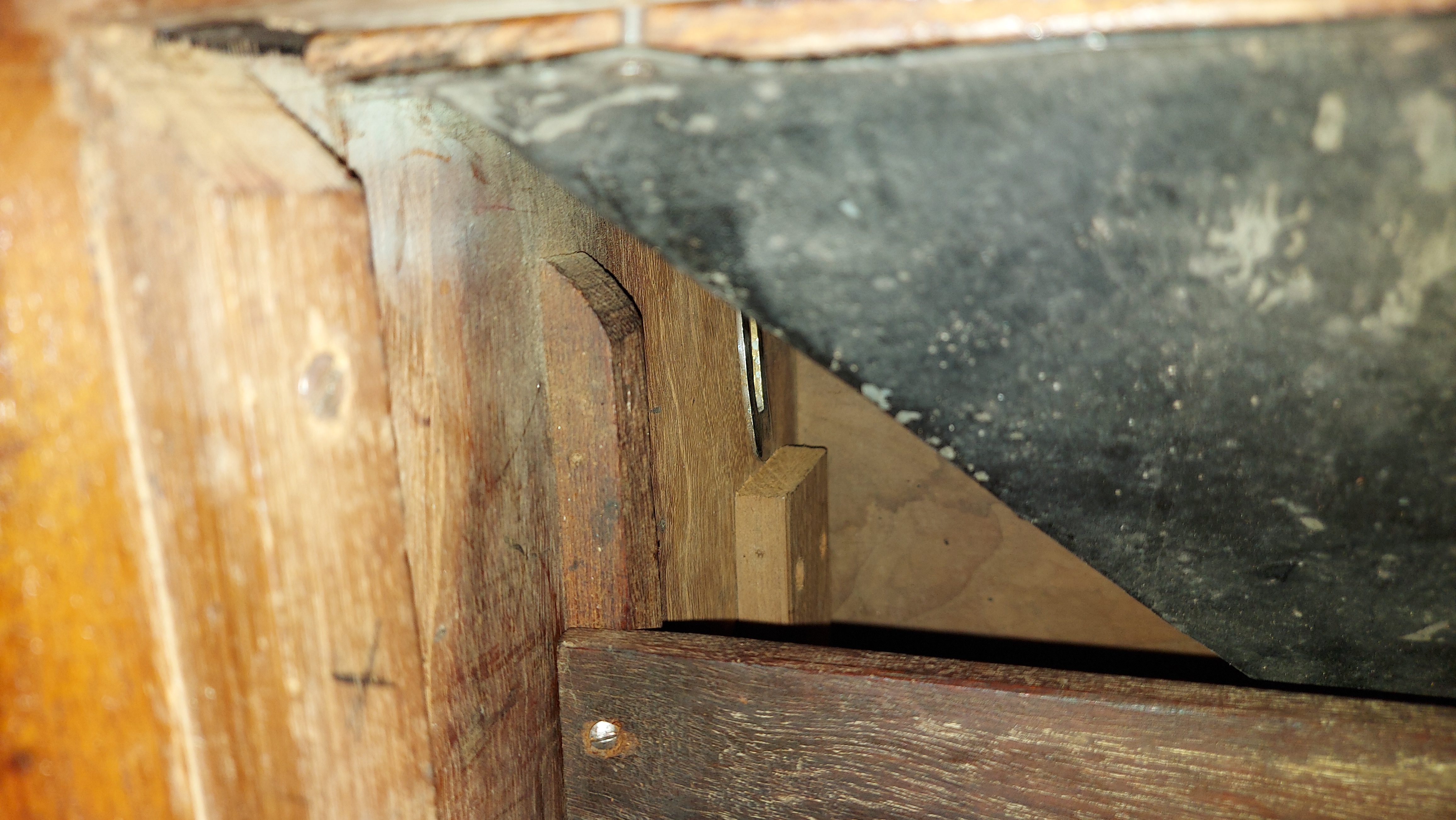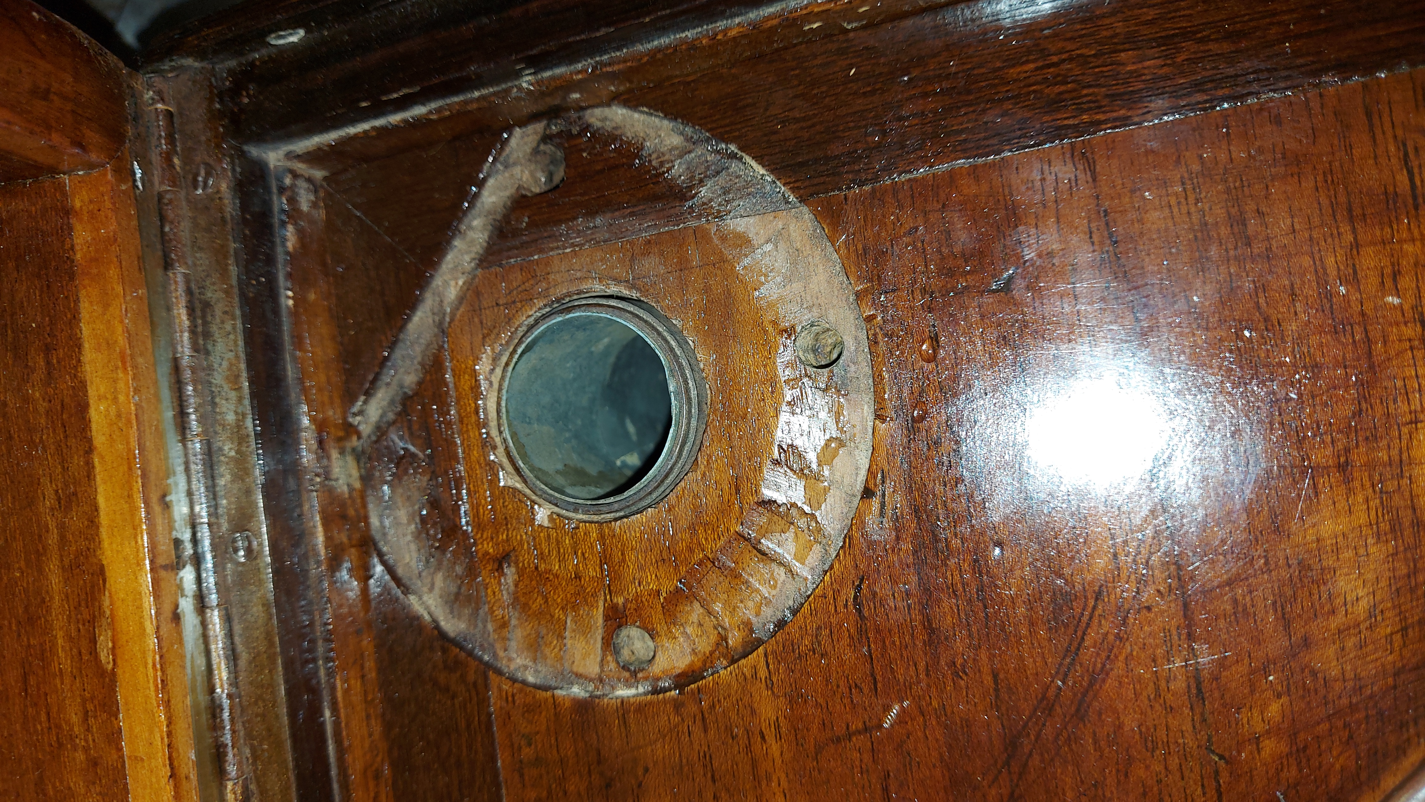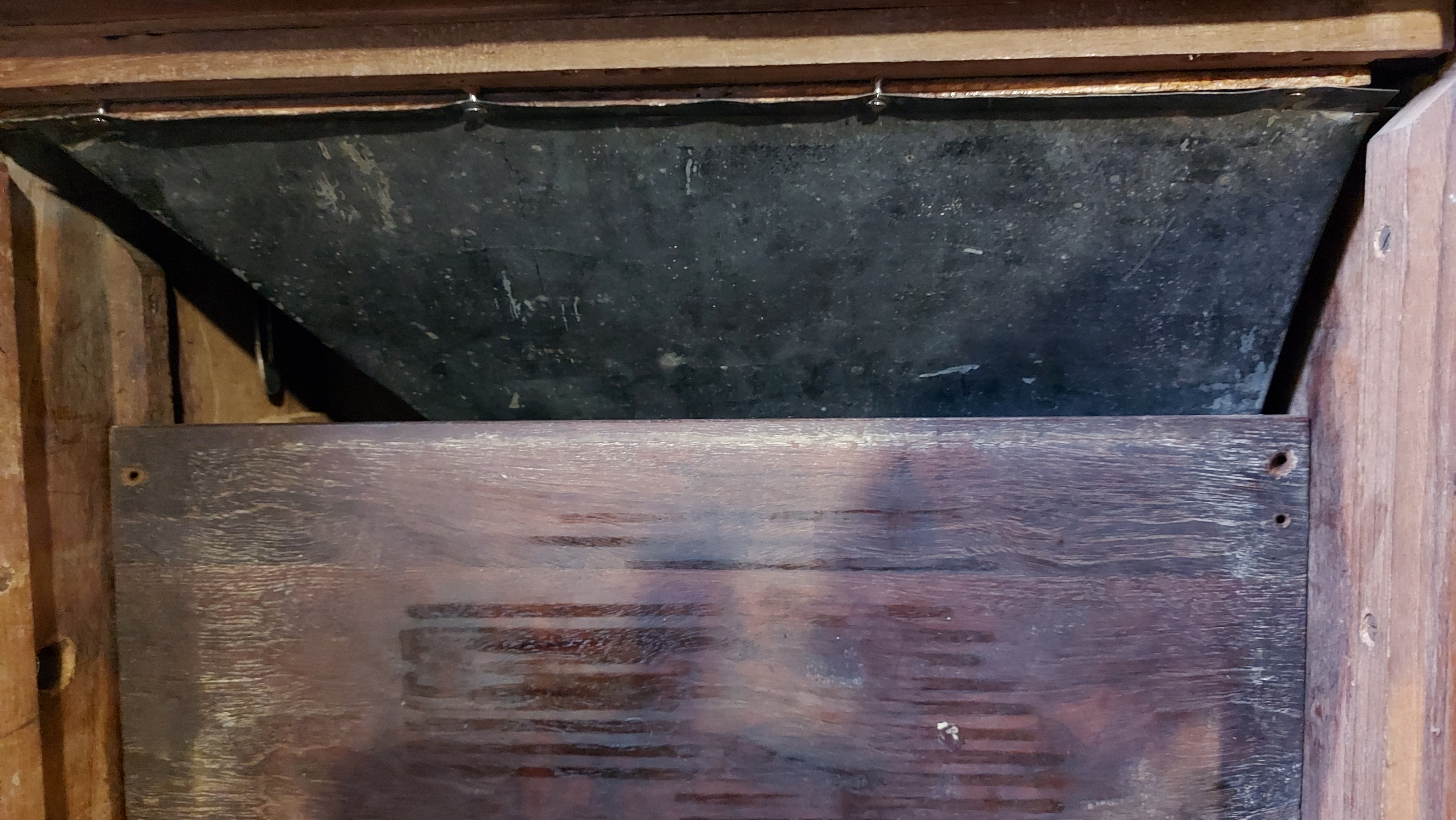 There appears to have been a lock mechanism fitted at some time to secure the front pull down flap. The cut-out for it in the edge of the "door" has been professionally and carefully infilled by someone.