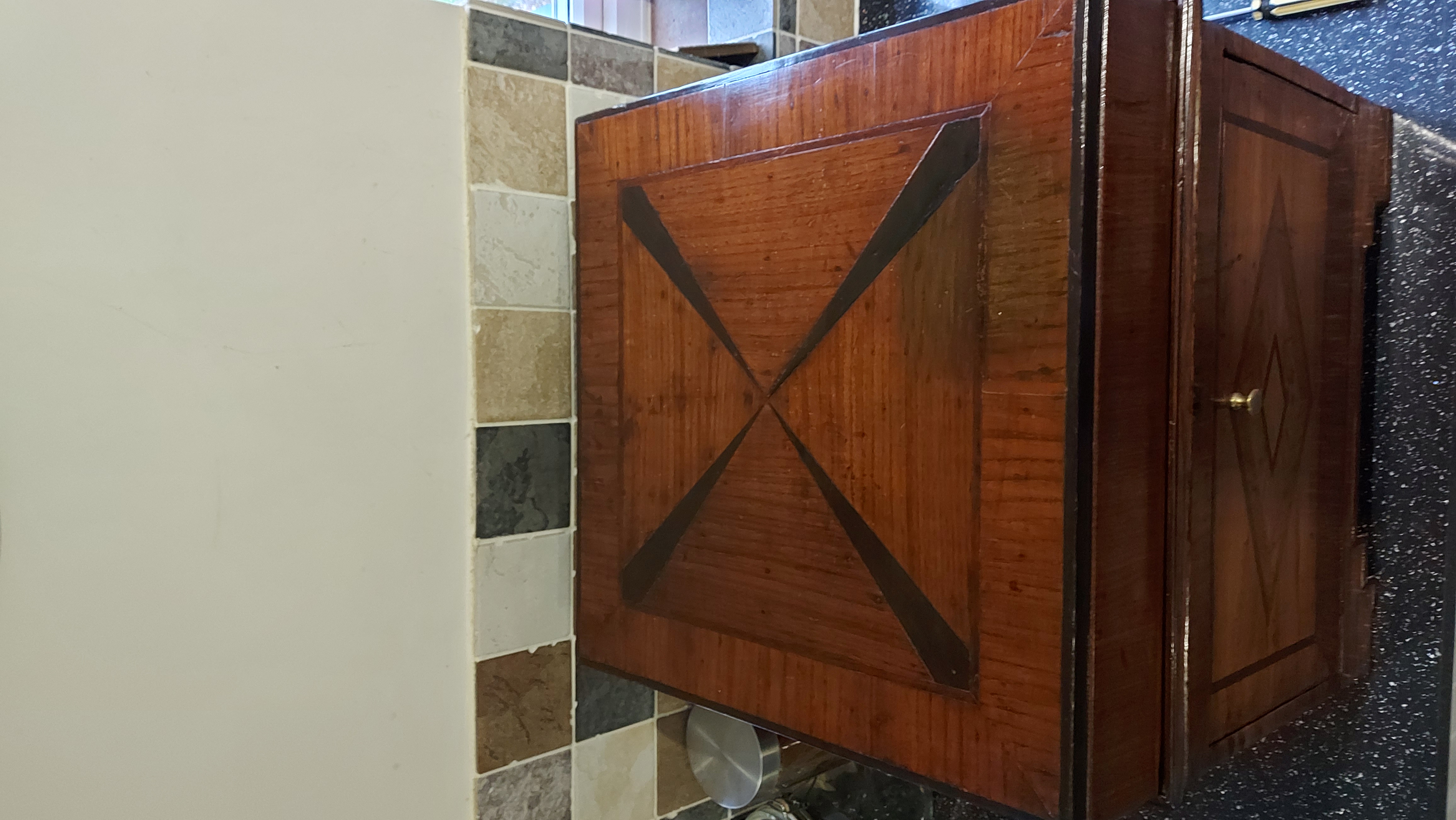 The cabinet was thoroughly repaired and finish restored after he found it in an antiques store in Madrid. Apparently it was caked in dust with other stuff piled on top of it, sat on the floor at the back of a shop. The veneer was lifting all over and the original finish very scuffed and scratched.