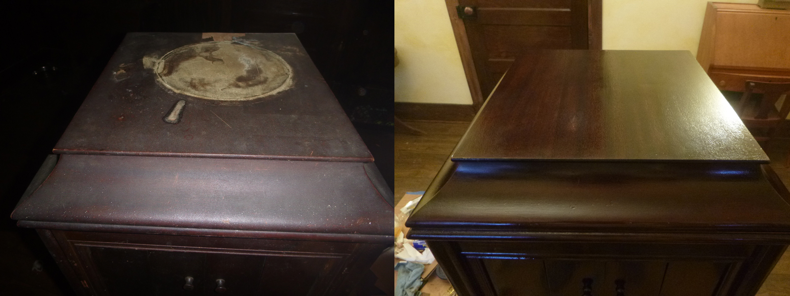 The top had to be sanded down to bare wood along with the front corners, then the shellac was refreshed. It isn't perfect but I am happy with the results. The motor and reproducer were refurbished by Kris Braun (George Vollema's daughter) at West Michigan Phonographs and it runs beautifully now.