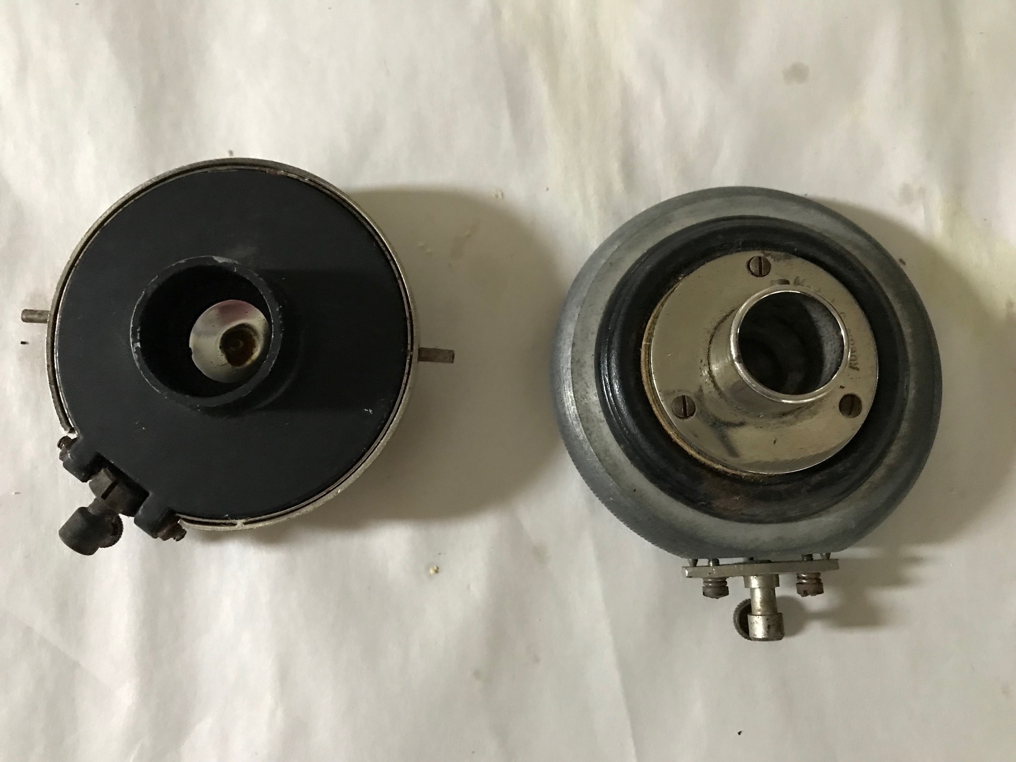 I recently bought a couple of boxes of phonograph parts, nothing particularly great, several soundboxes, Exhibitions for the most part, along with some other U.S. made products. The box included the two pictured here, one of which was made in Germany. The other has no markings but is rather unusual if not rather inexpensive looking. It still has some residual tape on it. Could be American, given how it's attached to the tonearm.