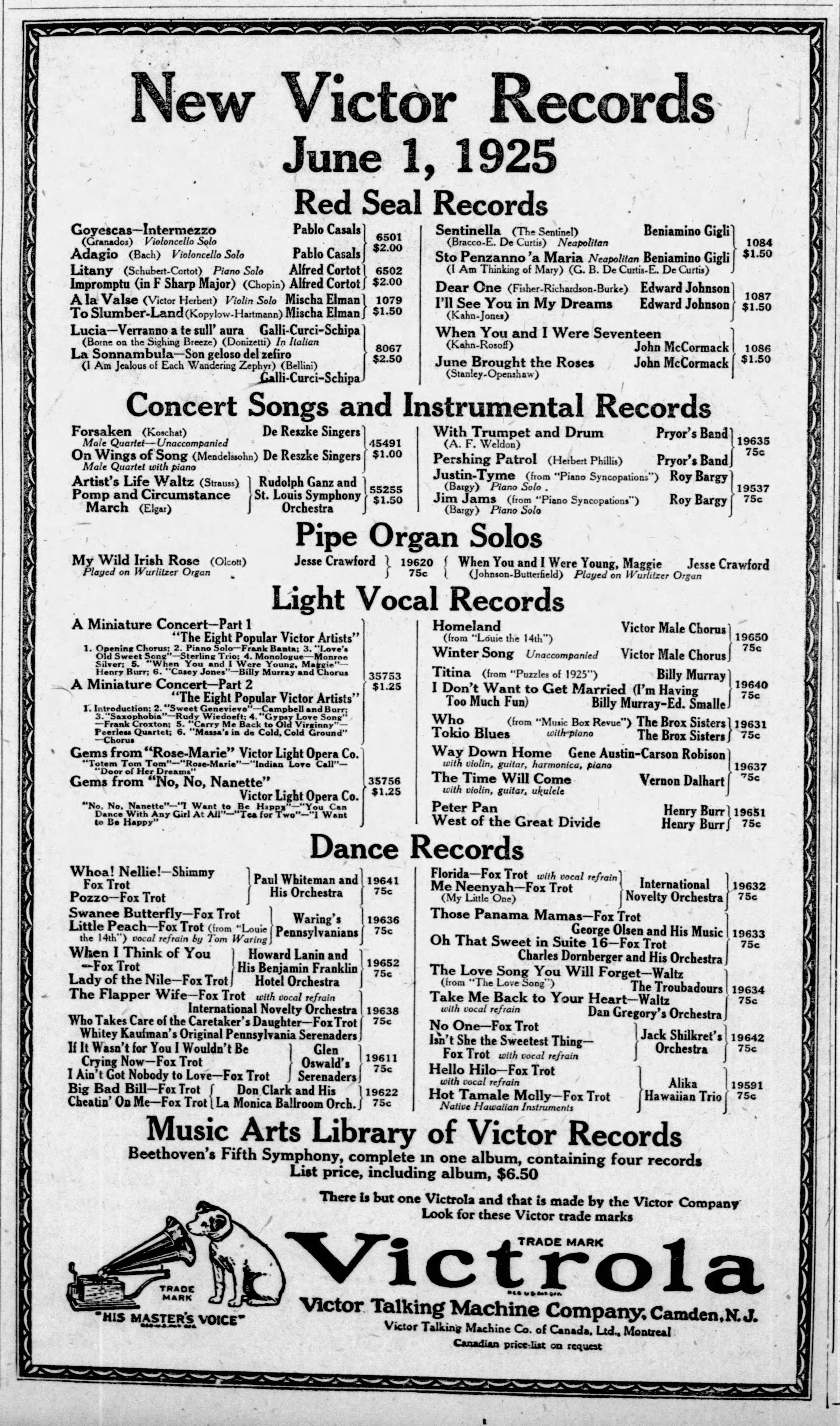 February 26, 1925: Earliest recording date for an issued Victor electric recording: The Miniature Concert by The Eight Popular Victor Artists, which would be released in June.