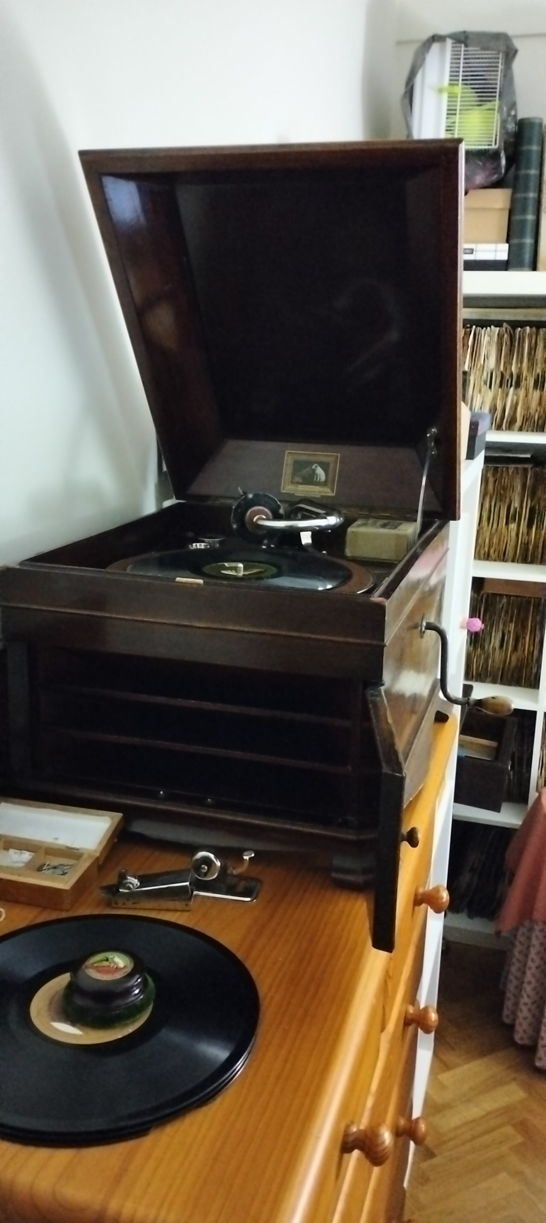It all depends. Normally my Victrola XXV because it’s nearest to where I open my packages. If they make it upstairs first, then it’s my Victor IV as it’s the quietest of my upstairs external horn machines and has a mica monster rebuilt exhibition.