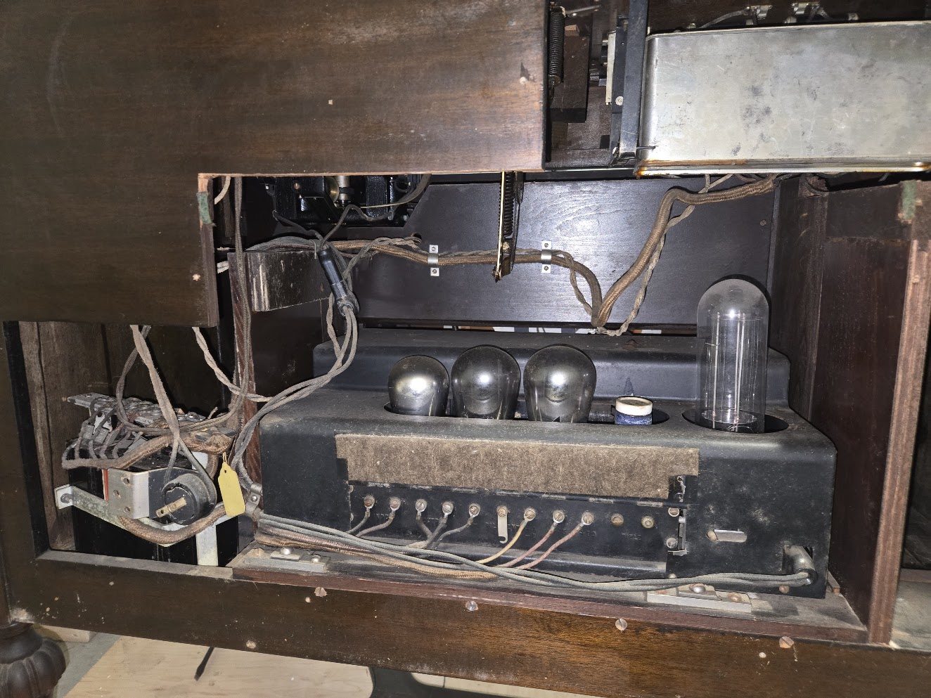 There were vacuum tubes connected to each component, but some look burnt out and I would need more information about testing them. It looks like something leaked out of the radio vacuum tube box, but otherwise I don't see any obvious signs of damage. My guess is tubes burnt out and were not easily replaced and the cabinet ended up sitting idle for 40+ years. There's a speaker behind the center panel in the front, but I haven't looked at the condition of it yet. I'm hoping to do some amount of restoration and use the cabinet as it was intended. I know a little bit about turntables, but virtually nothing about systems that use vacuum tubes. If there is any interest in the radio unit or what I assume is the amplifier, please let me know, I'm not sure that I'm interested/capable in restoring those two components. Pictures are attached, any help or information would be greatly appreciated!