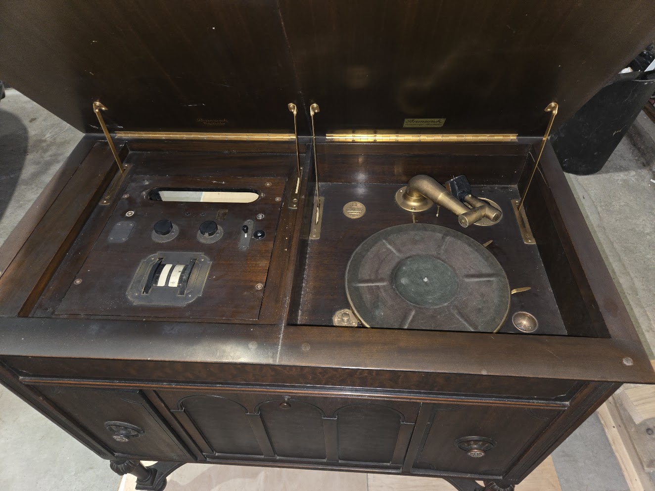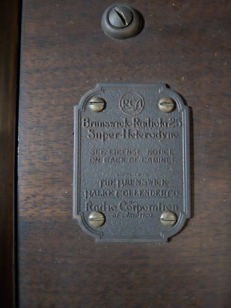 Rear nameplate: Brunswick Panatrope-Radiola 25 Super-Heterodyne Model AR-942 Range 550-1360 Kilocycles, last patented June 30, 1925, Supplied to The Brunswick-Balke-Collender Co. by Radio Corporation of America