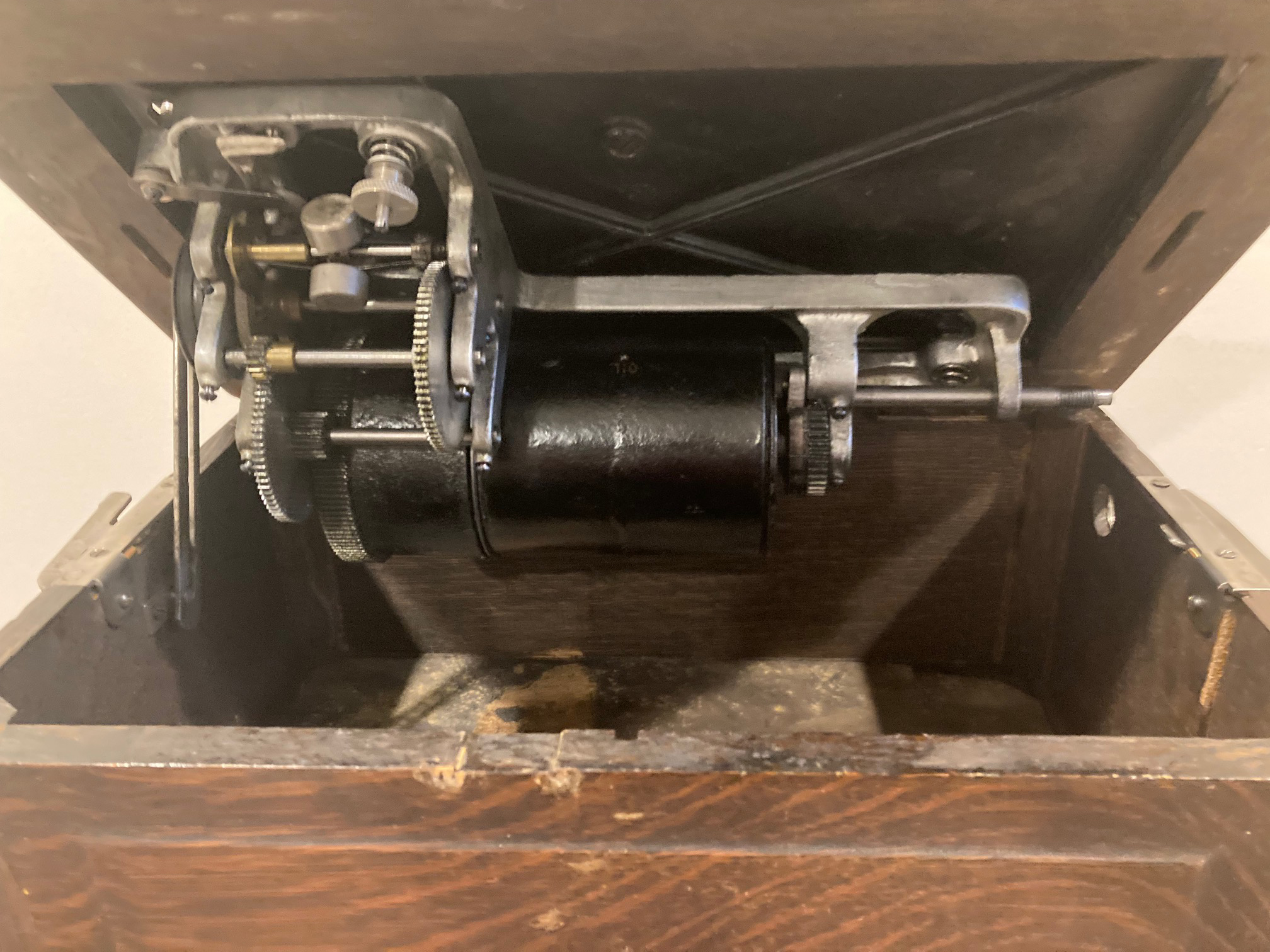 This is being offered as a complete ready-to-play package consisting of the Triumph, Model C 2 Minute reproducer, Edison 12 panel Triumph horn and crane. The motor and upper works have been cleaned, lubricated and adjusted where necessary so that everything works properly. Both reproducers have been rebuilt with new gaskets. The sapphire styli have been carefully examined and found to be in good condition with no flat spots or chips. The machine runs and plays well and sounds as it should. The cabinet condition can be seen in the pictures. It has not been cleaned, so it could use some work with Gojo and wax. The cabinet has no missing, damaged or broken pieces and all hardware is present. The horn is in very good condition with no bends or creases and just 2 very minor dents. There are some paint scratches but it displays very well. The lid, as you can see is not original to the machine (was finished in green oak originally) and has been stripped but not refinished. It is in good solid condition fits well and locks in place properly.