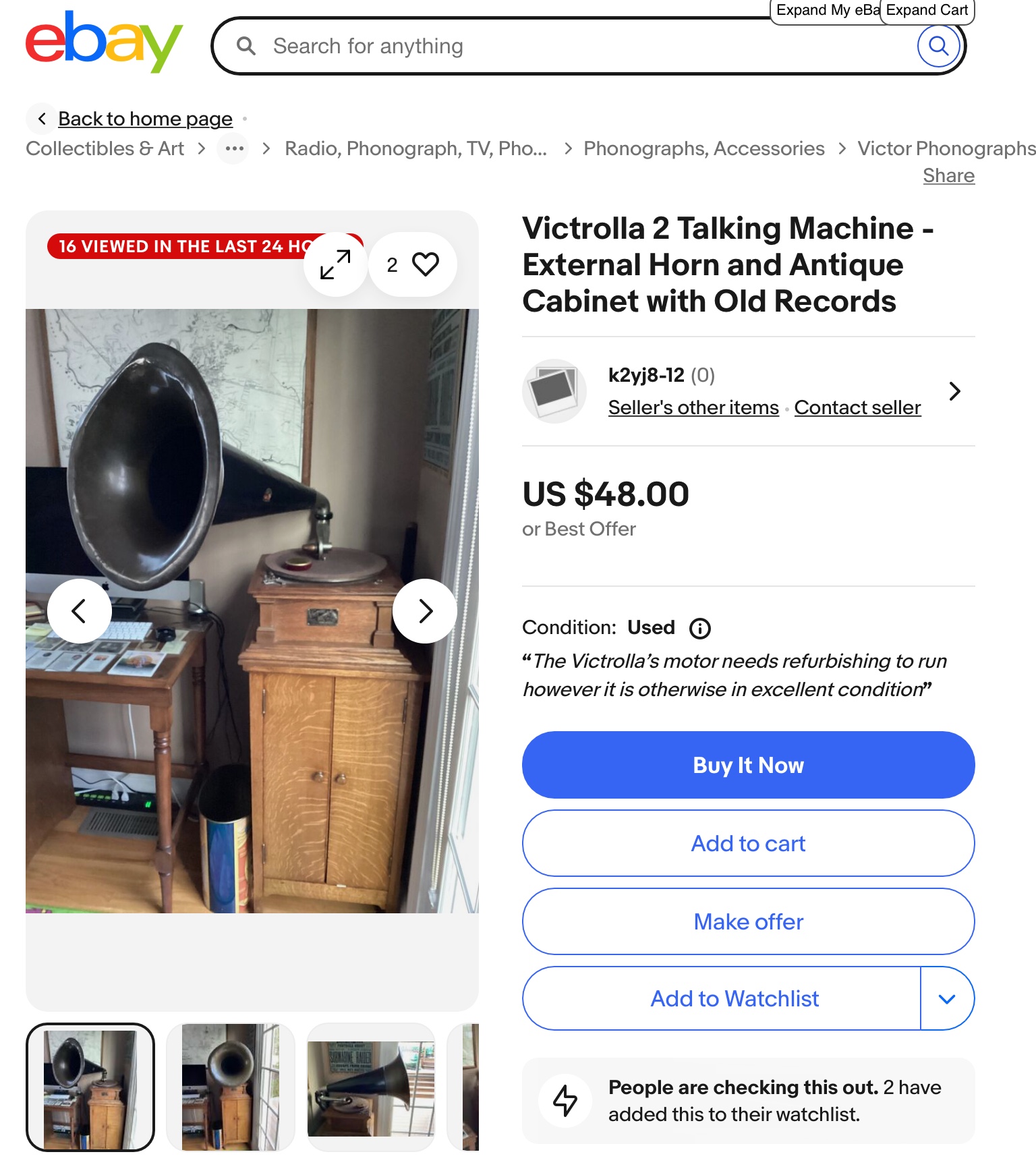 Agreed very phishy! An outside horn Victor, record cabinet and early records all for $48! The seller has no feedback.