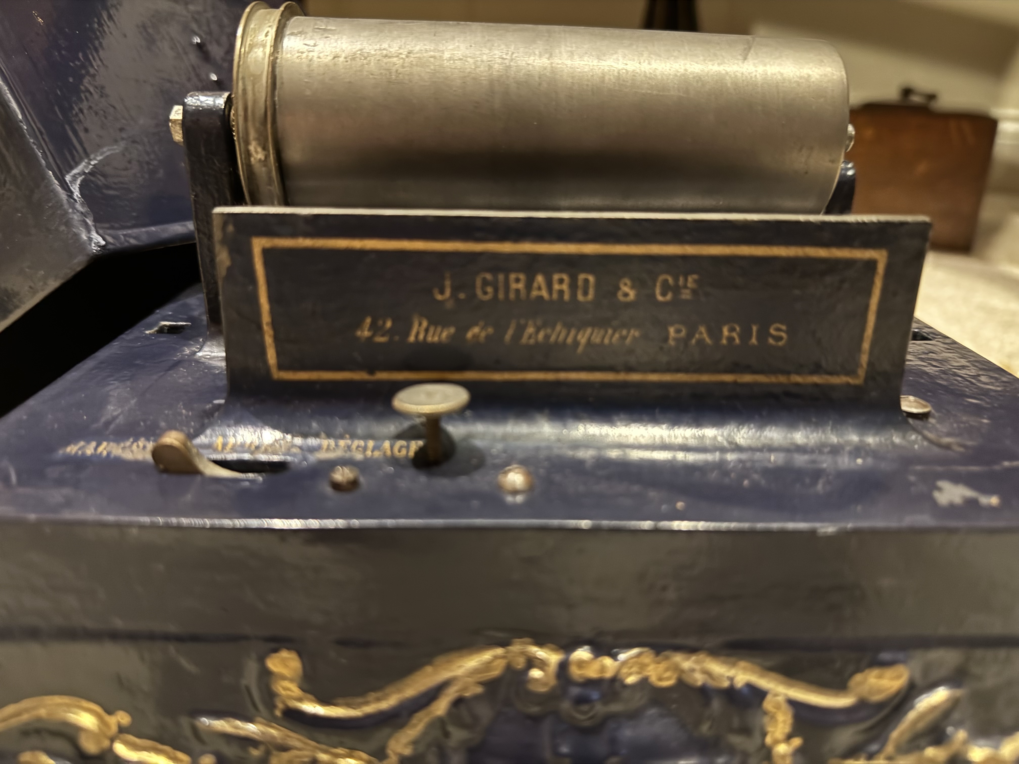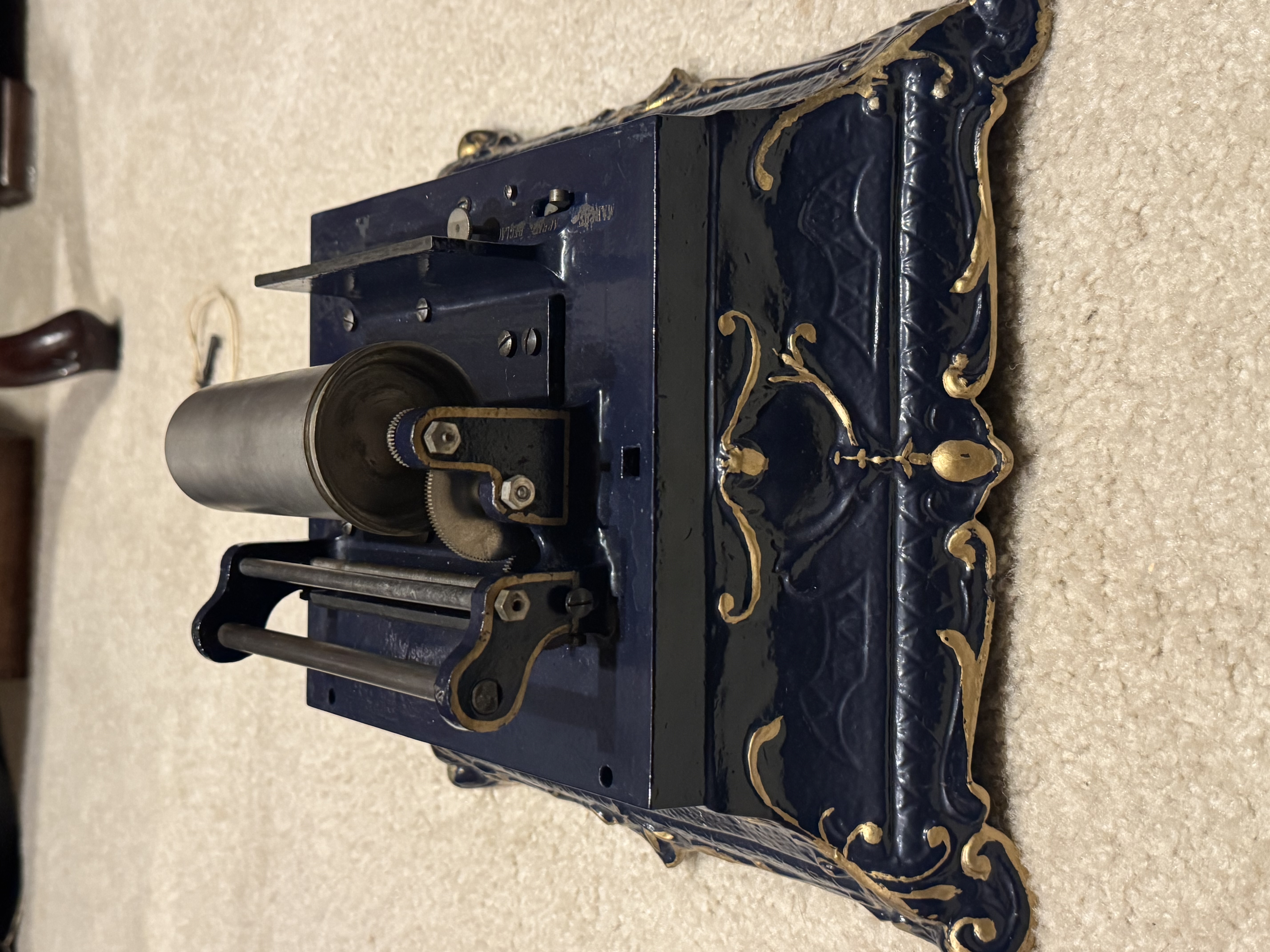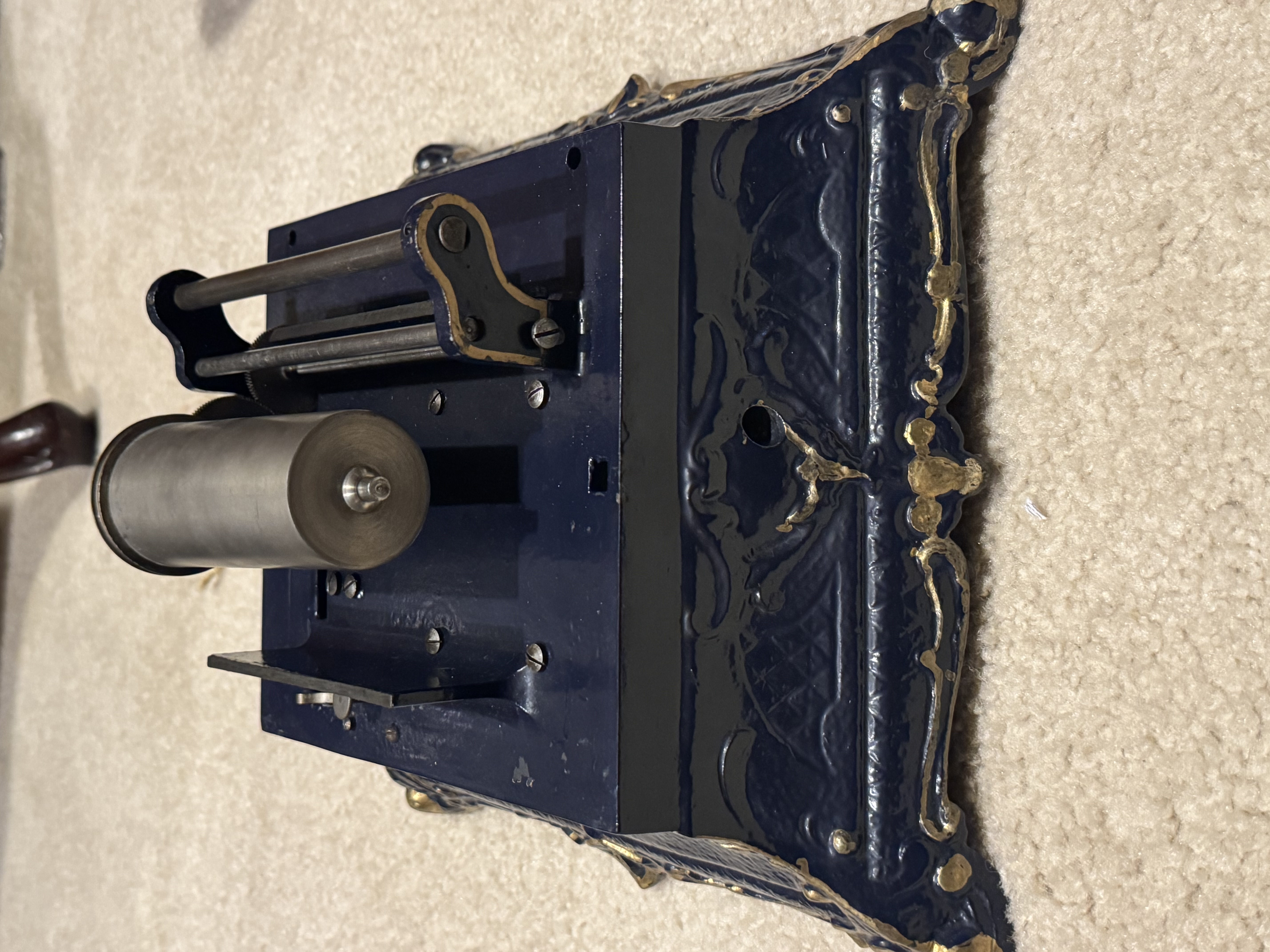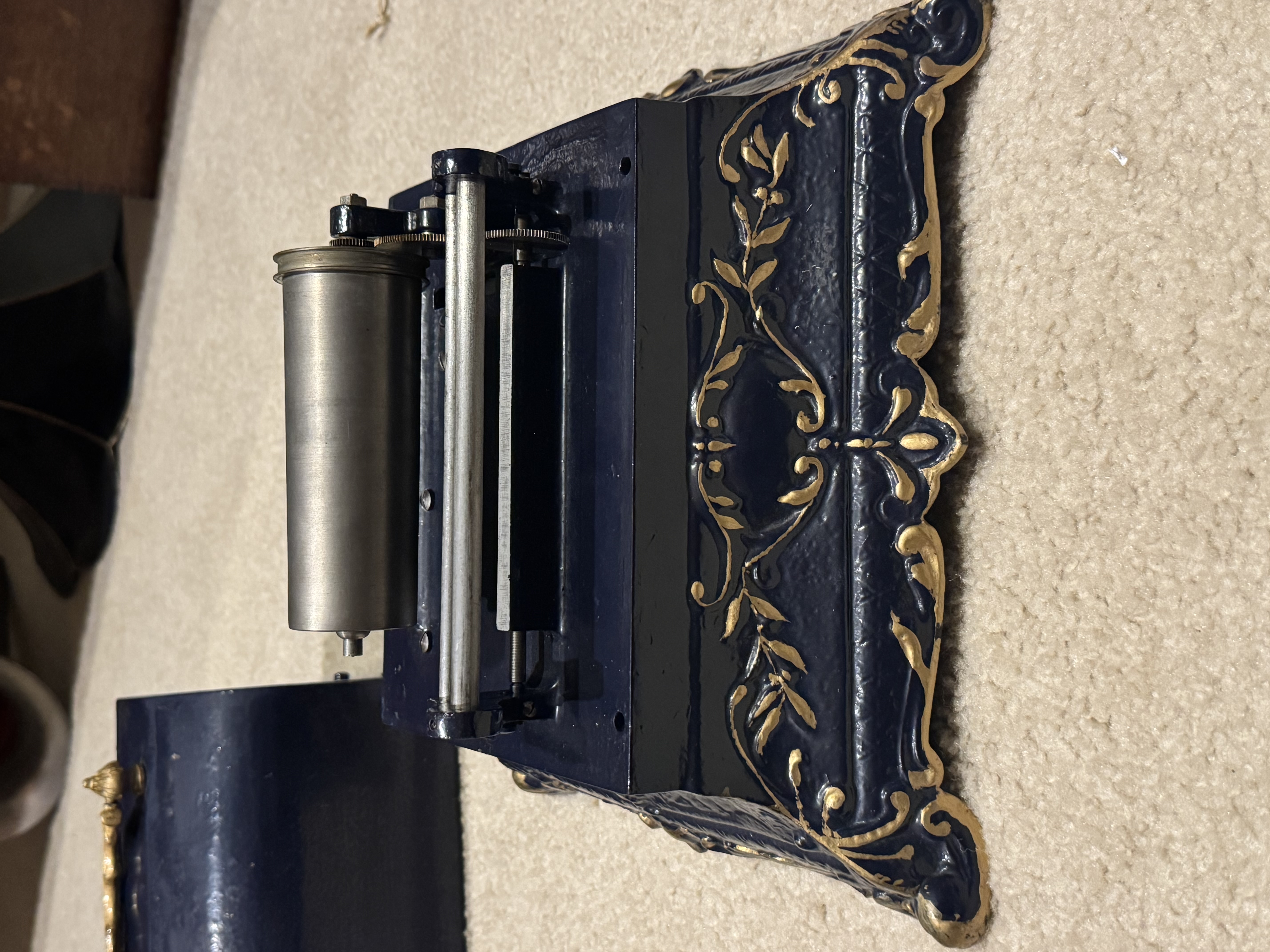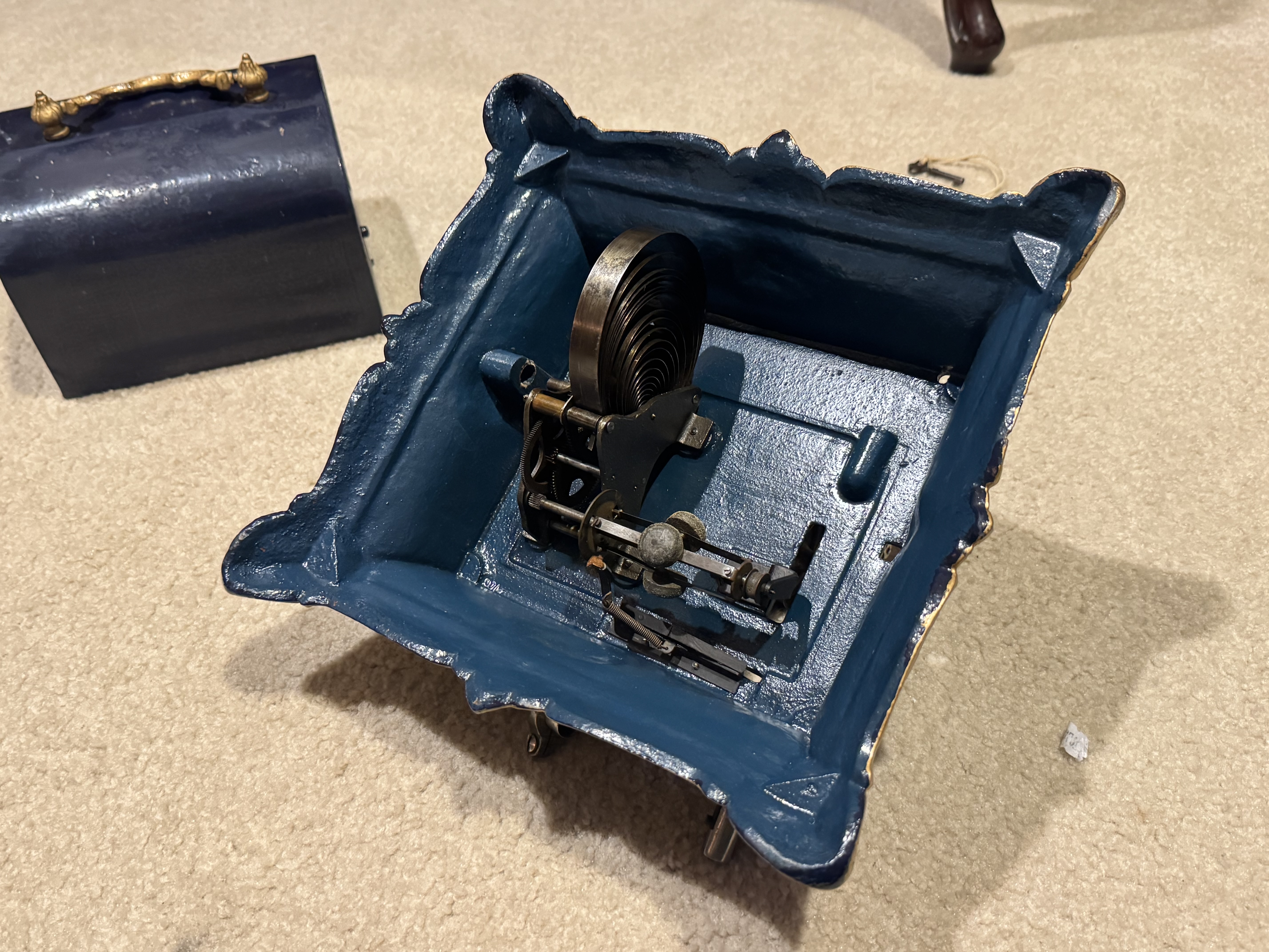 I have a Pathé Menestrel , it is unfortunately missing the Carriage and the Key. The keys show up on eBay from time to time, but the carriage might be more challenging to locate. If you can find those parts, you have a machine ready for restoration, or if you need parts, this is a good machine for that. It has been poorly repainted, both the lid and the body. The motor runs but could use some love. The price is $400 for pickup in Greensboro NC or shipped.