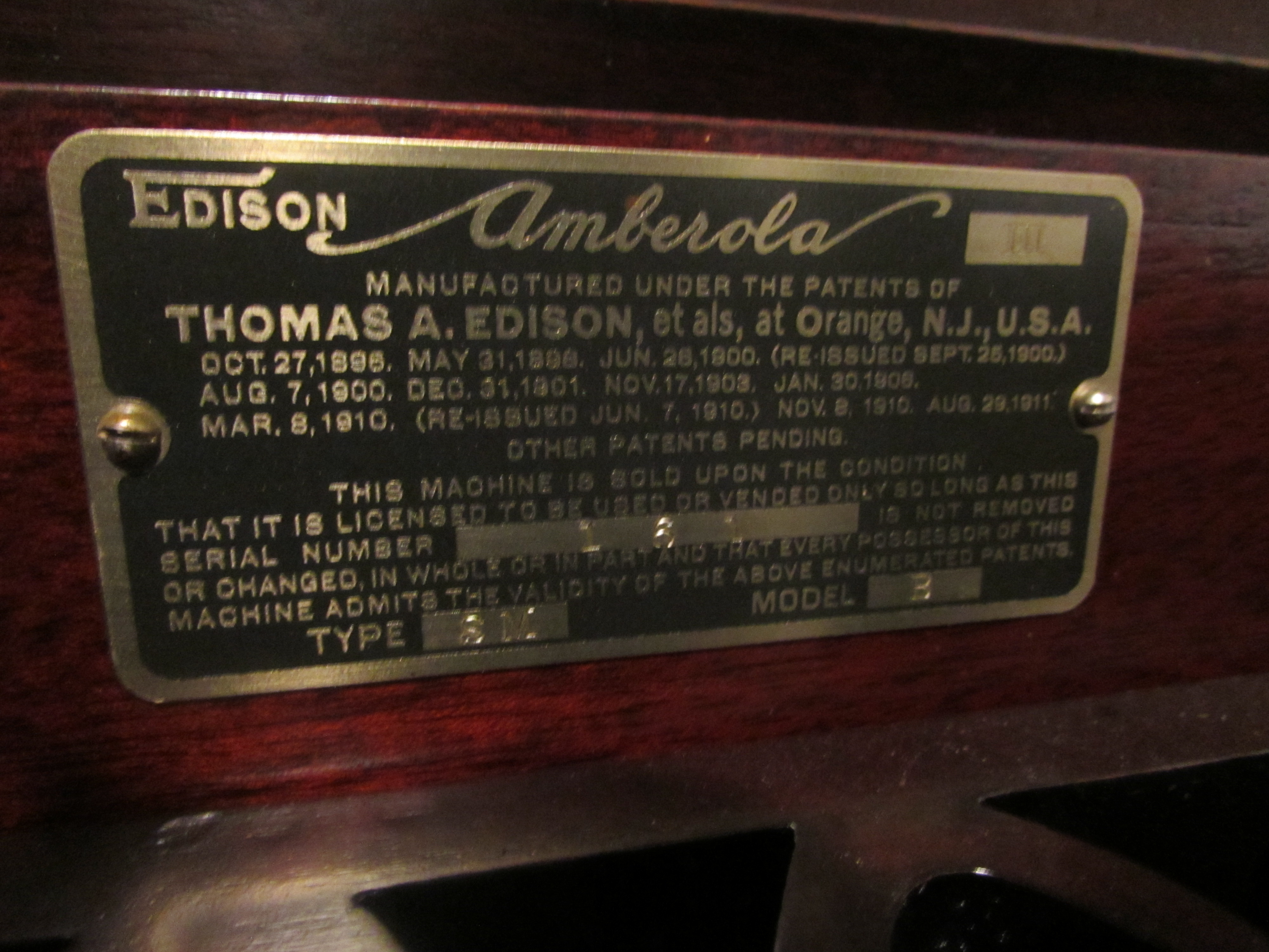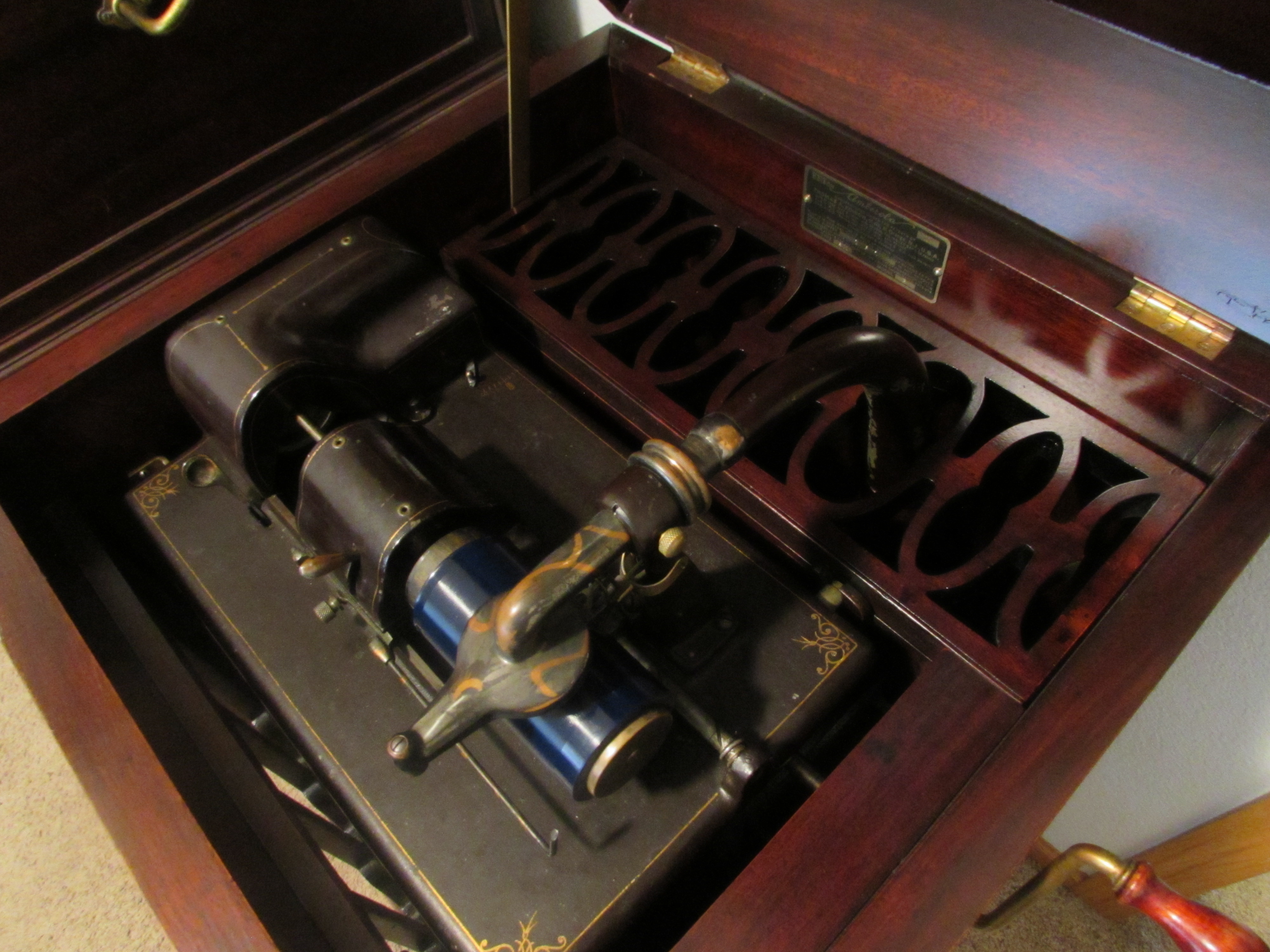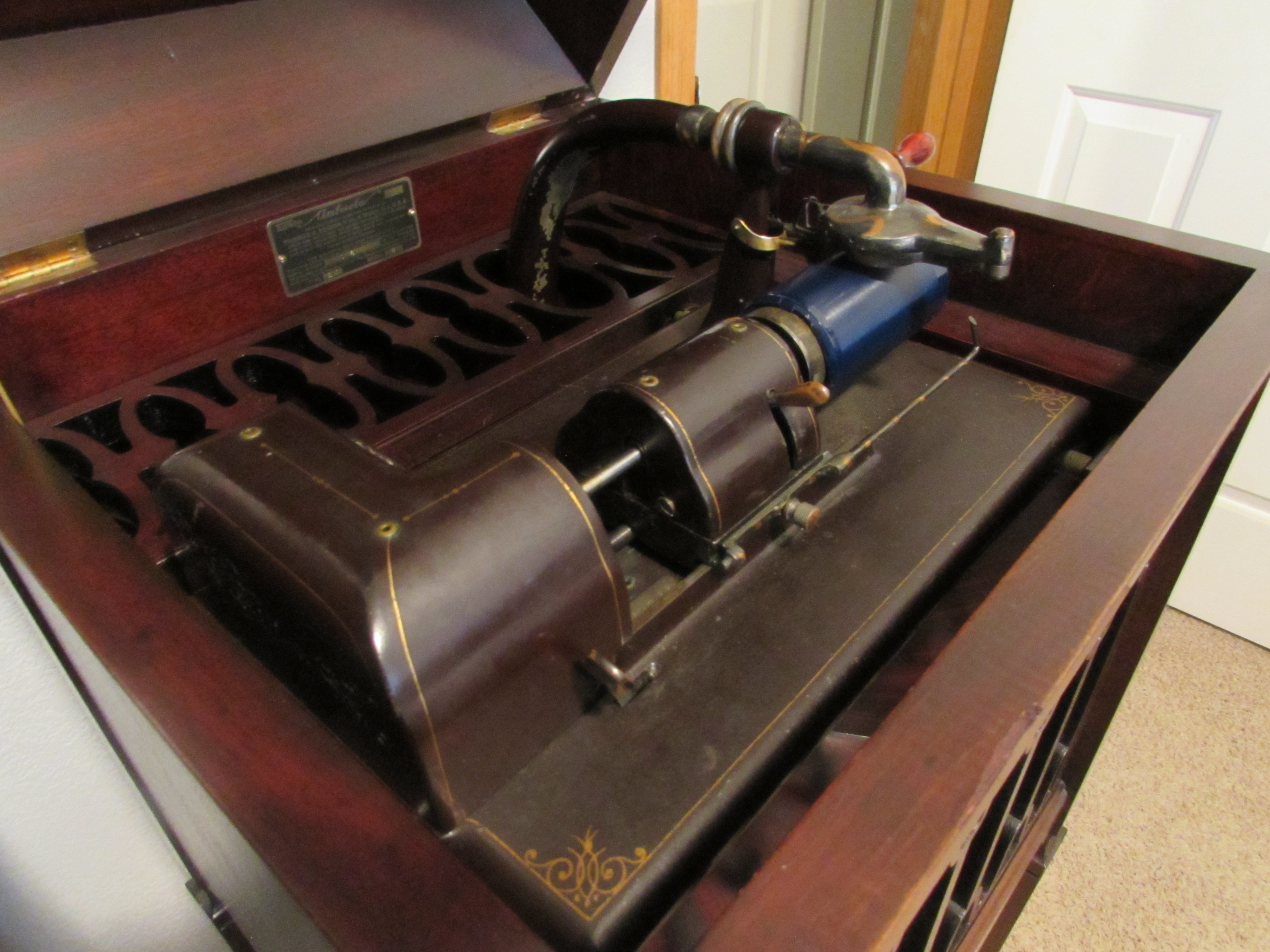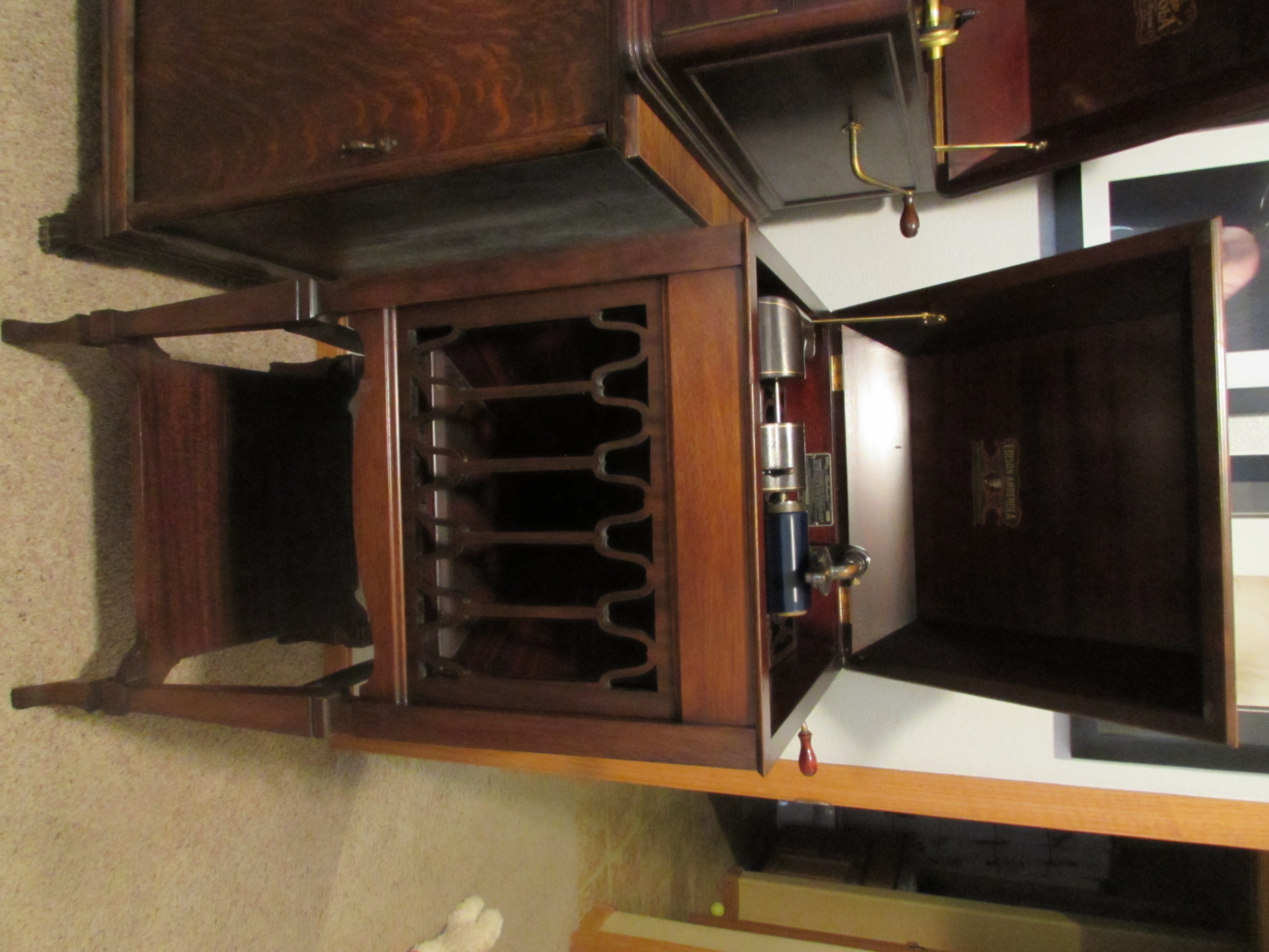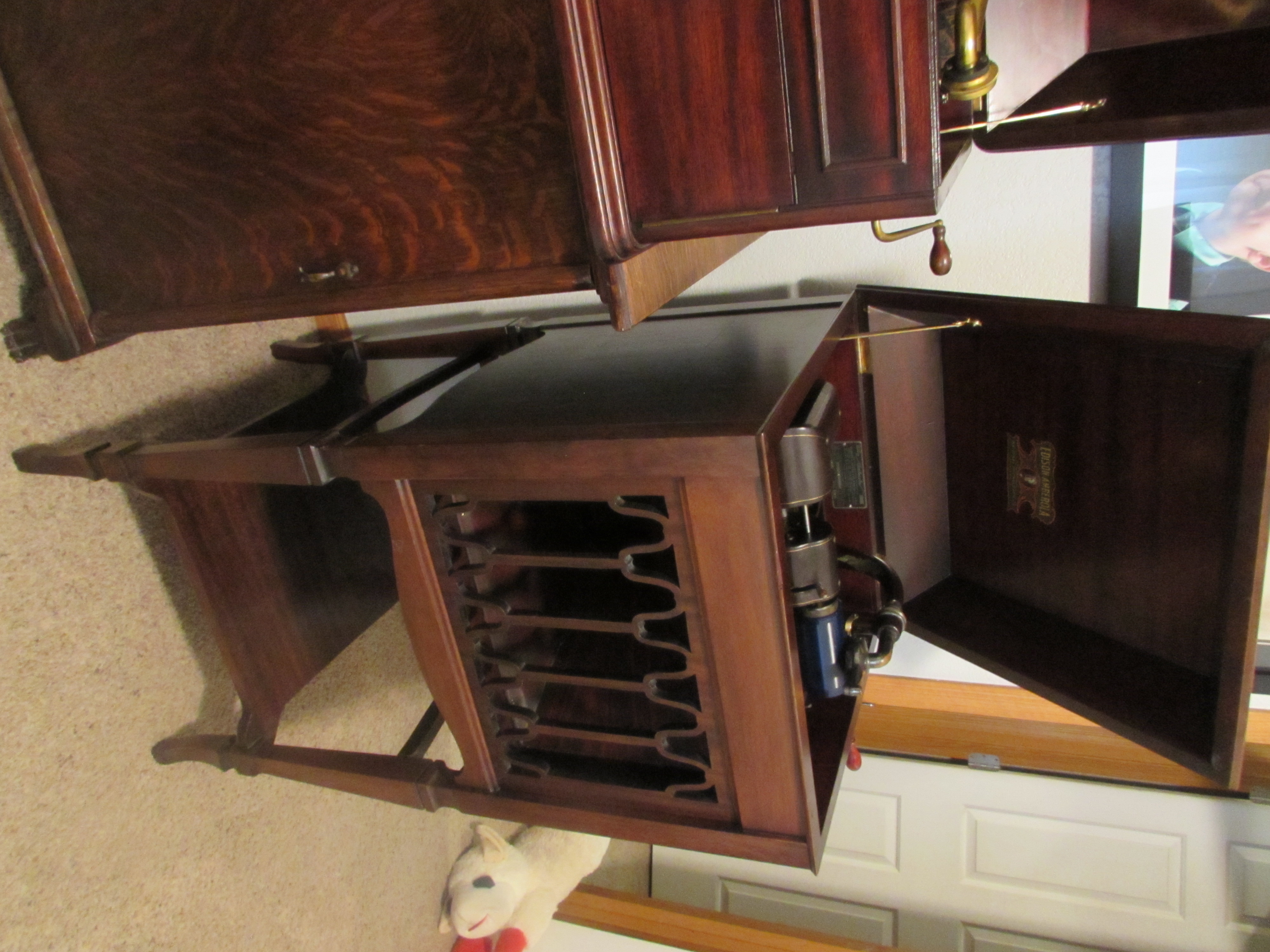 This is in excellent condition. Plays perfectly and sounds great. Has the Diamond A reproducer and as a lot of you know...the motor and mechanism are identical to the Edison Opera and others. The mahogany cabinet has been restored sometime in the past...it was obviously professionally done and looks amazing...please see all the pics. Didn't make many and this serial # is a very low # 161. P/U in NE Iowa or delivery to the Chicago Show in June. Price is $2200. Please email directly (I'm just not on the site a whole lot)...or call to talk it over...thanks.