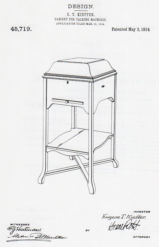 May 5, 1914: Eugene Kieffer was granted U.S. Design Patent No.45,719 for “Cabinet for Talking Machines.” This would become the cabinet for the Victor/Victrola XXV.