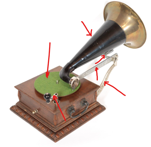 I now have the turntable & record hold-down nut, as well as a leather elbow. A proper reproducer is on the way. Progress!!