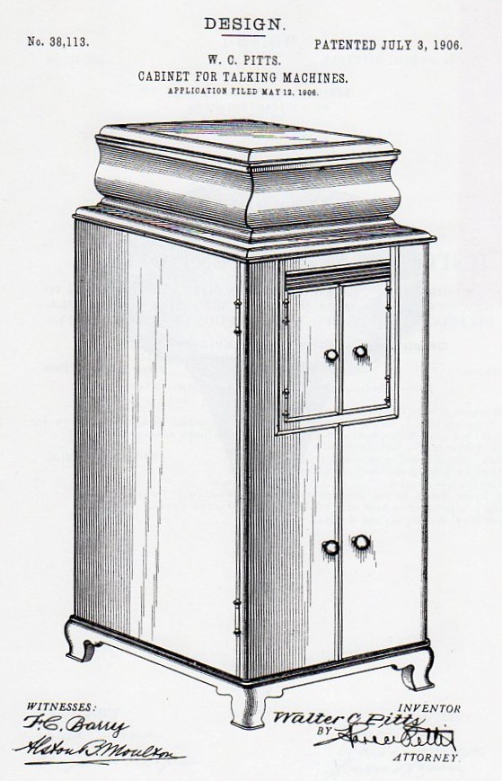 May 12, 1906: Walter Pitts filed for a U.S. design patent for a “Cabinet for Talking Machines.” This would become the first production cabinet used for the Victor-Victrola (the “Pooley cabinet,” termed for the furniture company that first manufactured it).