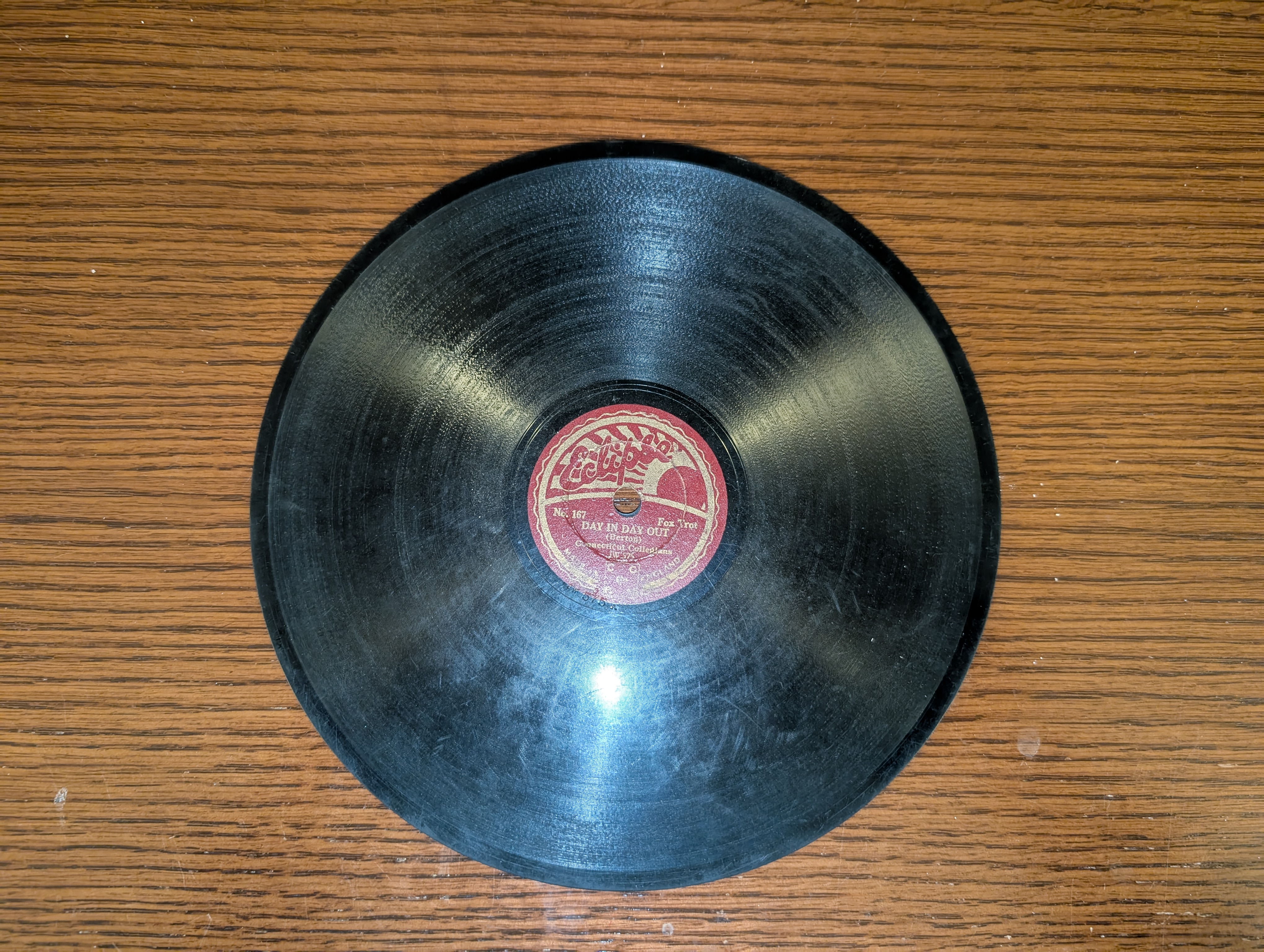 Greetings! I found this unusual 2-sided disc mixed in with a batch of very common Victor batwings, etc. It's 8 inches, and according to the label was made in England, though the band is called the "Connecticut Collegians." Can anyone out there confirm that it is, indeed, English? Any idea when it might have been made, if it's electric or acoustic? Was this a common label? Anyone know what company made it? Any and all information appreciated. Thanks!