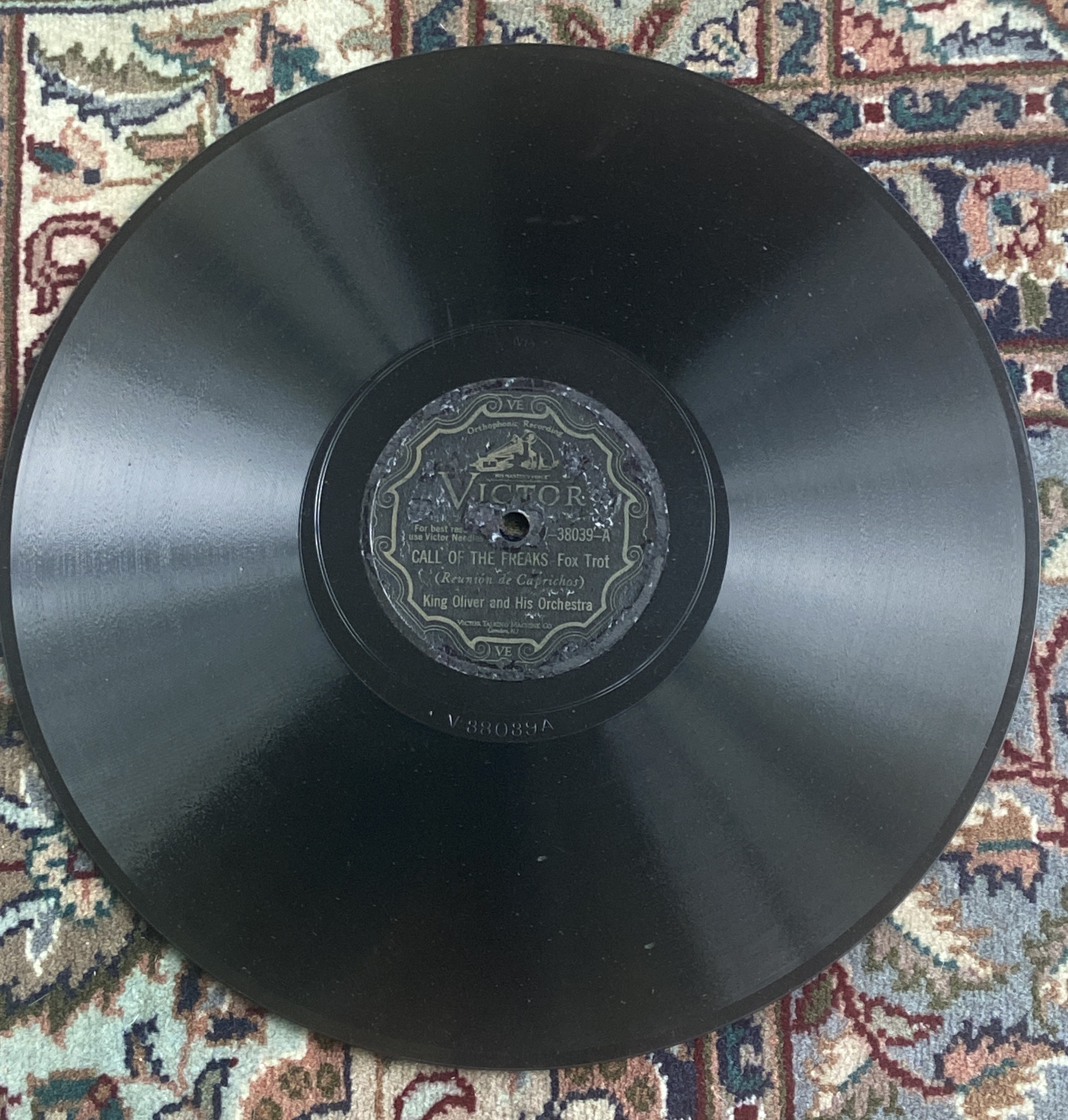 Have a group of 5 Victor Ortrhophonic records from the V-38000 Hot Dance series. These records date from 1929-1930 and range from the beginning of the series to one from the end. Some have label issues from overseas store labels. The King Oliver label is really faded and I tried to capture the grain on the surface. But all play reasonably well and are great to play on vintage machines. Would like to sell as a group but will consider selling separately if they do not sell.