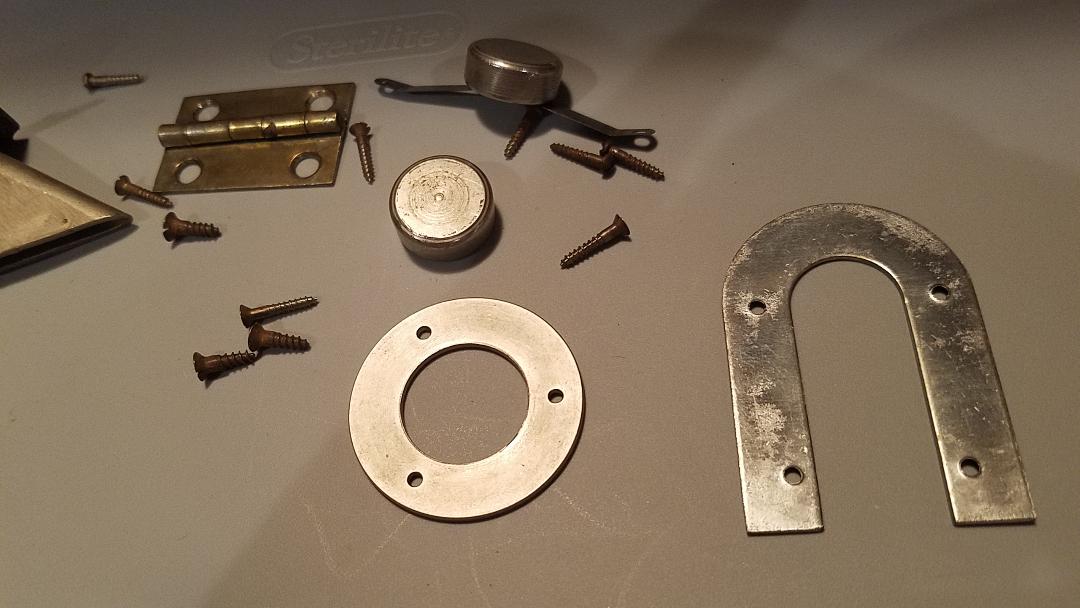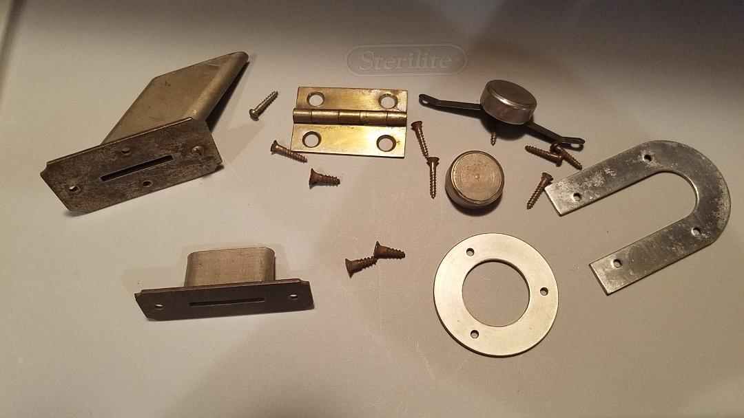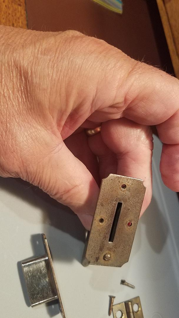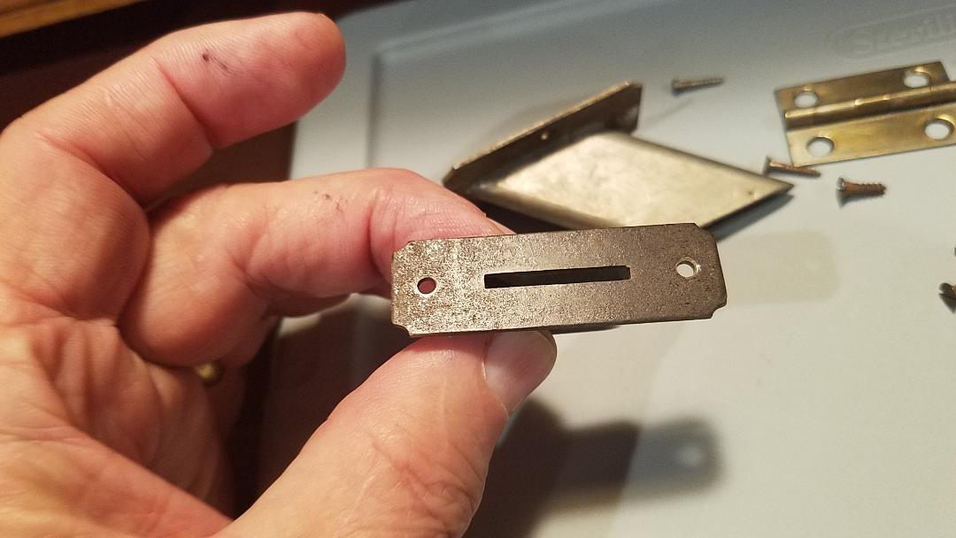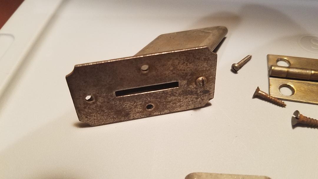Includes some original screws, an original lid hinge and governor weights. The slanted coin escutcheon even retains it's "dummy" screw that was attached at the factory since there would be no wood under that area.