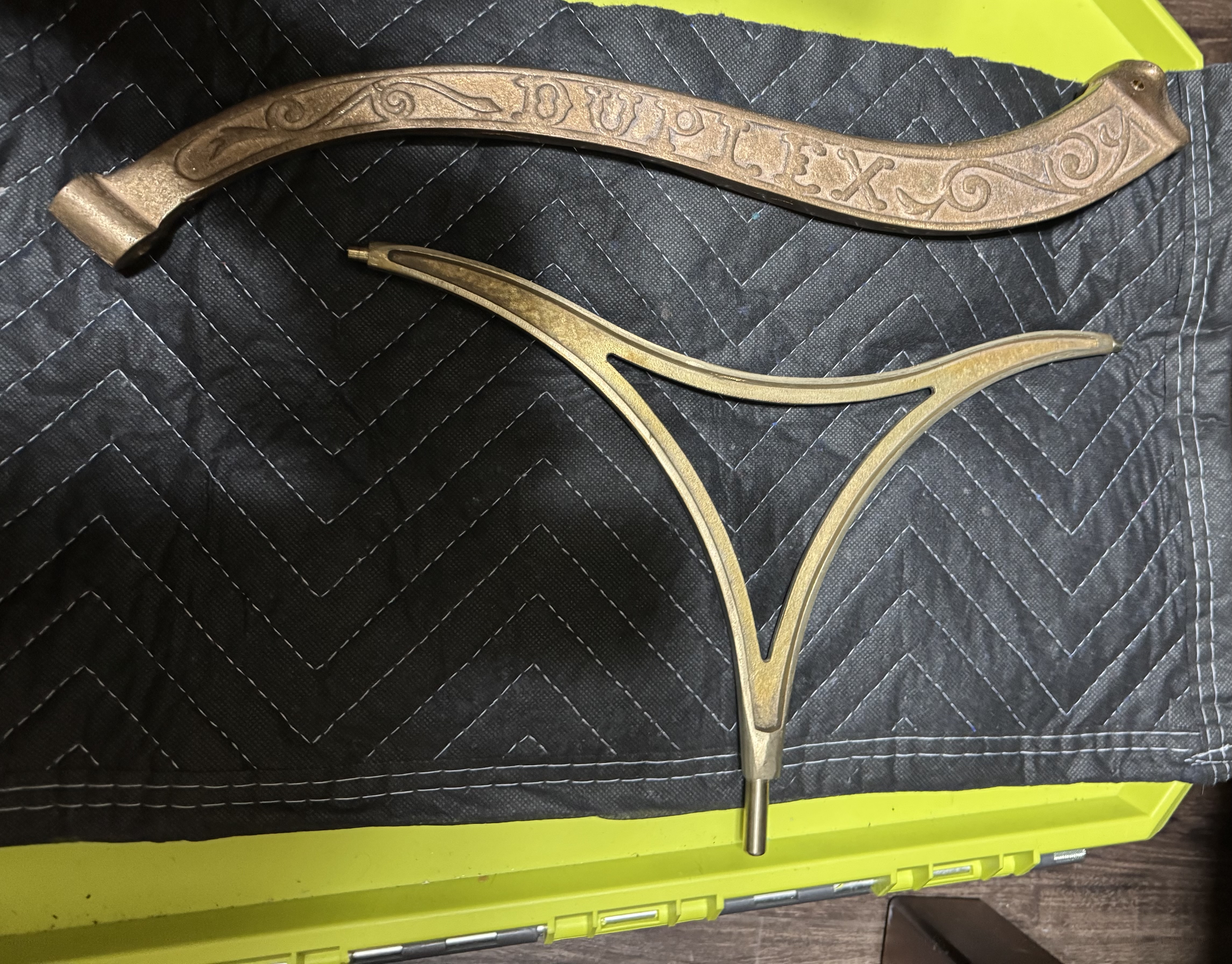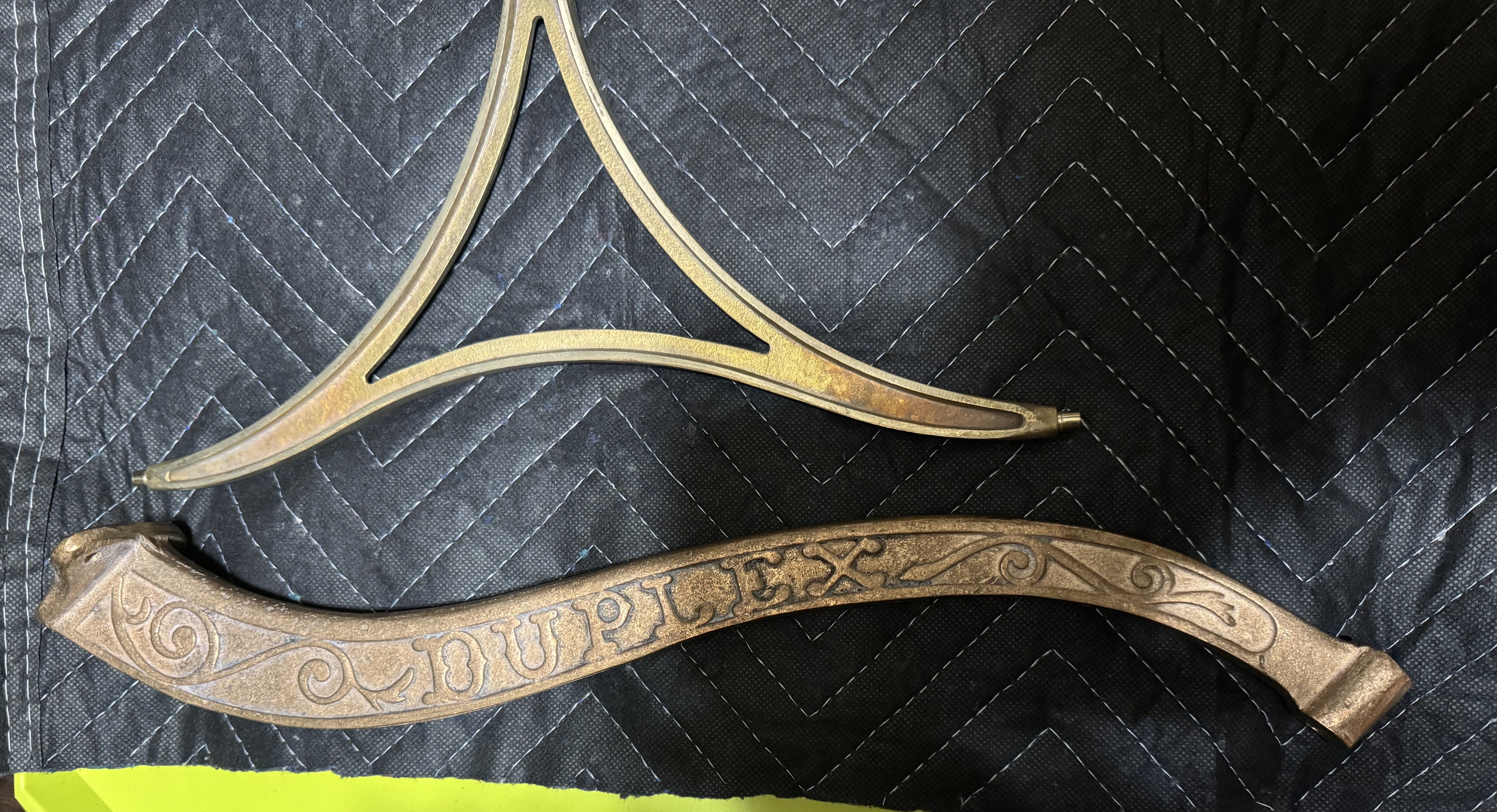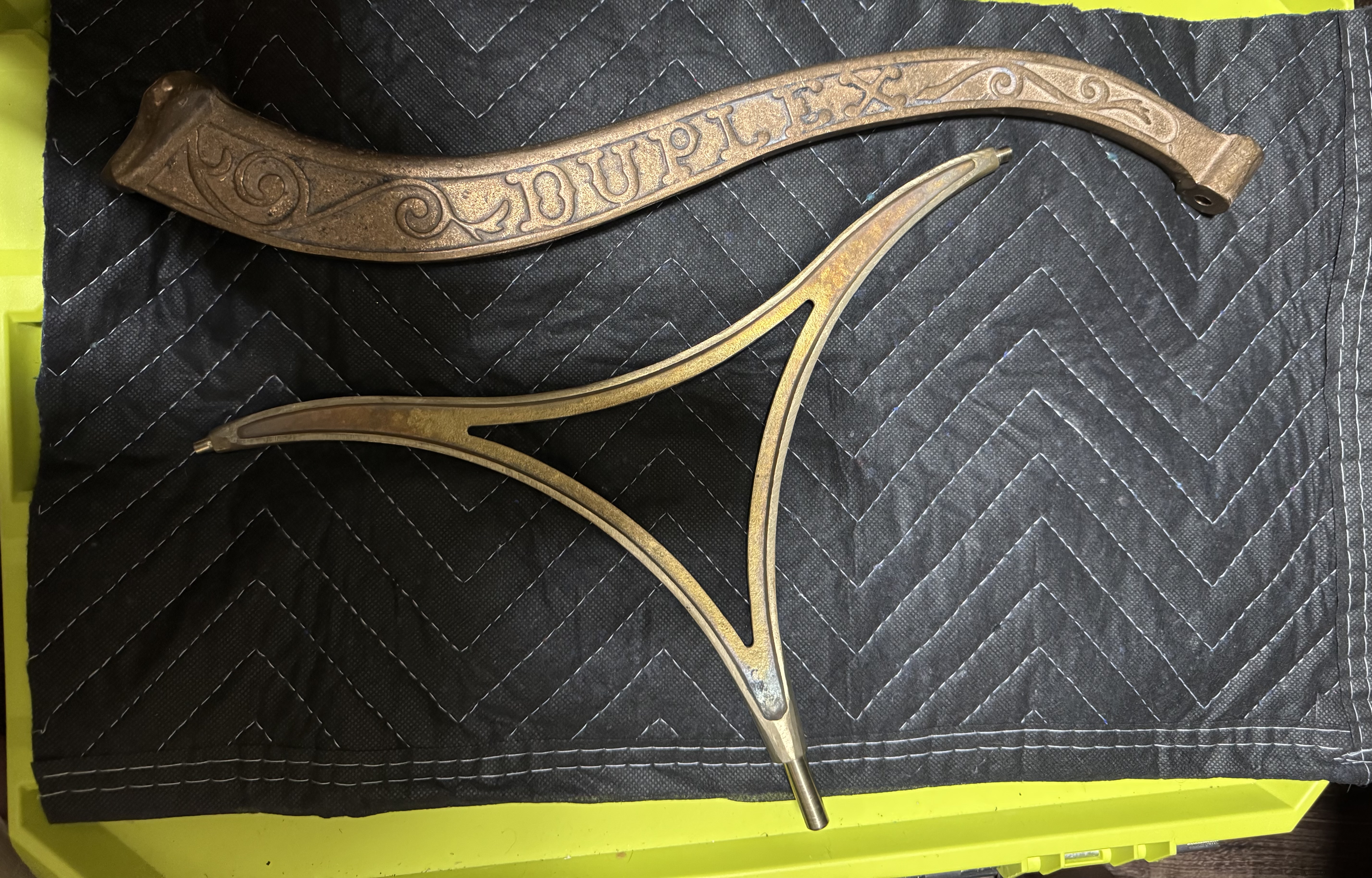 I have a set of reproduction hardware for a Kalamazoo Duplex Phonograph. I have the arm and yoke. The yoke has the two eye swivels for the horns to hang from…you will need the screws that screw in the end to hold them. These are unplated and will need plating. Very hard to find items as they have not been made or reproduced in quite some time…Ask any questions…Asking $375 plus shipping.. may have some other Duplex parts if anything is needed…..