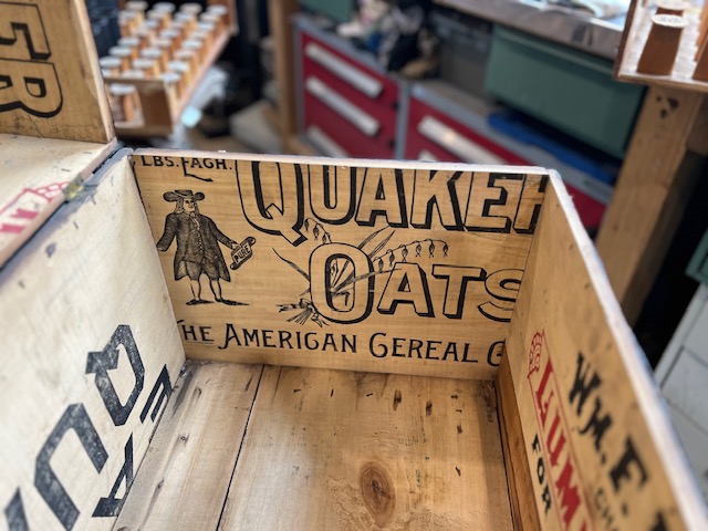 A little while ago I posted about purchasing a large amount of brown wax records. It turns out that 42 of them are blanks. There were many other ones in the box including three 3" brown wax records. I am posting pictures of the home made box that they all came in. Someone was very handy re-using a crate from Quaker Oats. I know there are a few sleuths among us that might be able to determine an approximate age of the wood panels used to make the crate. The box and all of the records and most of the parts that came in this purchase will be available at the Midwest Music Expo coming up in a couple of weeks.