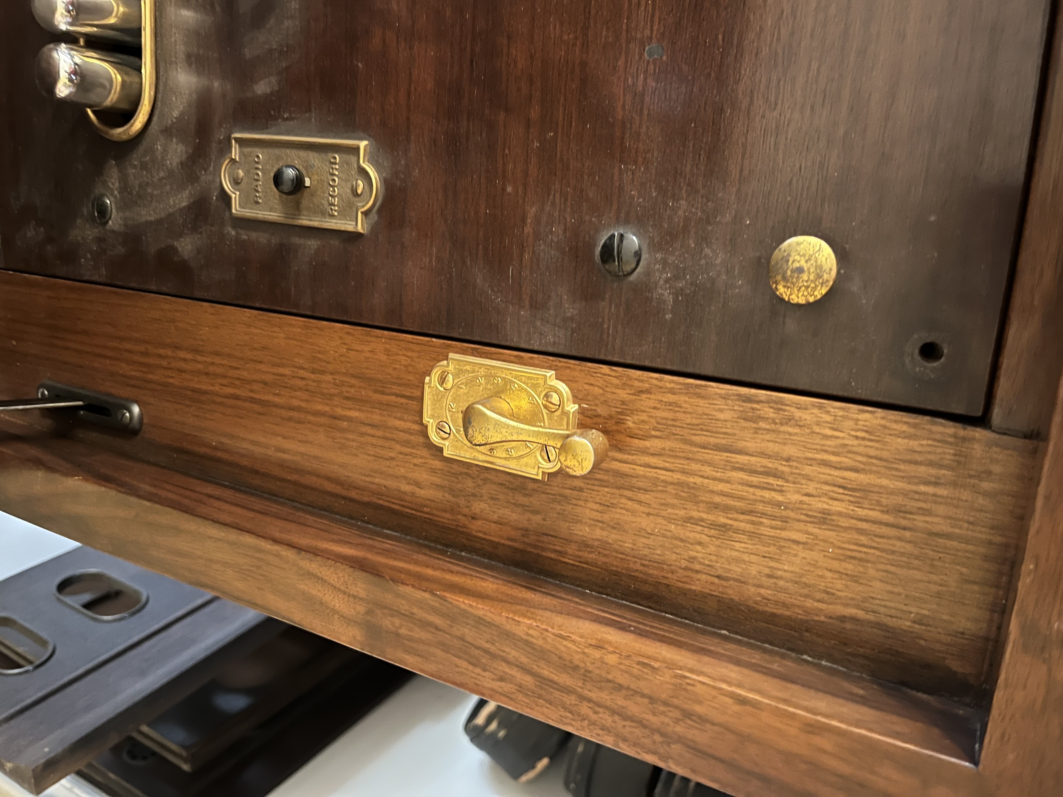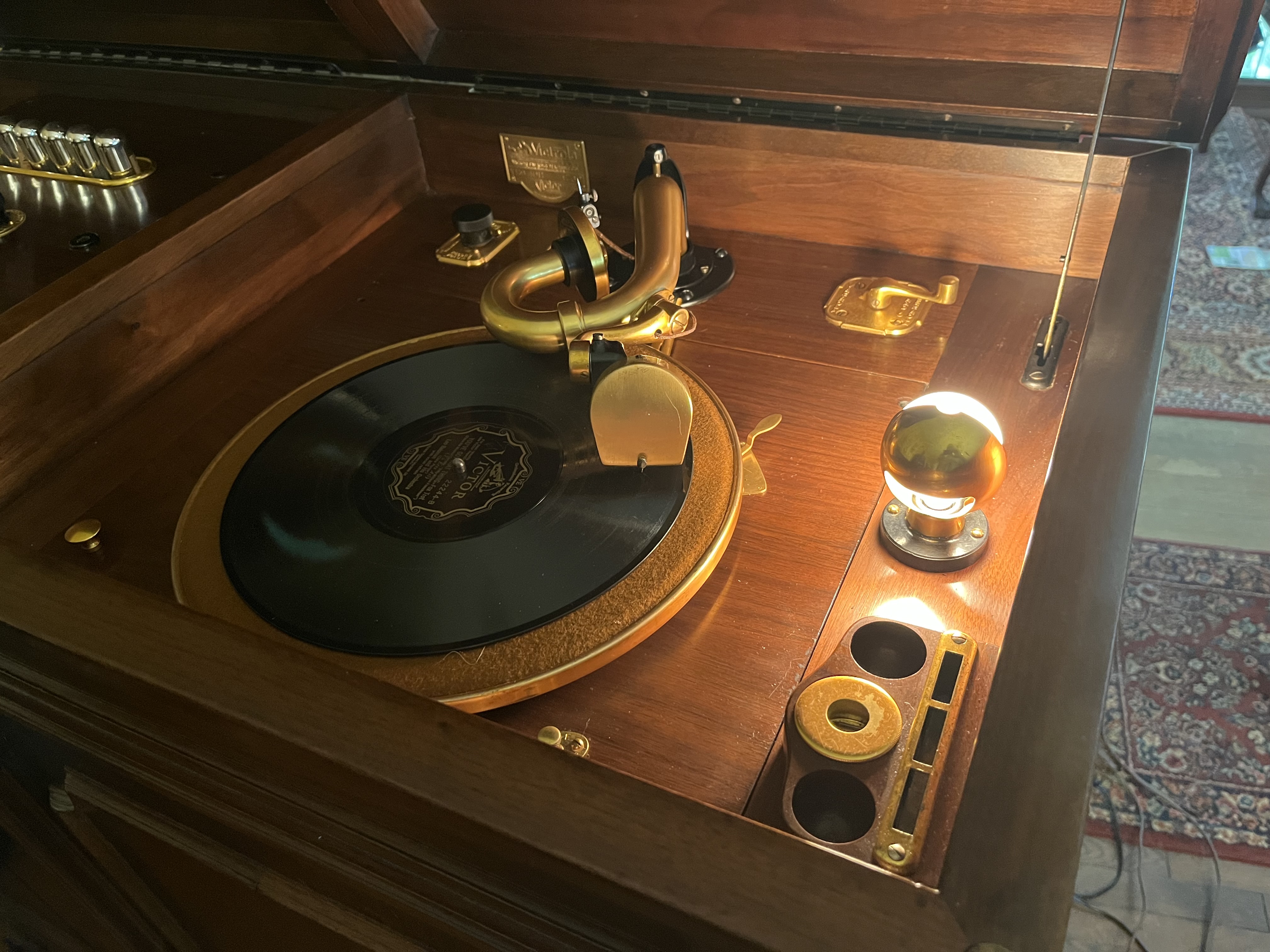 The right hand side contains a Credenza horn and a valve to direct the sound from the Orthophonic soundbox or the electric pickup to the horn.
