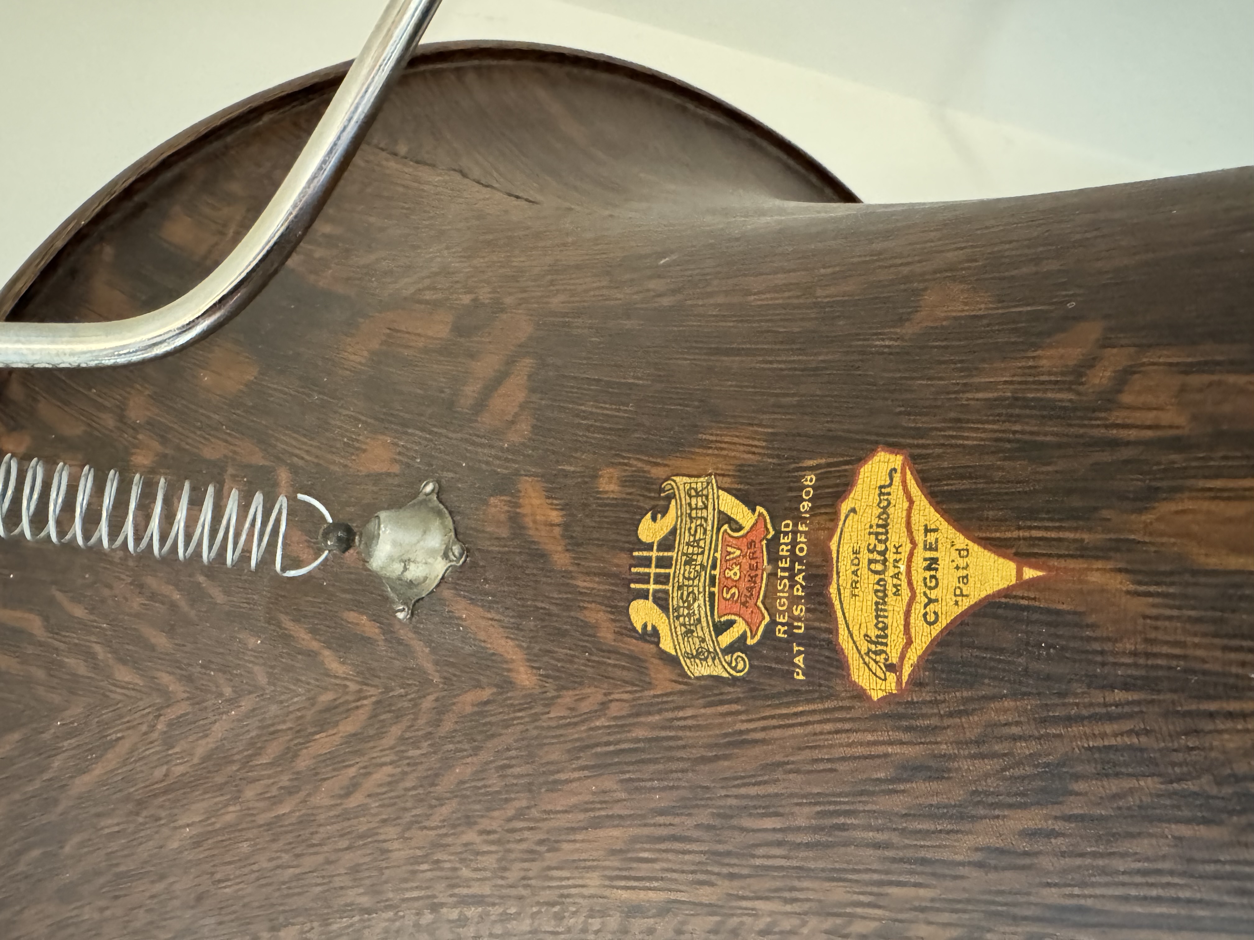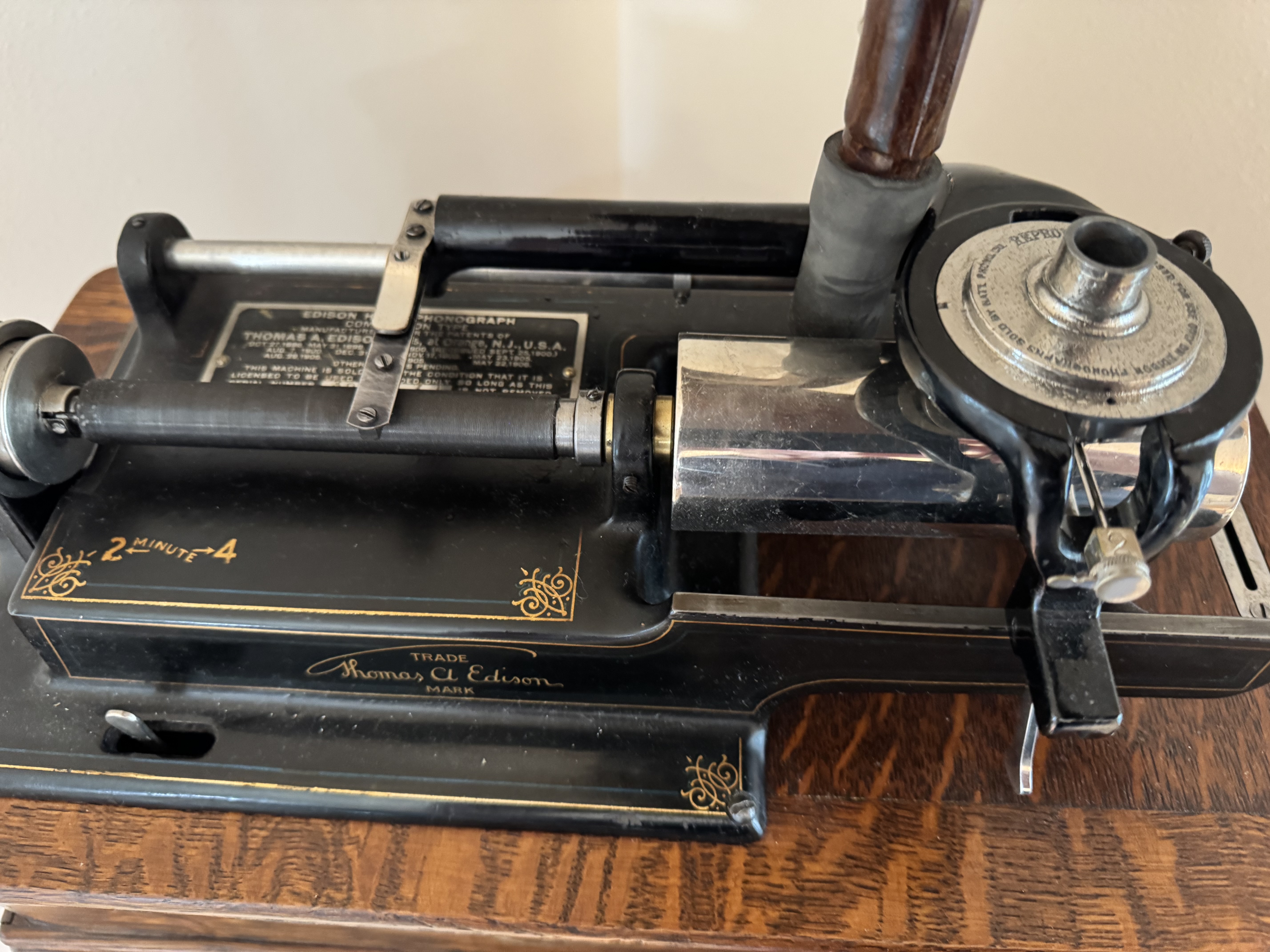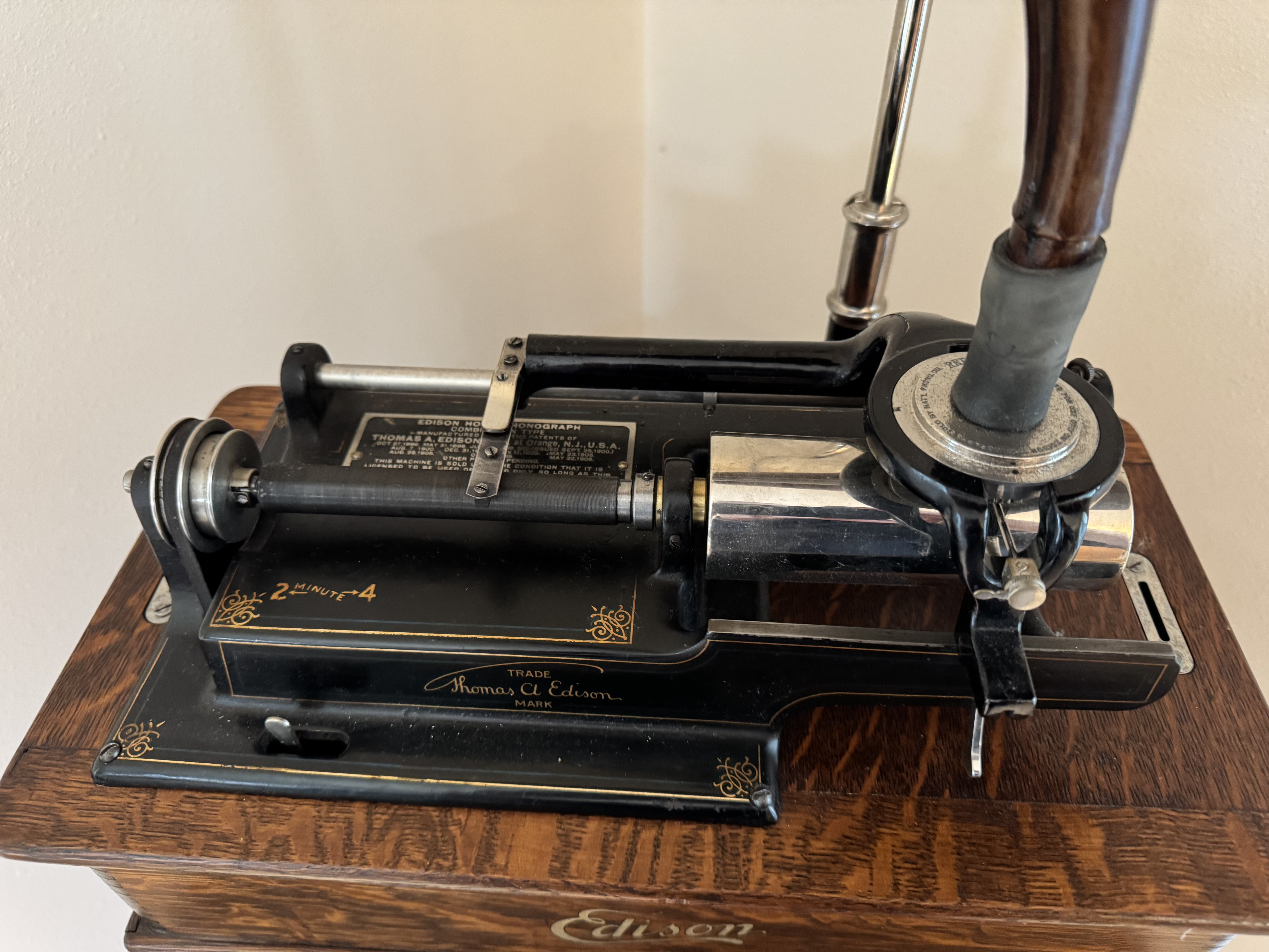 Edison Home Model E, with oak cygnet. Case expertly redone with Gregg Kline decal & wood grained horn elbow. Steve Medved rebuilt Model O reproducer sounds excellent, repaired crack in horn visible in the pictures. Can be delivered to Schaumberg free of charge. PM or email if interested.