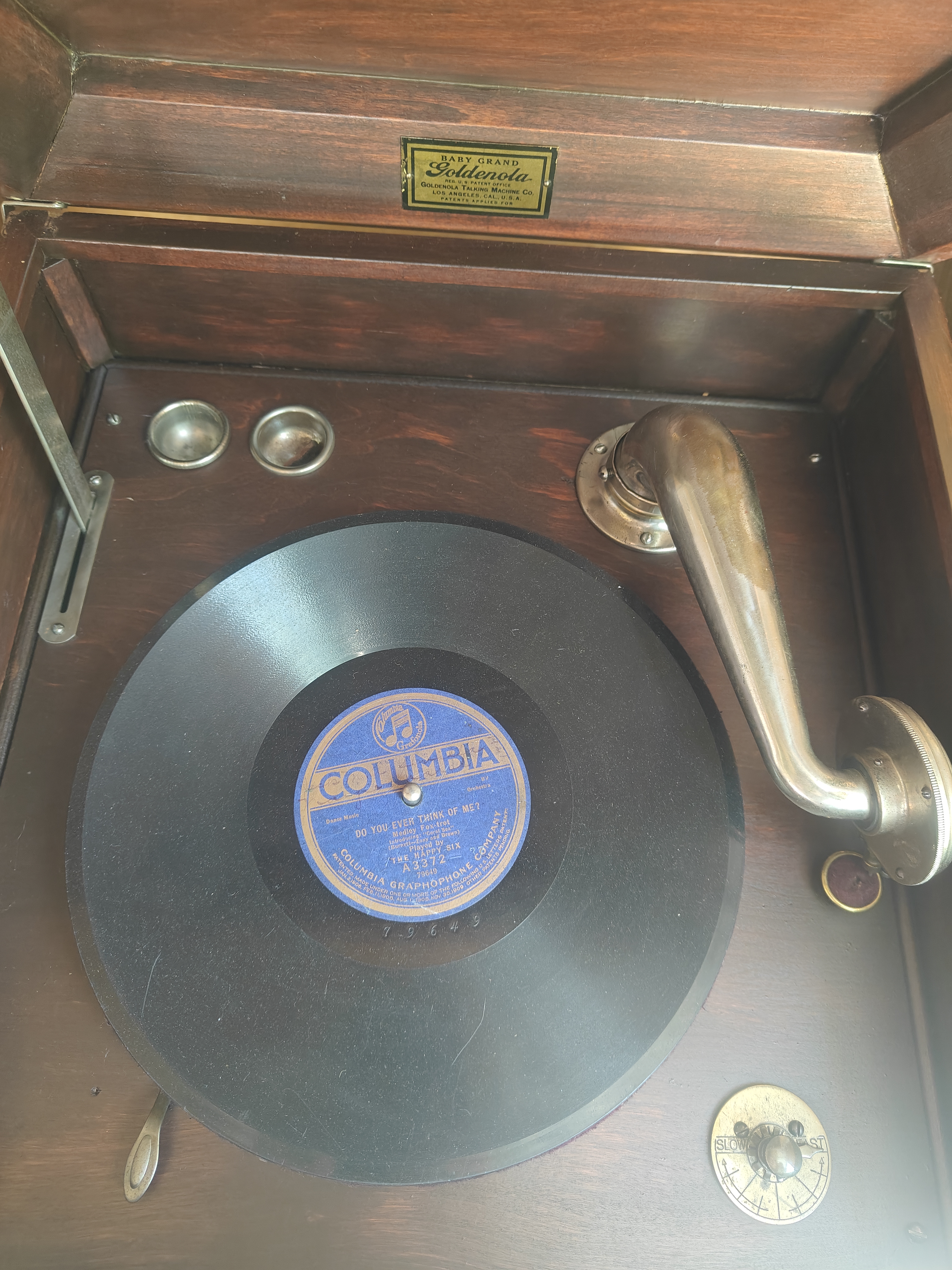 Now, with all that out of the way, your machine appears to be solidly built and in decent condition. Its true value probably will be in the fun you'll have playing records on it. If it came from a collector's estate, these two matters may already have been resolved, but check whether a couple of routine maintenance items are in order before you do: first, the motor should be cleaned and lubricated. Second, the reproducer (the round box on the end of the tonearm with the needle screwed to it) will need new gaskets around the mica diaphragm if they haven't already been replaced. When you do go to play records on it, remember that it's for shellac 78s only, no vinyl records at any speed. Use a fresh steel needle for each play; reusing a needle will damage records. Your machine will be best with records before the introduction of electric recording in 1925; a little online research will show you what were common label designs of that era. As a beginning rule of thumb: World War I era and before, yes; Depression (big band) and World War II era, no. You certainly *can* play the later records on this machine, but chances are it won't do especially well with them.