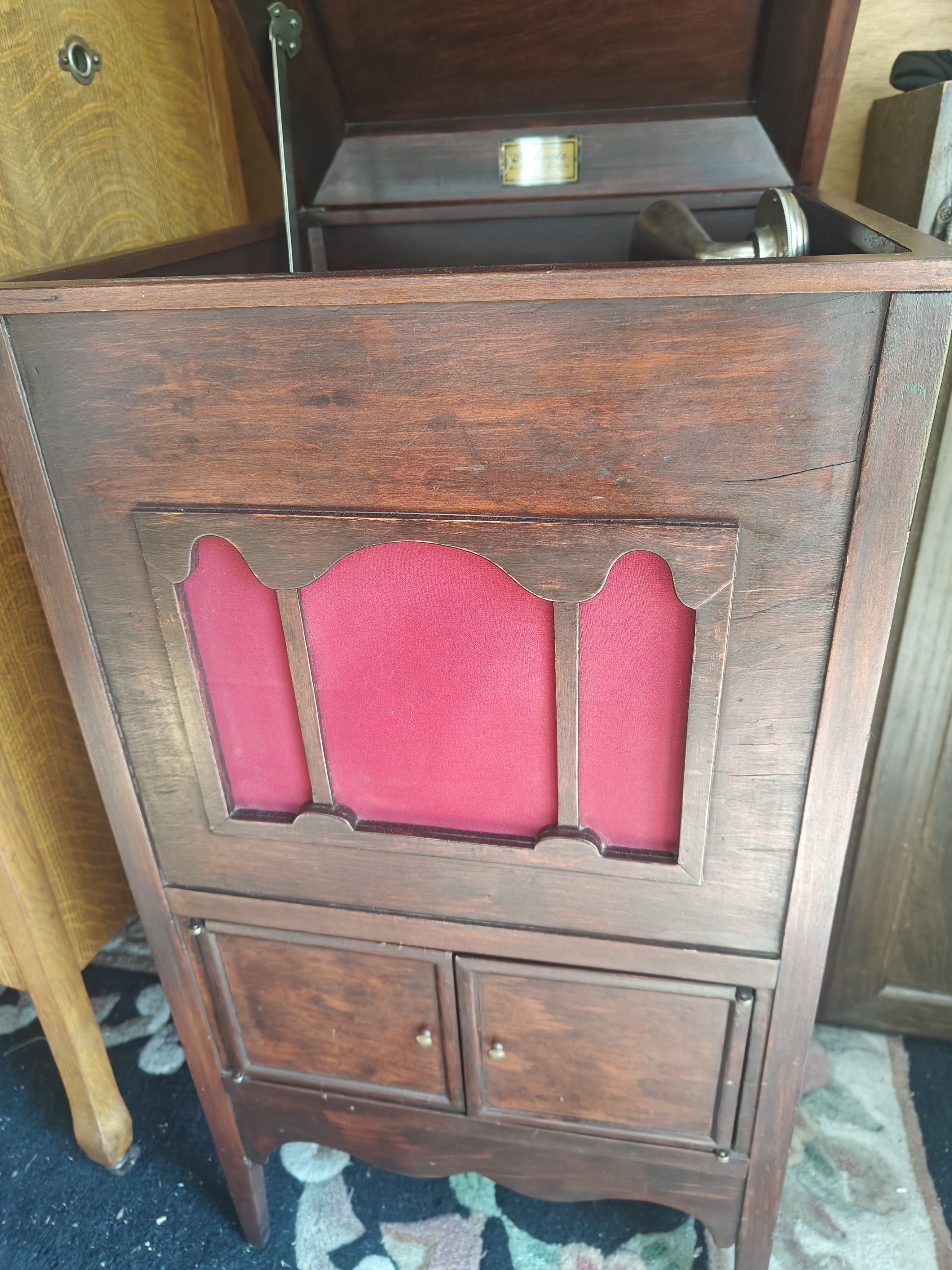 I can't tell you anything about this particular machine except that it's what's known as an "off brand," something made by some small mfr., maybe even a furniture company that bought generic mechanical parts and made a cabinet for them. Once the pioneer companies' patents ran out, jillions of such outfits jumped into the phonograph market. Most had at most a transitory existence.