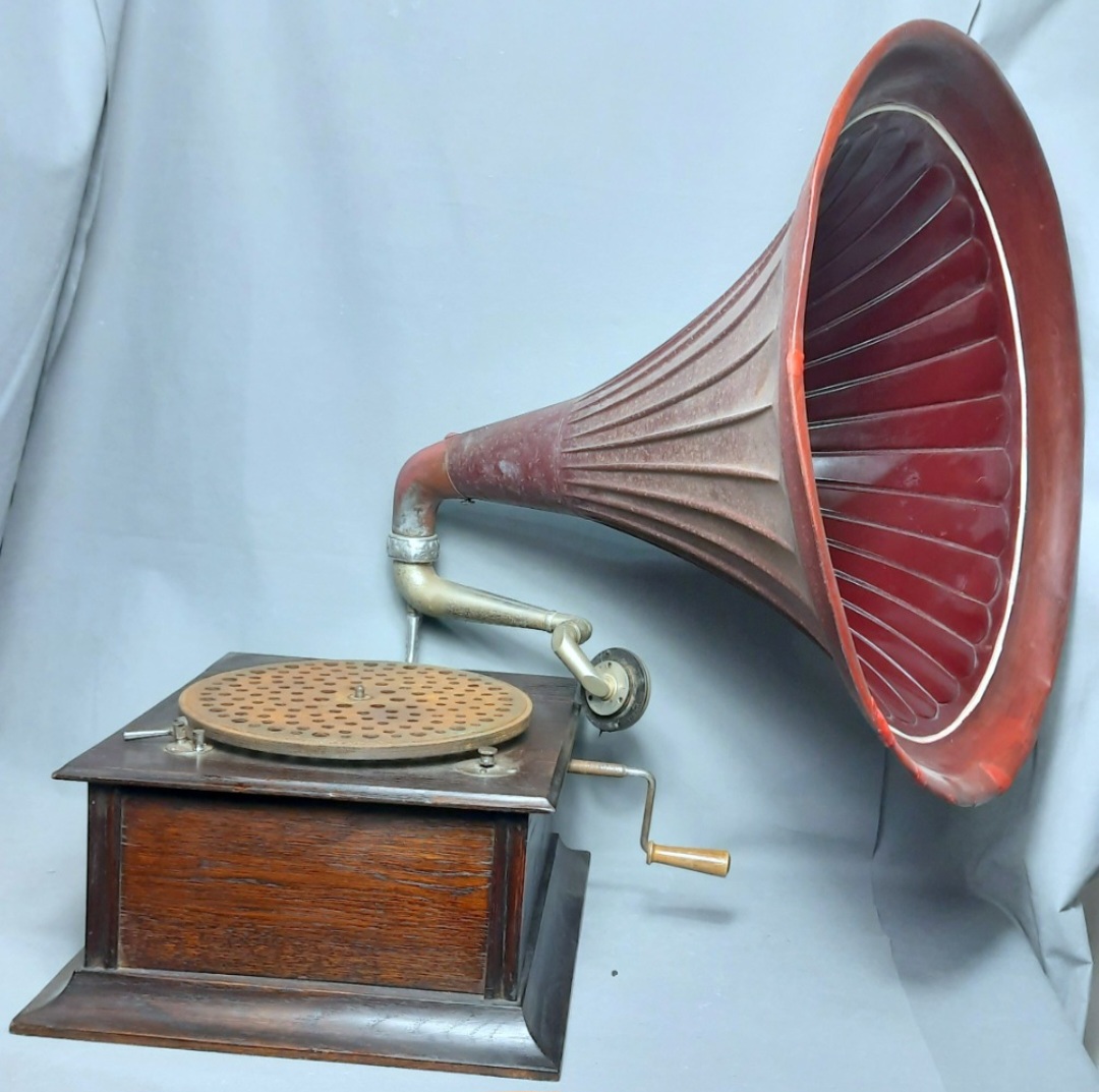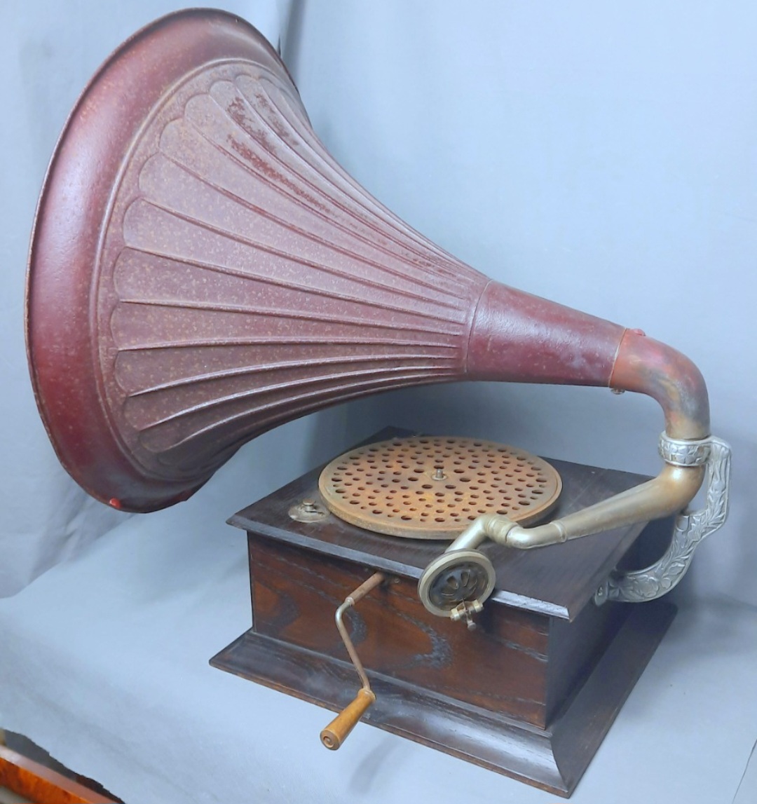 I looked closely at the photos, and noticed that the patina under the front panel didn't quite seem to match the other sides. Also, the glue blocks in front are different from those in back: this may indicate a conversion from a 'hornless' model.Sidewinder wrote: Sun Jul 06, 2025 3:57 am At first glance I thought it was a converted tabletop as one sees here at the 3rs set of pictures - the HMV tabletop conversion
