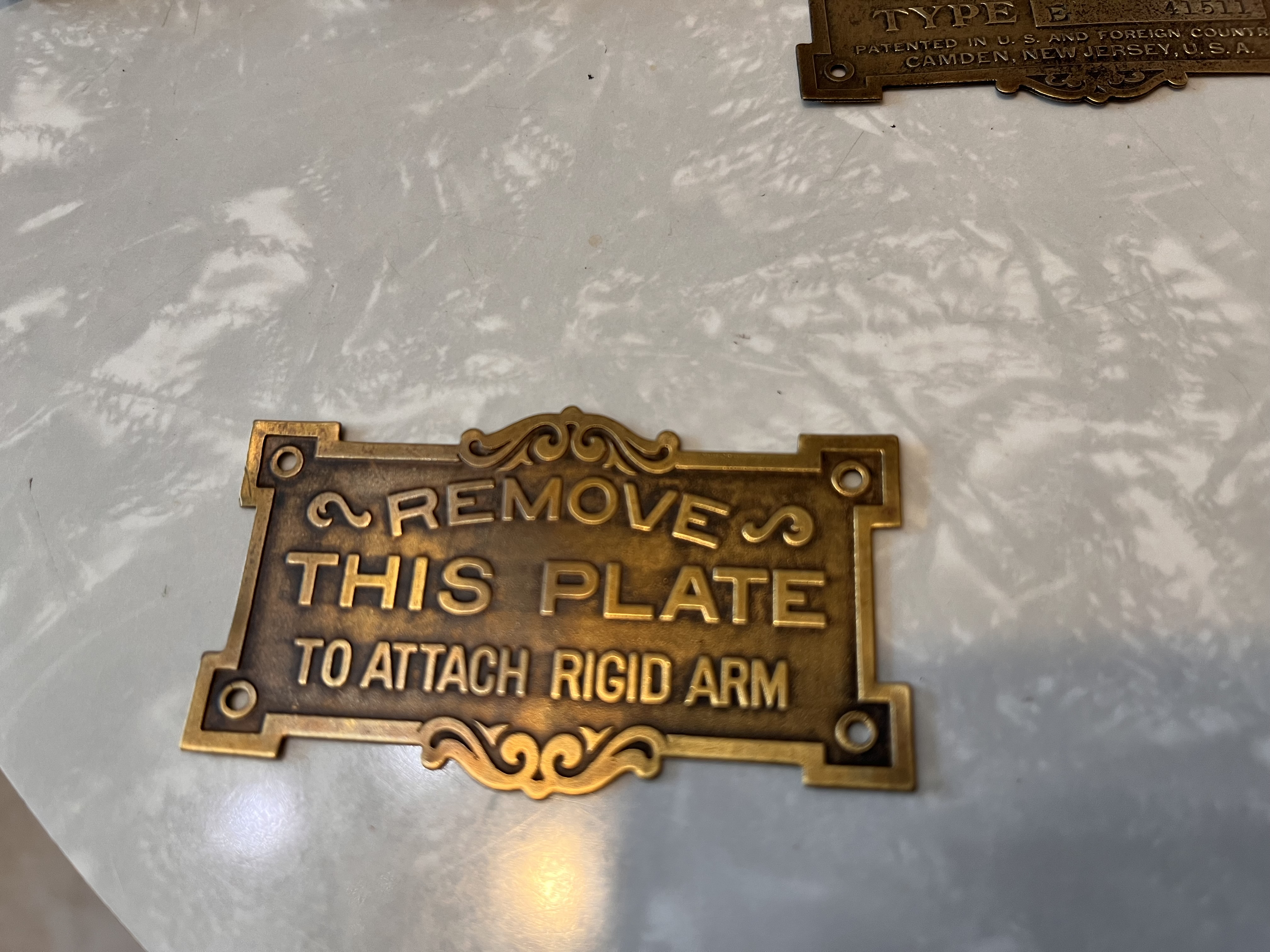 The other plate is from the back of the phonograph. It says “Remove this Plate to attach Rigid Arm. It too is in great shape and is missing the black paint. I want $45 for this plate. SOLD