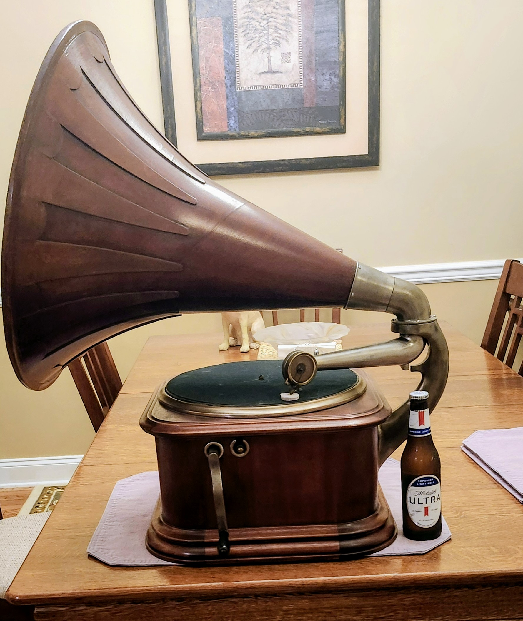 I found a machine last week. Yesterday I did a road trip to pick it up. A Columbia model BD. Which used the same large case and huge 4 spring motor as the Columbia AR. One was front mount the other a rear mount horn. This has a mahogany wood horn, mahogany disc music cabinet, about 80 earlier one sided Columbia records. After 8 hours on the road I placed it on the dining room table and called it a day. It works well, but probably needs some oil here and there. Quick photos from last night.