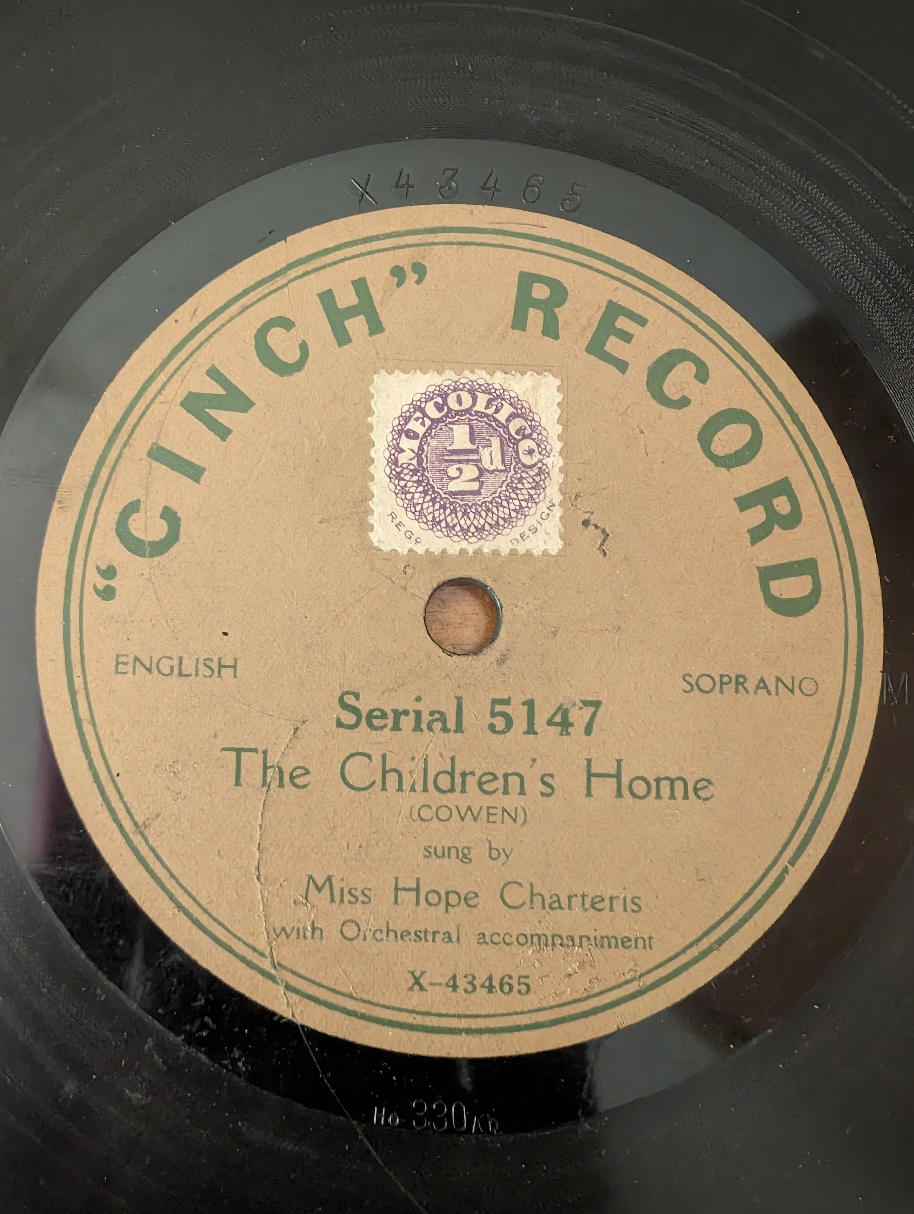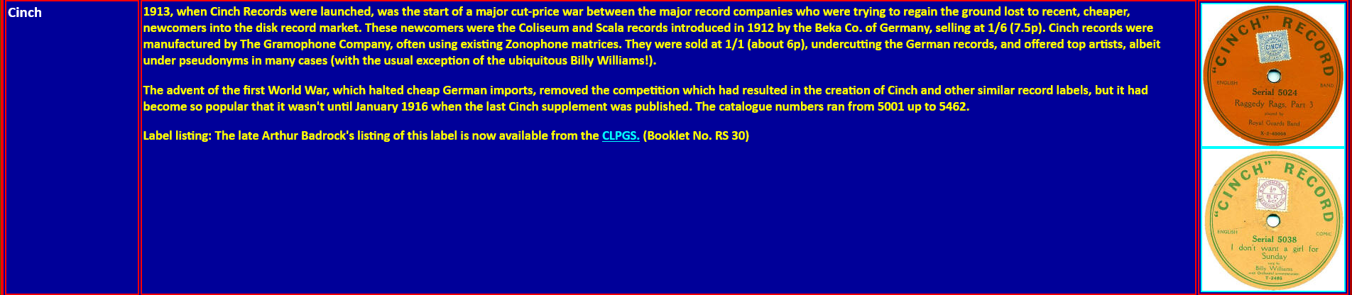 It has been suggested that the Cinch label was anonymous because The Gramophone Company did not want their name to appear on such a low priced product. They were not alone. Columbia's lowest priced label, the Phoenix, made no mention of their name either.