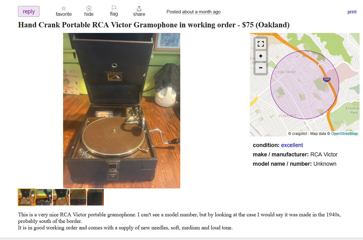 About a three weeks ago, I spotted an ad for this one on Craigslist-SF, coincidentally in Oakland, but for $75.00.